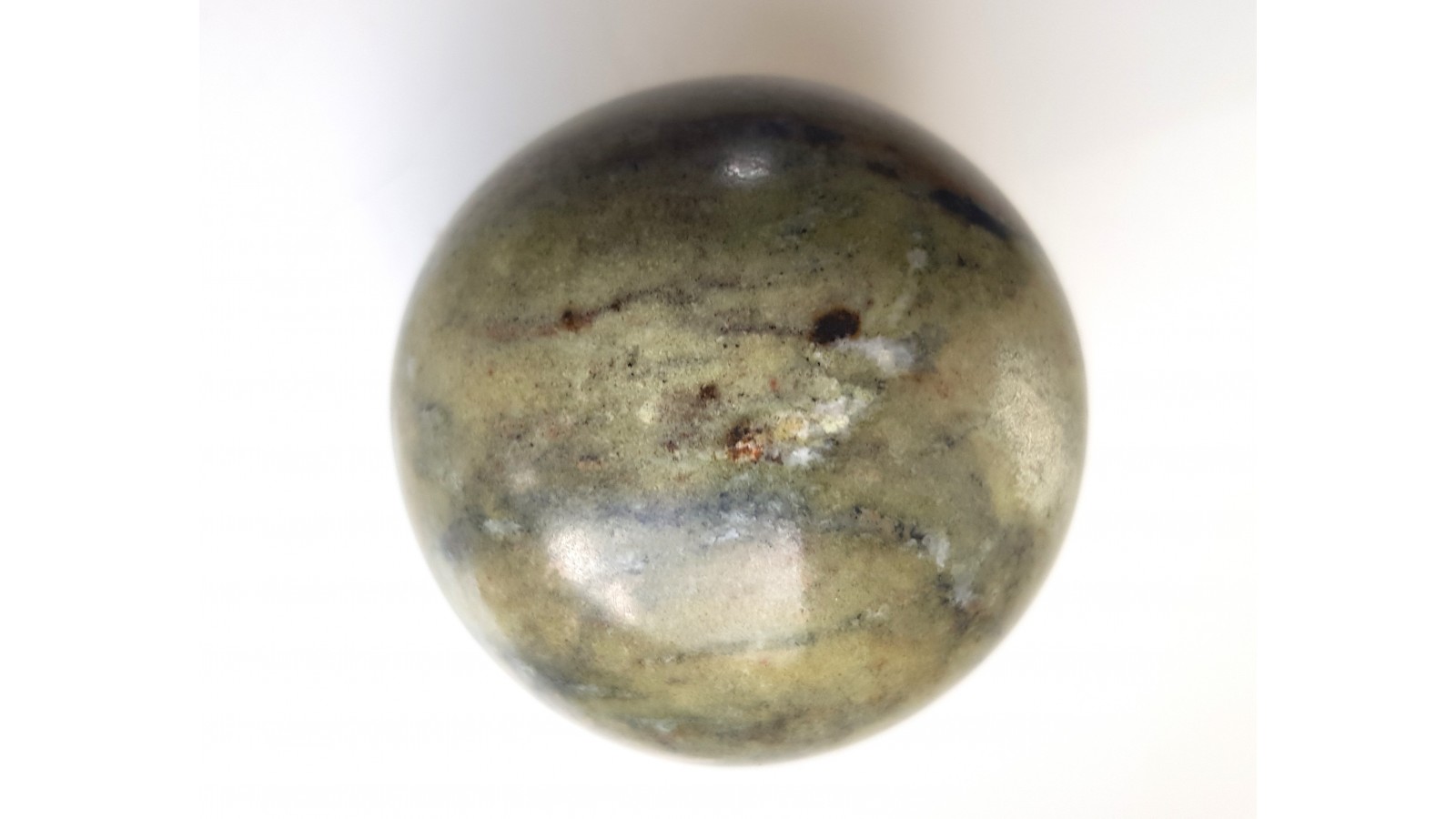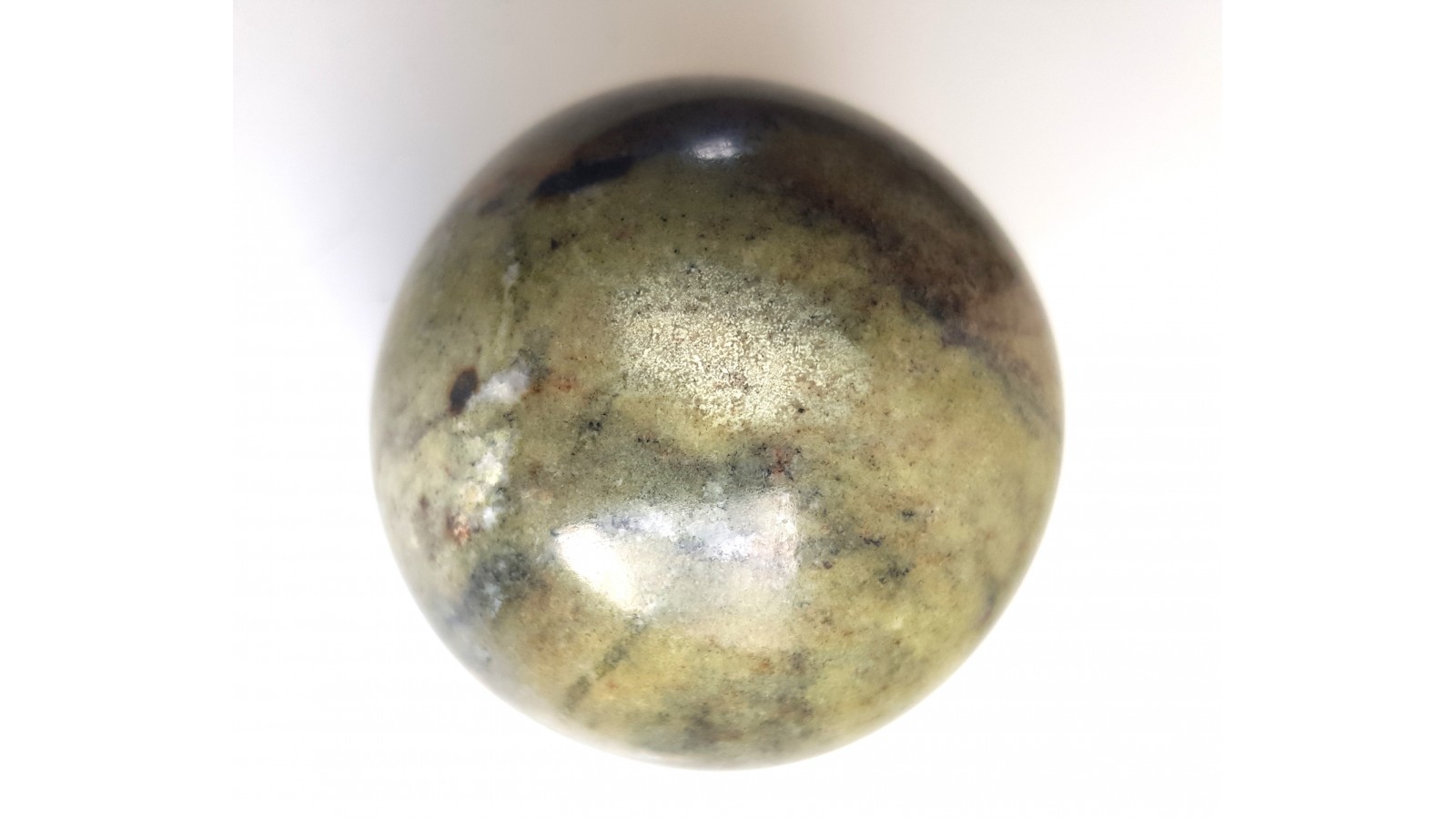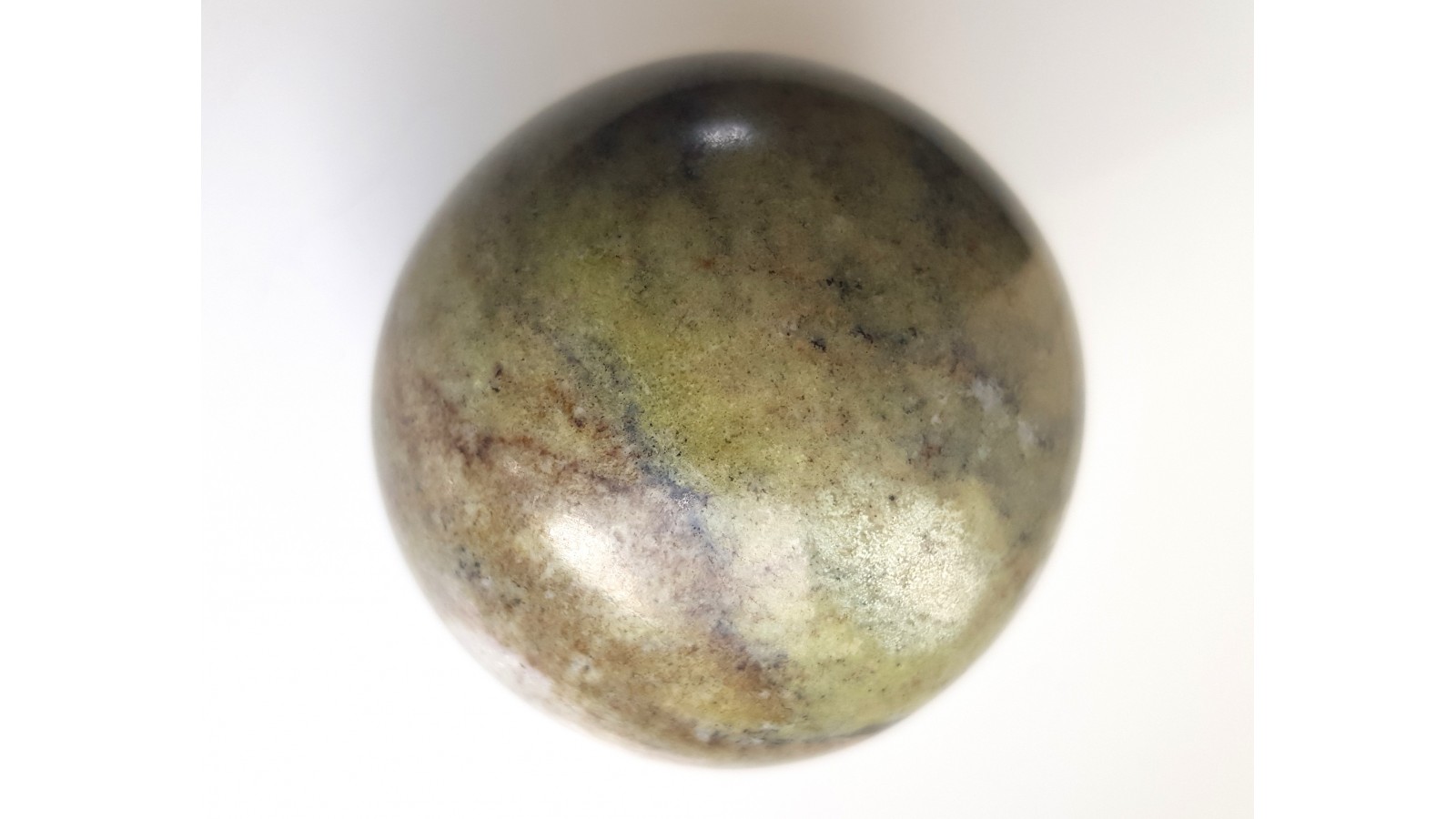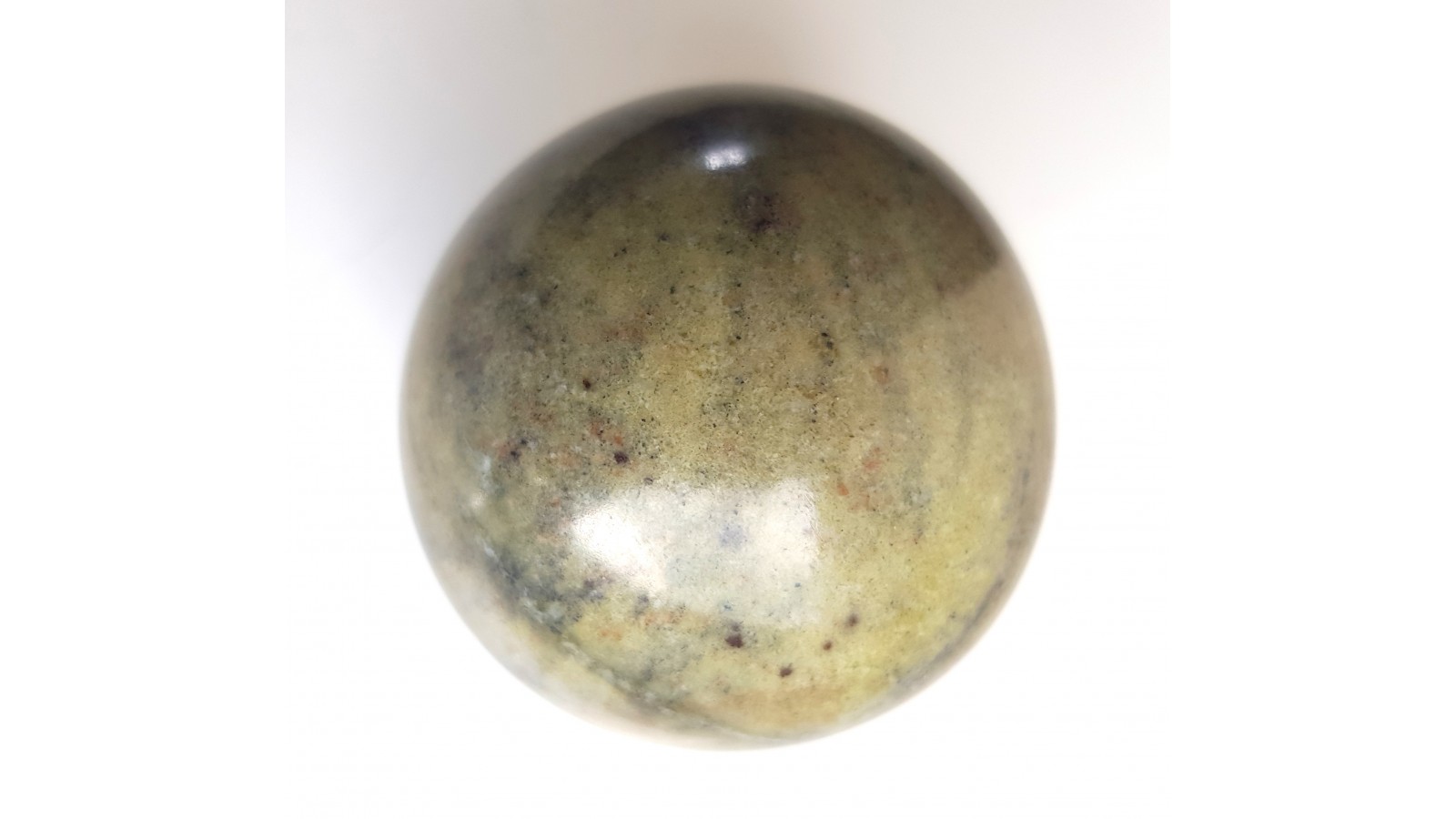 Zielona kula bez istotnych spękań z ofikalcytu z Gromnika k. Strzelina. Ofikalcyt jest zmienionym kontaktowo marmurem dolomitowym, w którym pod wpływem metasomatozy krzemionkowej utworzyły się minerały z grupy serpentynu, skąd barwa skały. Rzadki materiał. Kula bez spękań. Polecam.
