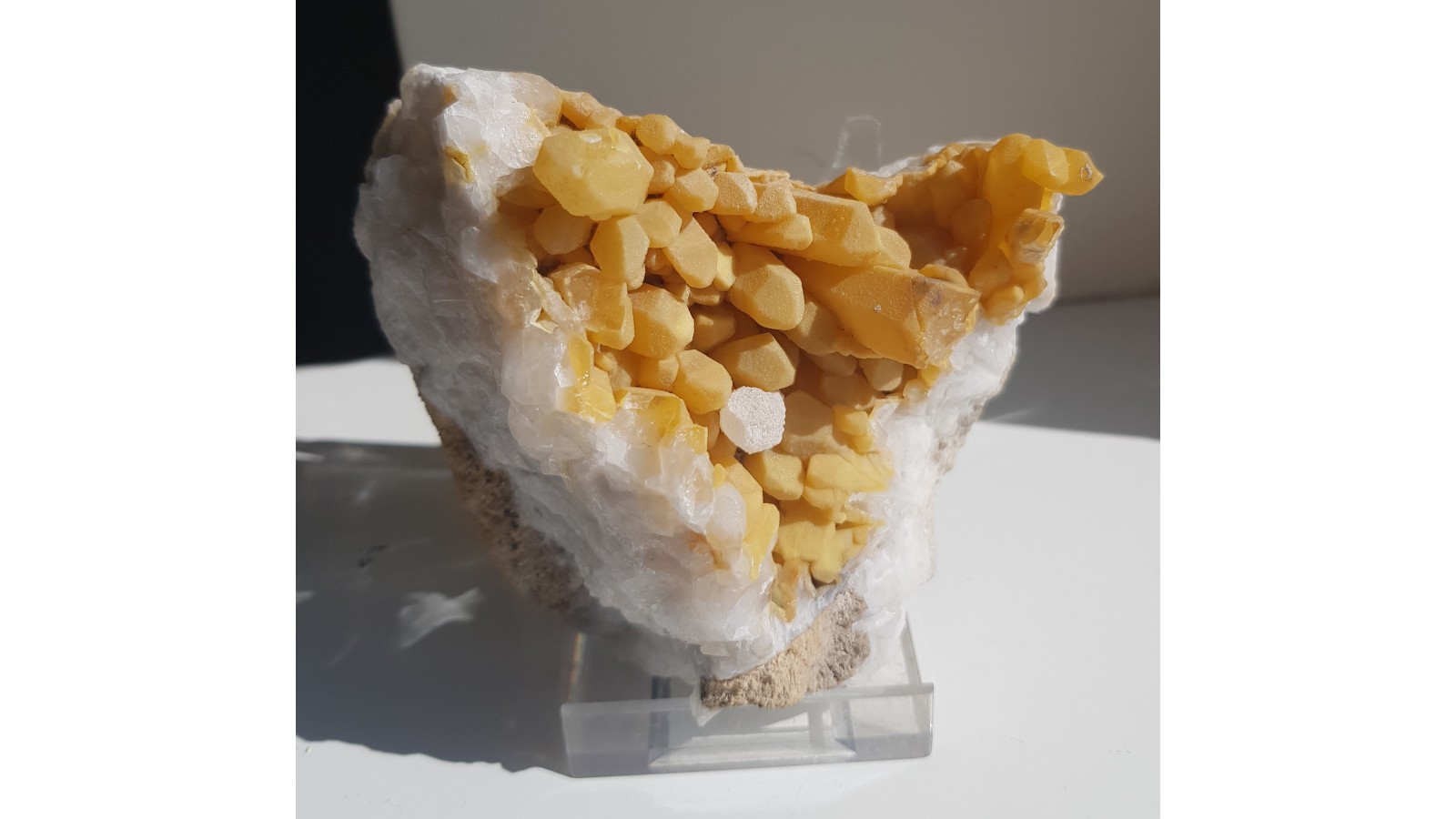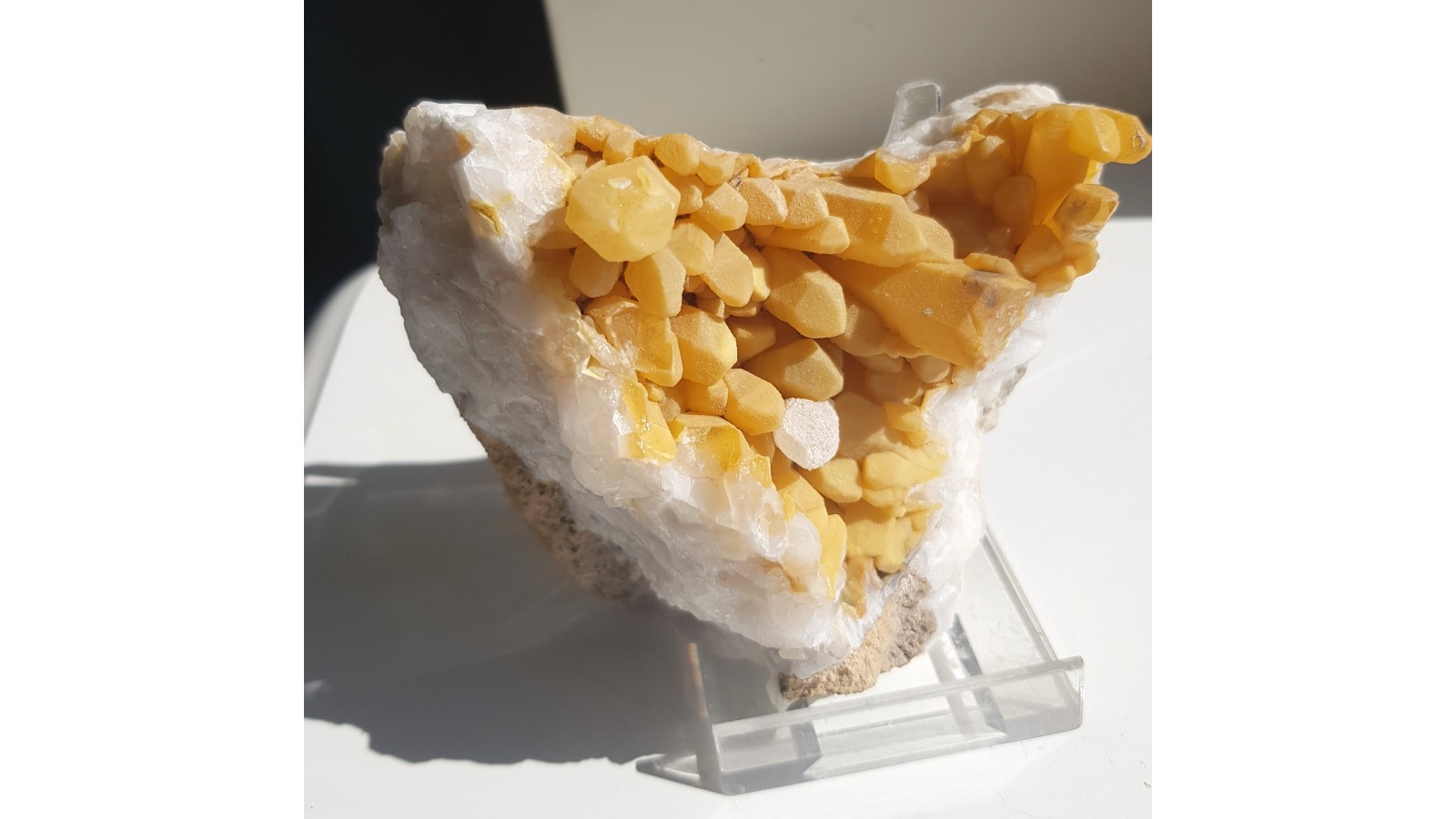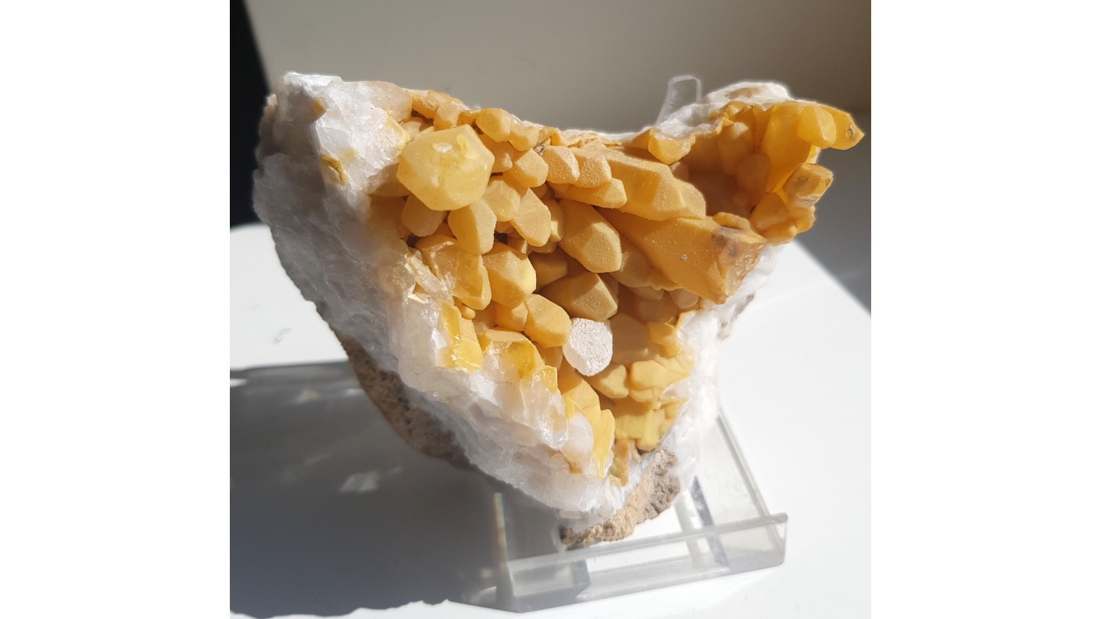 Niezwykła szczotka kryształów górskich ze Sławniowic. Żółte zabarwienie nie jest wynikiem powierzchniowego zażelazienia okazu, lecz efektem pokrycia kwarcu przez żółtawy chalcedon. Okaz sprzed wielu lat. Szczotka cała, nieuszkodzona. Całość wyjątkowo atrakcyjna wizualnie i bardzo zgrabna. Polecam.
