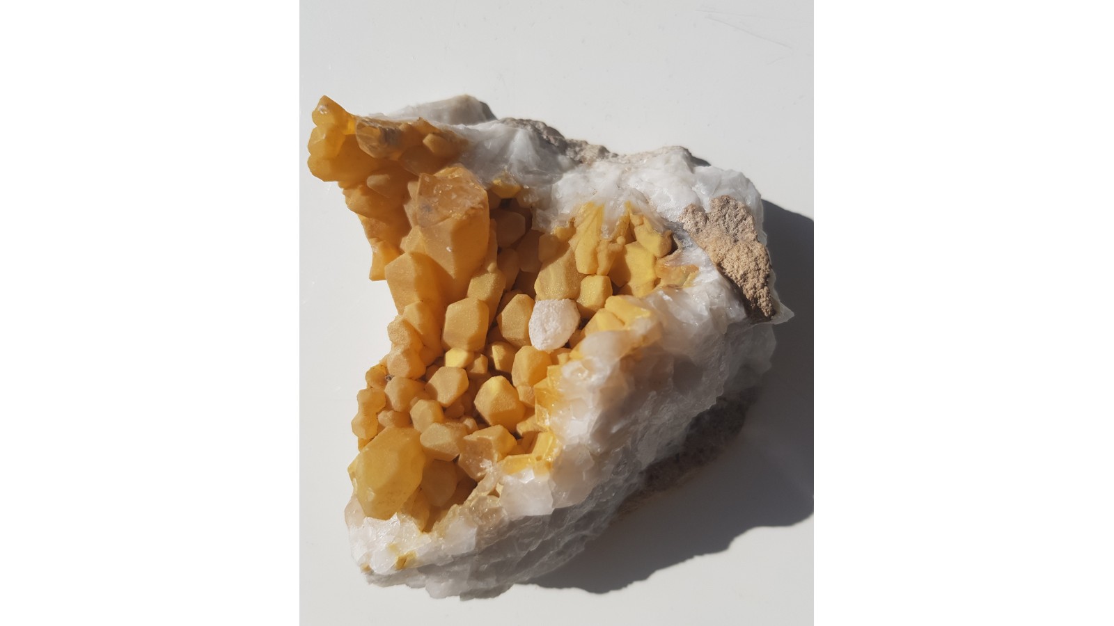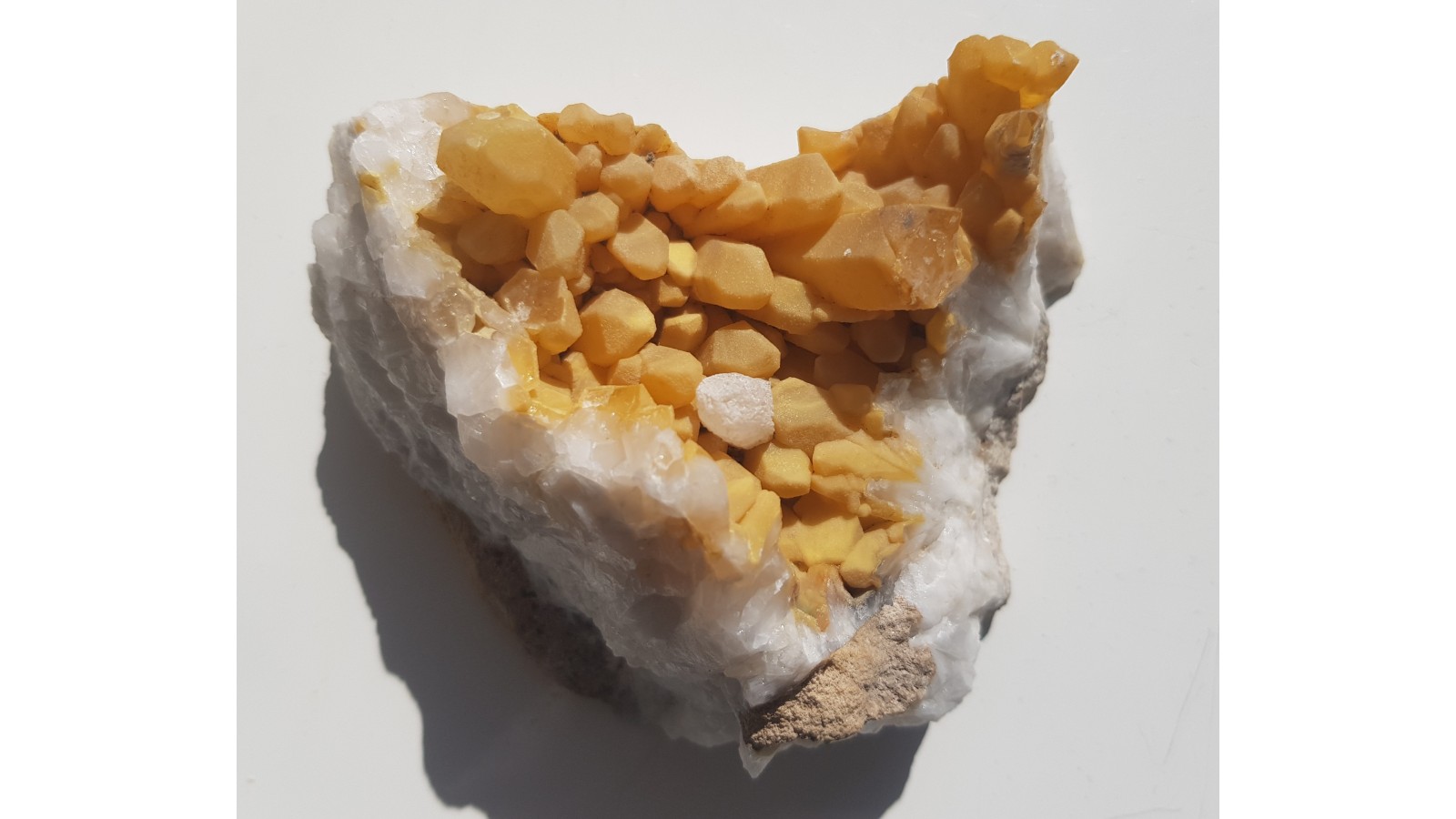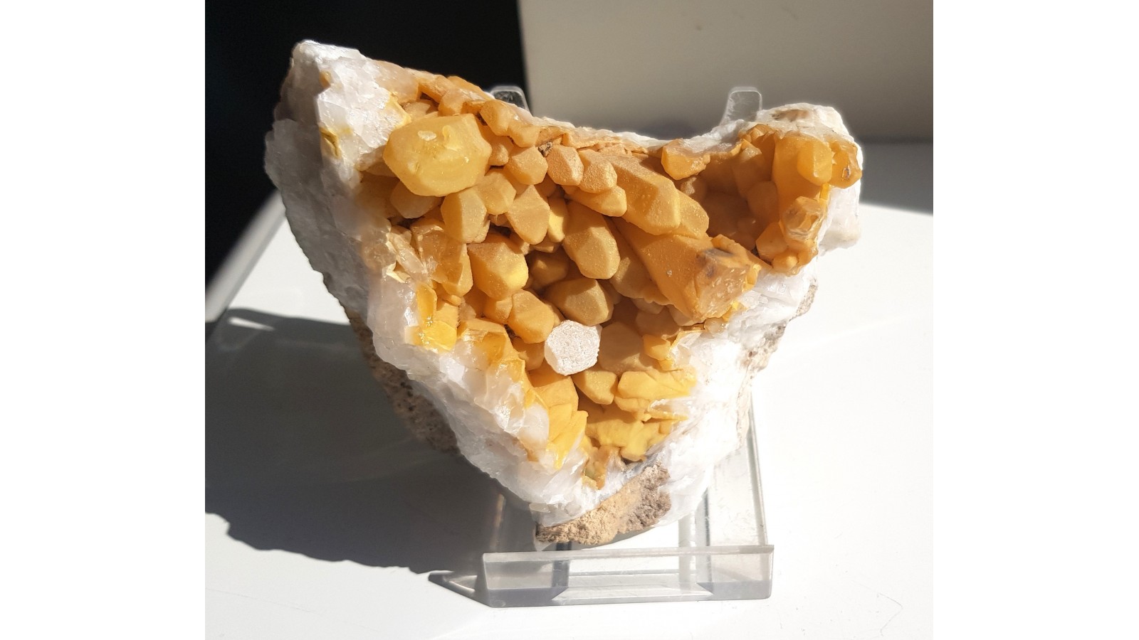 Niezwykła szczotka kryształów górskich ze Sławniowic. Żółte zabarwienie nie jest wynikiem powierzchniowego zażelazienia okazu, lecz efektem pokrycia kwarcu przez żółtawy chalcedon. Okaz sprzed wielu lat. Szczotka cała, nieuszkodzona. Całość wyjątkowo atrakcyjna wizualnie i bardzo zgrabna. Polecam.