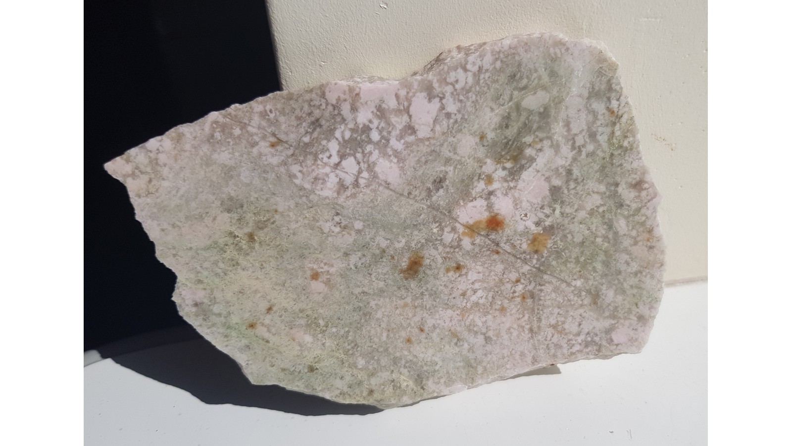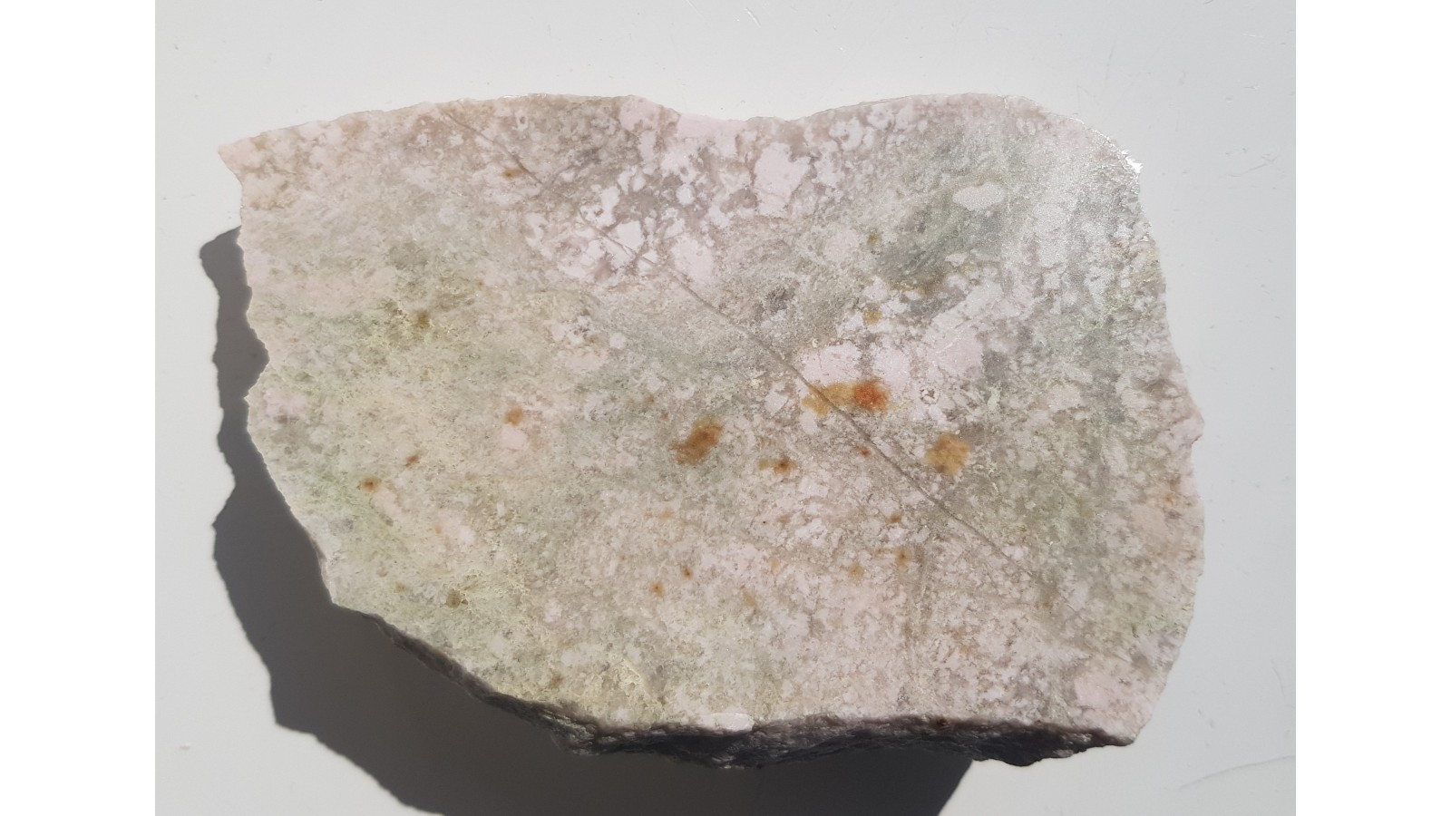 Okaz skały kwarcowo-zoisytowej z Jordanowa Śląskiego, w której wrostki zoisytu mają różową barwę (thulit). Thulit na tle kwarcowym. Masywna, niezwietrzała, świeża skała. Okaz polerowany. Idealny poler. Strona przeciwna naruralna. Polecam.