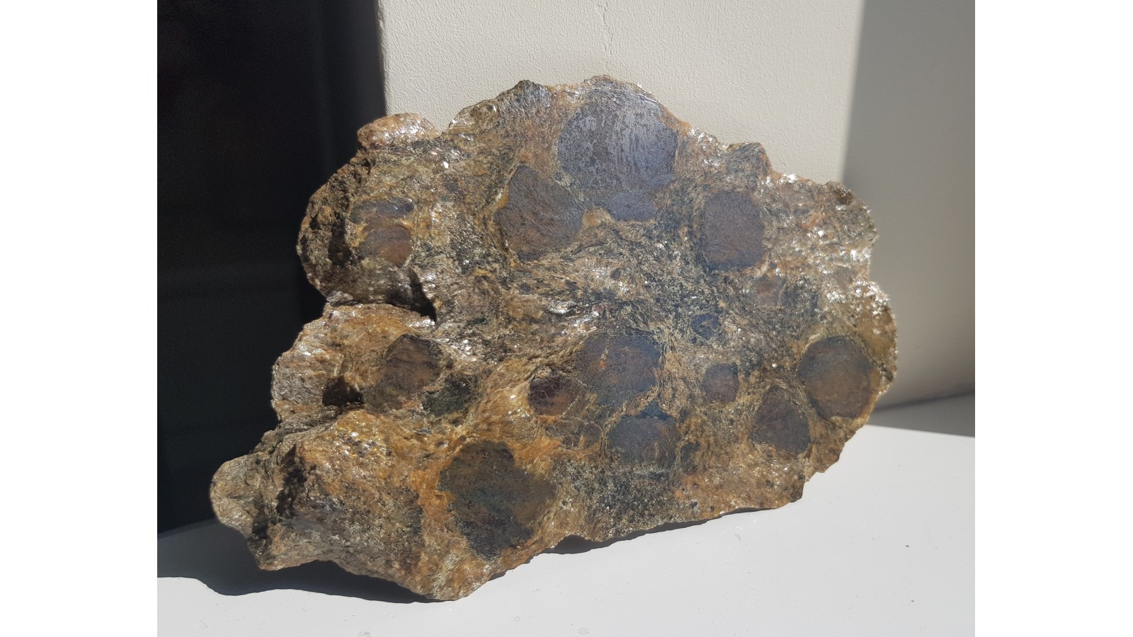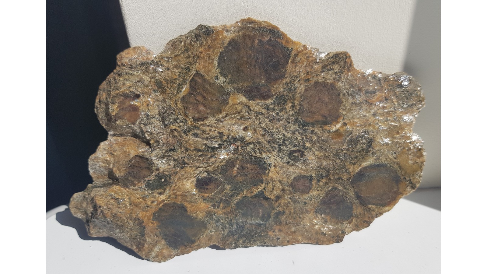 Okaz polerowanego łupku łyszczykowego z dużymi blastami (kryształami) granatów. Granaty widoczne na polerowanym przekroju skału oraz na powierzchni w postaci dużych zgrubień. Granaty ciemnoczerwone. Łupek masywny, piękny poler. Okaz z Kamieńca Ząbkowickiego. Unikatowo duże granaty po około 2 cm średnicy. Polecam.