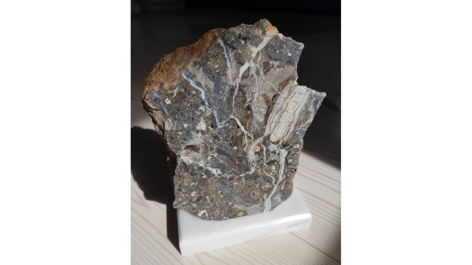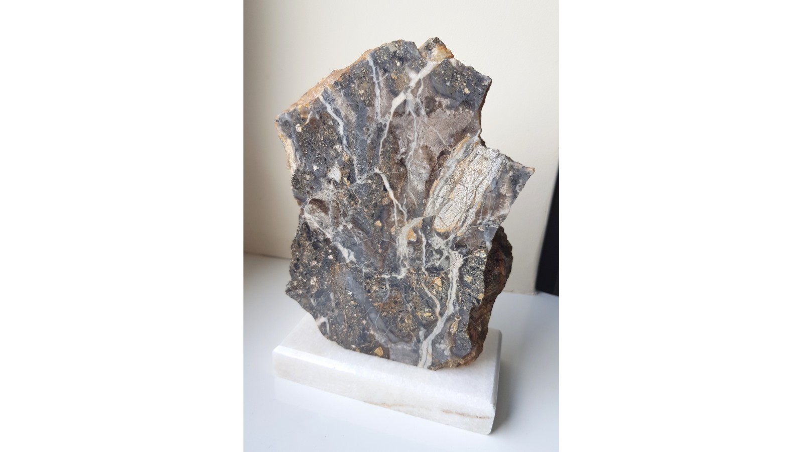 Statuetka wykonana z paleogeńskiego konglomeratu - rudy Au. Skała pochodzi z Ada Tepe w Bułgarii – czynnej kopalnia złota we wschodnich Rodopach oraz historycznego regionu wydobycia złota. Typ złoża epitermalny, związany z wulkanizmem stref subdukcji o chemizmie andezytowym. Należy do pasa ciągnącego się od wschodniej Turcji aż po Rumunię (Baia Mare). Systemy epitermalne cechuje występowanie na niewielkich głębokościach do 2 km wgłąb Ziemi, przeważnie jednak do 500 m wgłąb. Temperatura mineralizacji to ok. 200-250 st. C. Roztwory o takich temperaturach wnikały w położone w pobliżu czy powyżej skały osadowe, w tym przypadku w konglomeraty. Bardzo estetyczna całość. Okaz i marmurowa podstawa polerowane. Polecam.