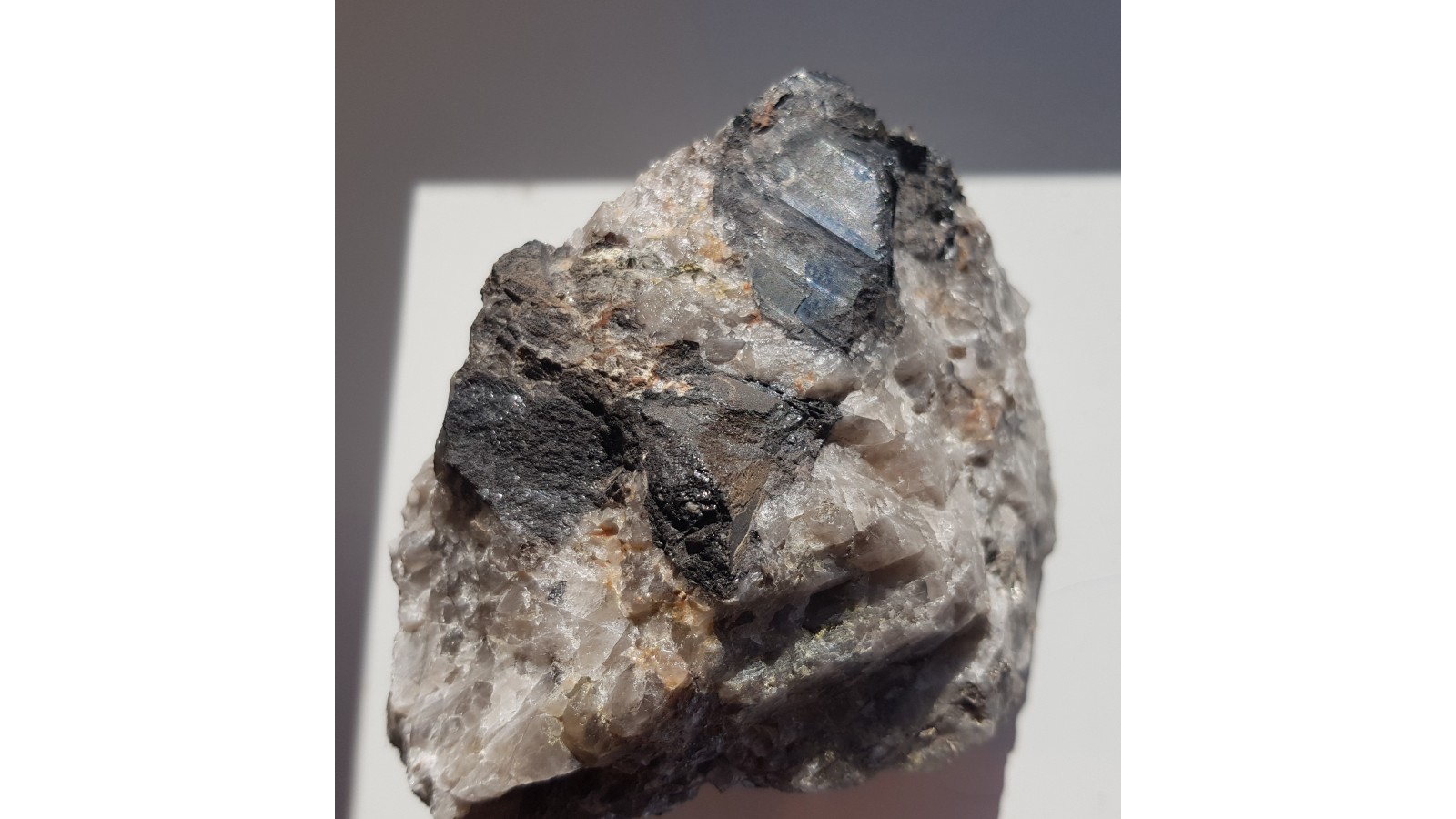 Wielki, błyszczący kryształ wolframitu w skale macierzystej - grejzenie z Krupki w Czechach. W UV 255 nm widoczne intensywne świecenie w barwach żółtozielonych w pobliżu wolframitu, co wskazuje na obecność powellitu w próbce. Piękny, spektakularny okaz. Polecam.
