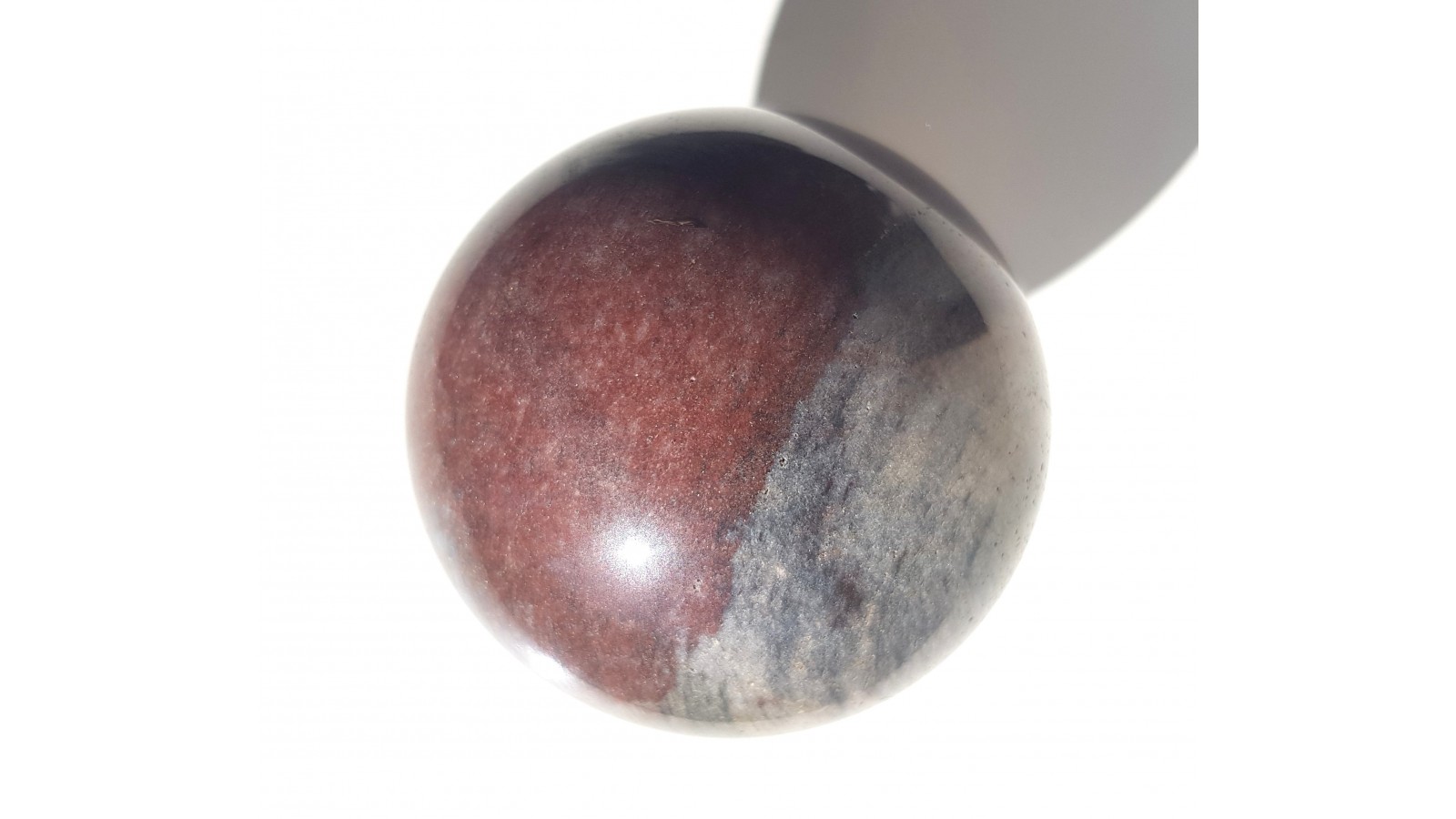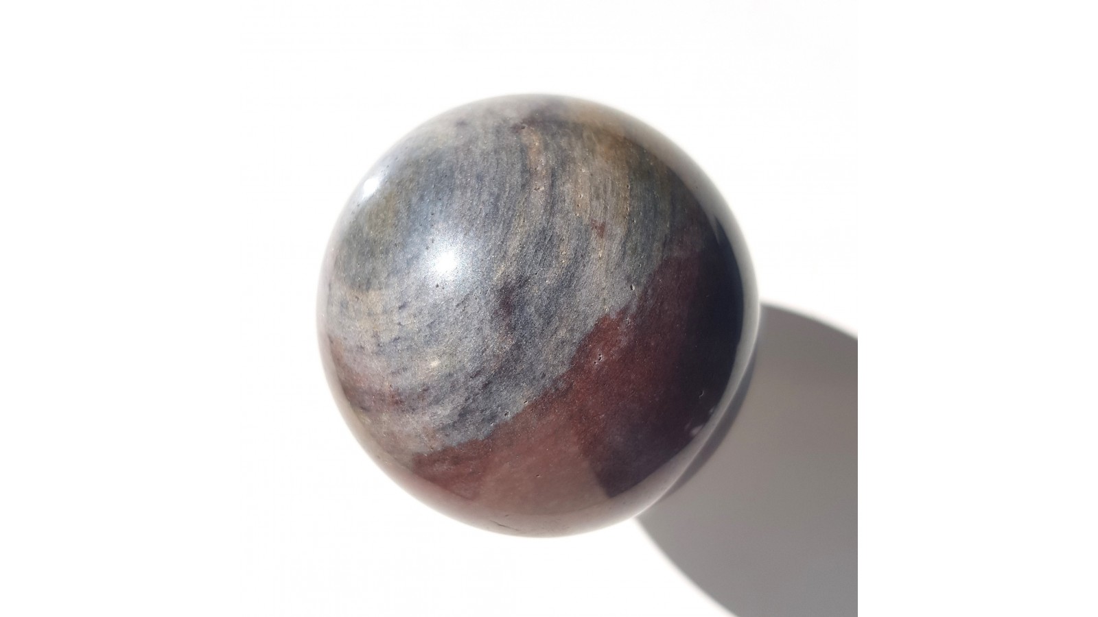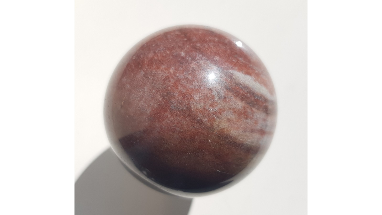 Kula z barwnego kwarcytu z Jegłowej. W strefach czerwonych w oświetleniu widoczny efekt awenturescencji. W niektórych miejscach kontrastowe zabarwienie przypominające mookait. Piękny poler. Widoczne tekstury kierunkowe kwarcytu. Ciekawy deseń. Polecam.
