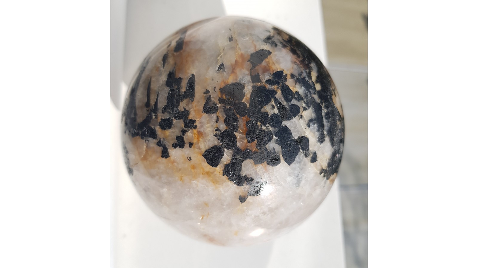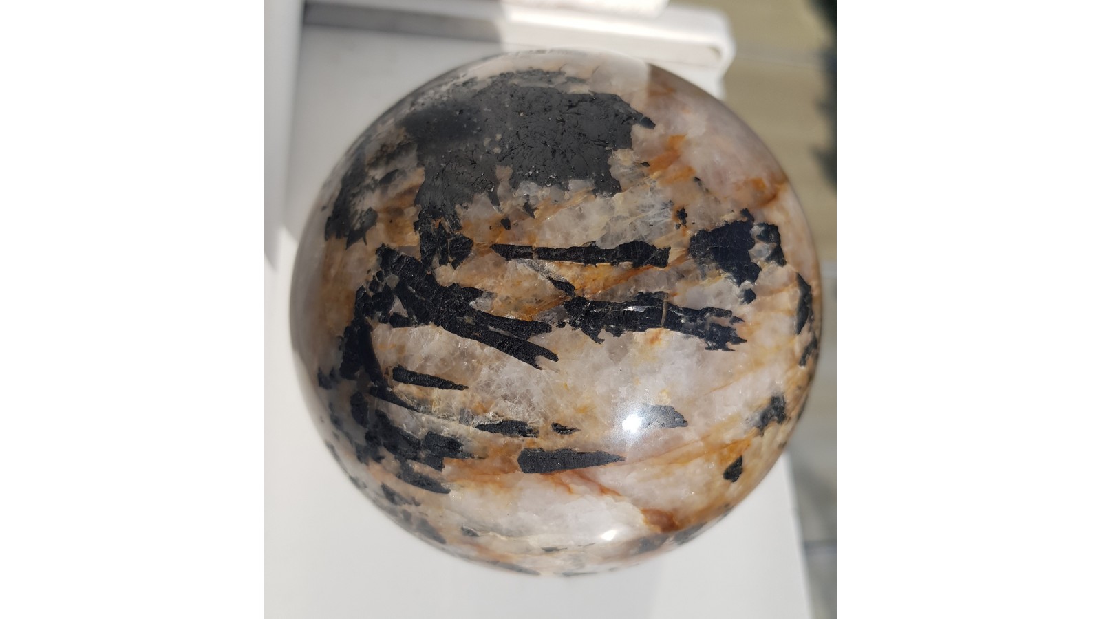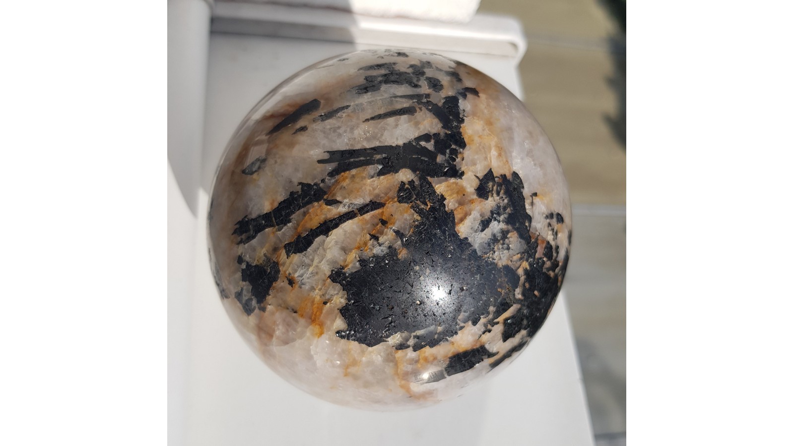 Piękna kula wykonana z żyły kwarcowej z kryształami czarnych turmalinów z Hlyabova w Bułgarii. W przekroju widoczne liczne osobniki czarnych szerli w kwarcu. Idealny poler. Duża, okazała kula. Polecam.