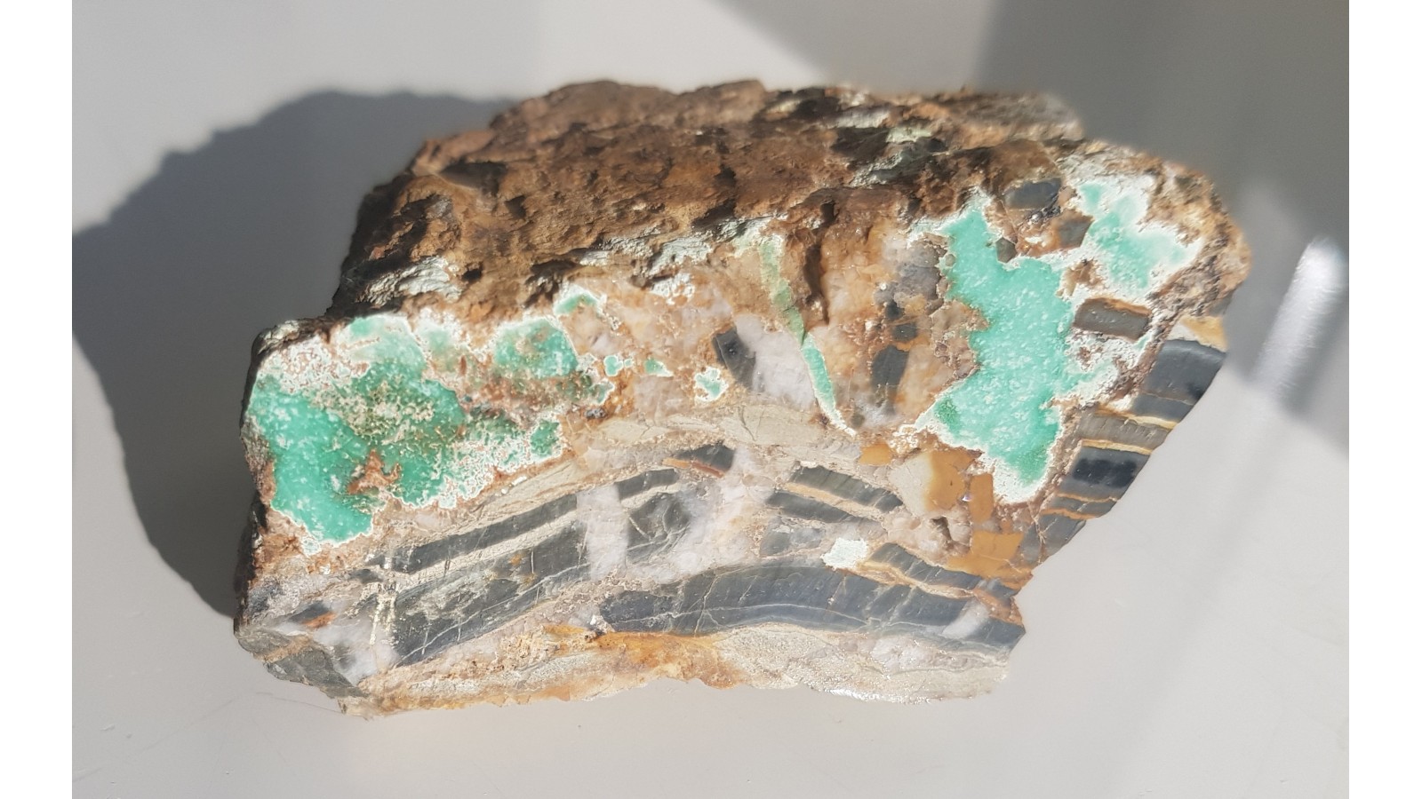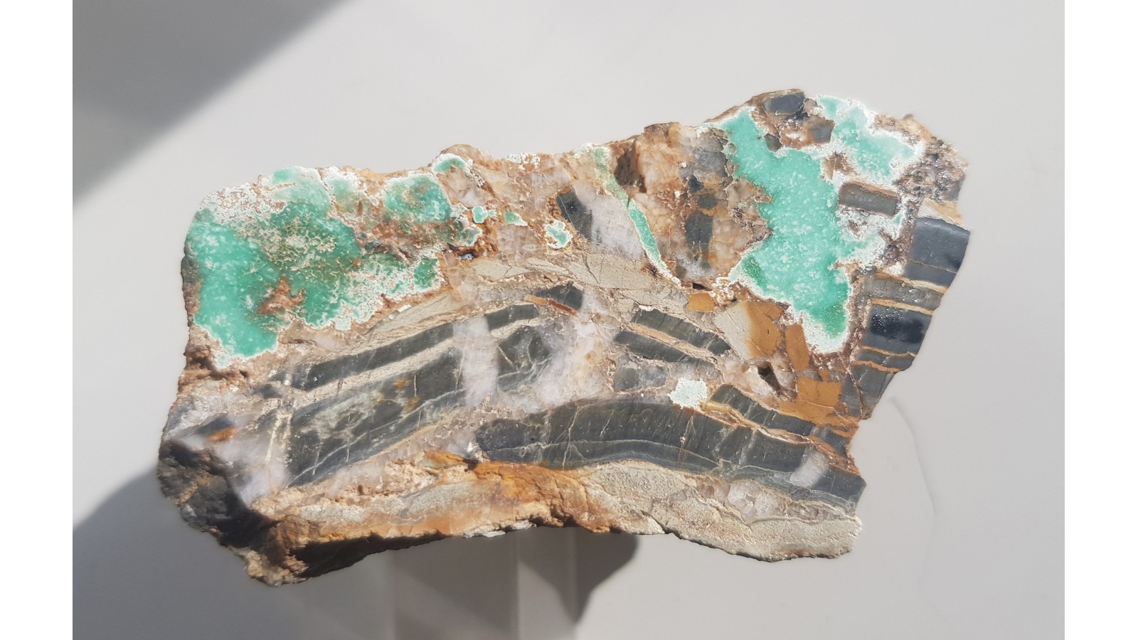 Okaz turkusu z Pustkowa Wilczkowskiego koło Wrocławia. Masywne impregnacje w sylurskim łupku krzemionkowym z grafitem. Okaz jednostronnie polerowany, bardzo estetyczny. Piękne, intensywne zabarwienie. Polecam.