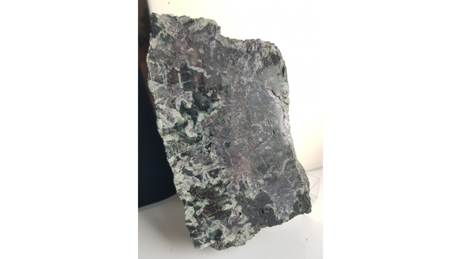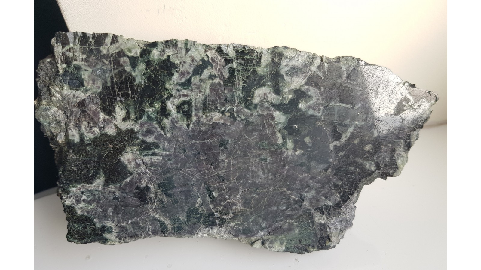 Okaz anortozytu z Nowej Rudy z dawnej kopalni Piast. Piękny poler. Strona przeciwna naturalna. Skała składa się z ciemnoszarych plagioklazów, miejscami wrostki minerałów rudnych. Anortozyty z tej lokalizacji są masywnymi wtrąceniami wśród gabr. Polecam.