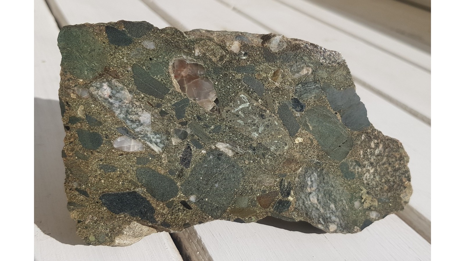 Zlepieńce te uznawane są (K. Smulikowski, H. Teisseyre) za "dzieło dzikich potoków górskich, wzbierających w czasie okresowych górskich powodzi". Zlepieńce niosą ciekawe skały, np. paleoporfiry. Klast jasnej, porfirowatej skały wulkanicznej znajduje się w centrum okazu. Inne skały to otoczaki gnejsów, mały klast gabra oraz szarowaki i łupki metamorficzne, w tym okruszcowane. Doskonały poler.