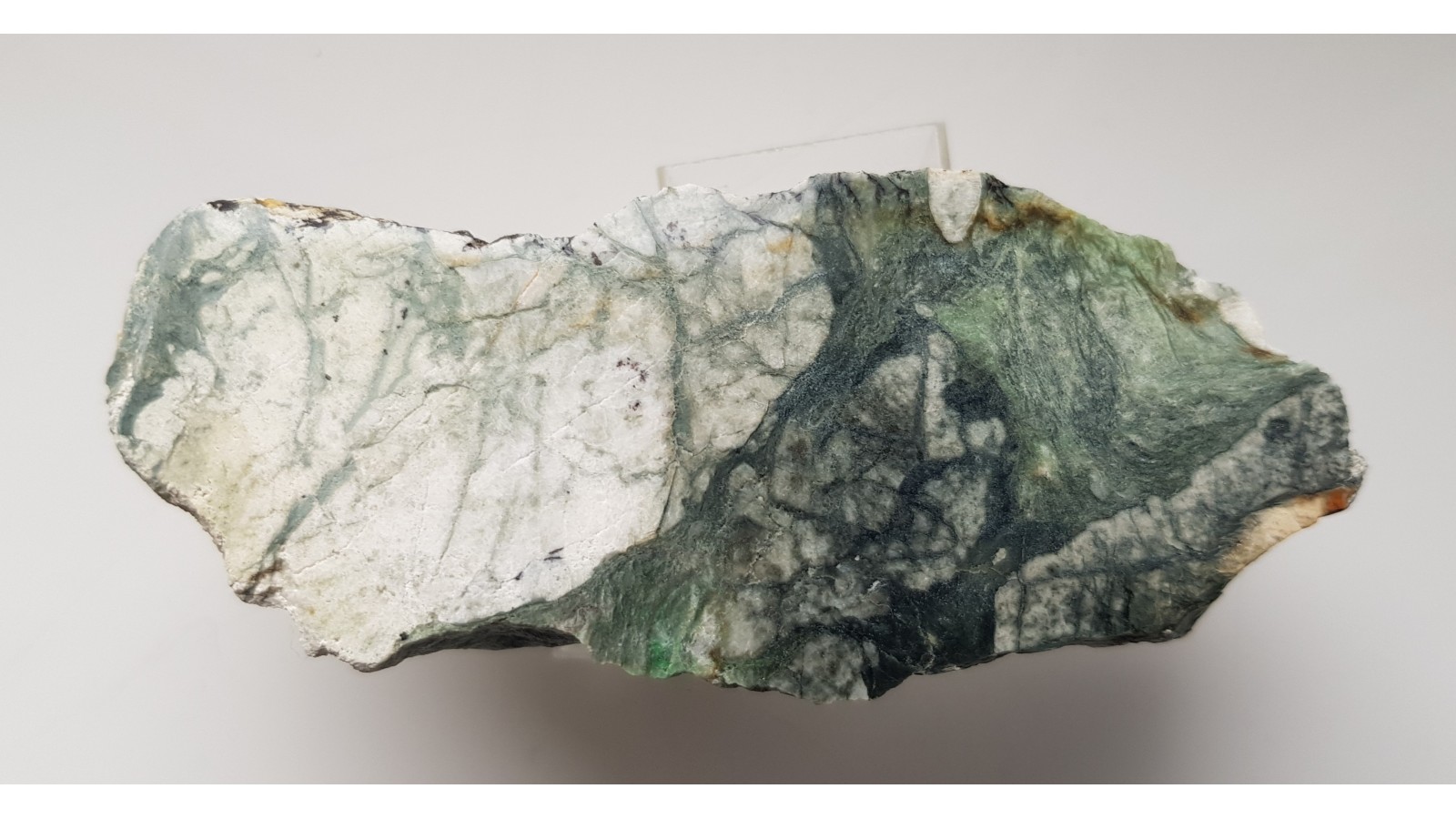 Rodingit o ciekawym deseniu z małymi wtrąceniami intensywnie zielonych minerałów chromu, najprawdopodobniej granatów chromowych o charakterystycznej, szmaragdowej barwie. Okaz polerowany, strona przeciwna naturalna, bez obróbki. Bardzo ozdobna skała. Polecam.