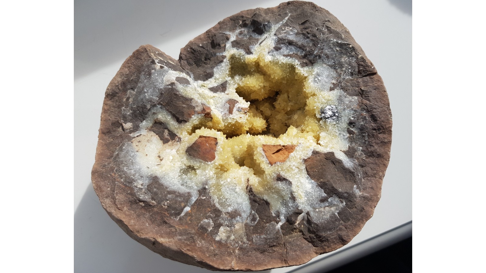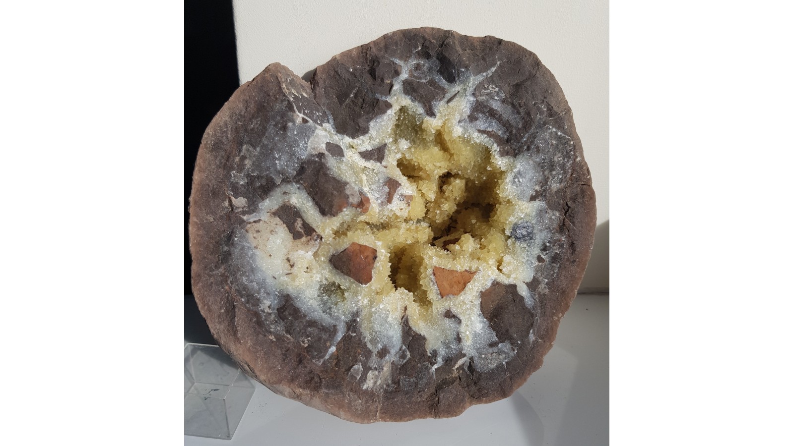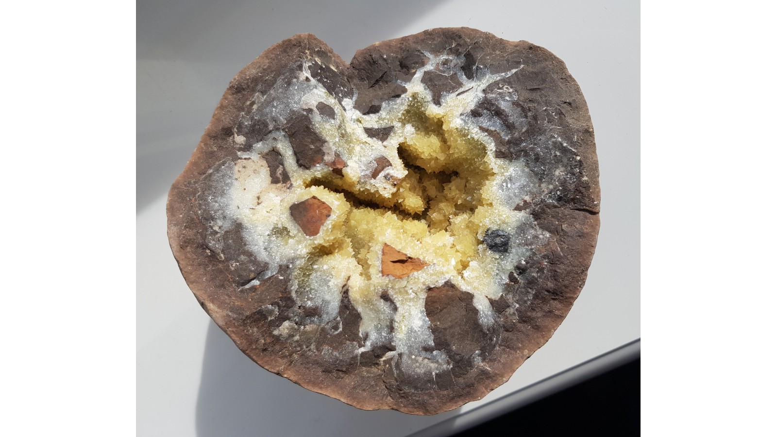 Jurajska konkrecja syderytowa, tzw. sferosyderyt - septaria z Częstochowy. Bardzo okazała, ozdobna, z pięknie wykształconymi kryształami żółtych kalcytów a także dużym ziarnem sfalerytu z lewej strony okazu. Zamknięta, cała forma, nigdzie nie uszkodzona. W przedwojennej Polsce jurajskie sferosyderyty były eksploatowane pod Częstochową oraz w okolicy Łęczycy jako uboga ruda żelaza. Polecam.