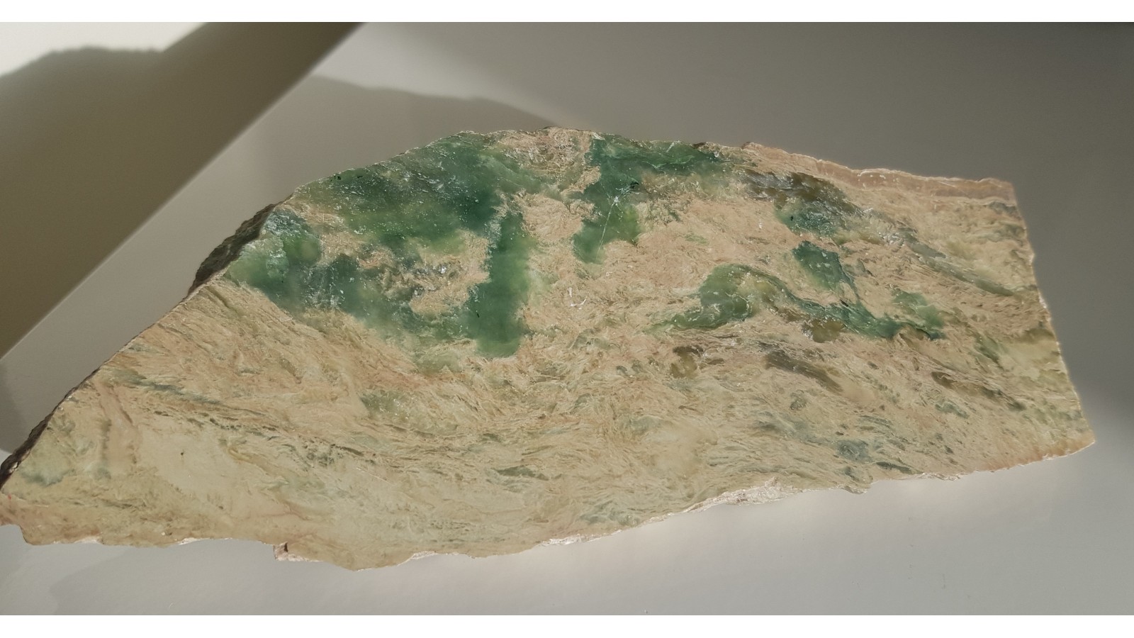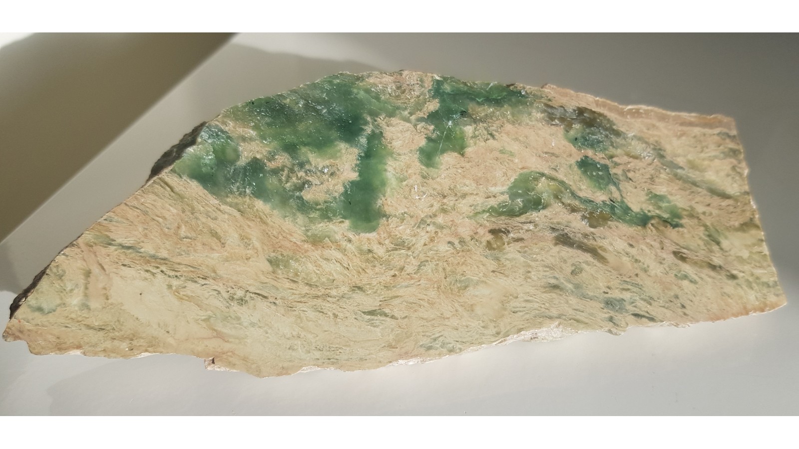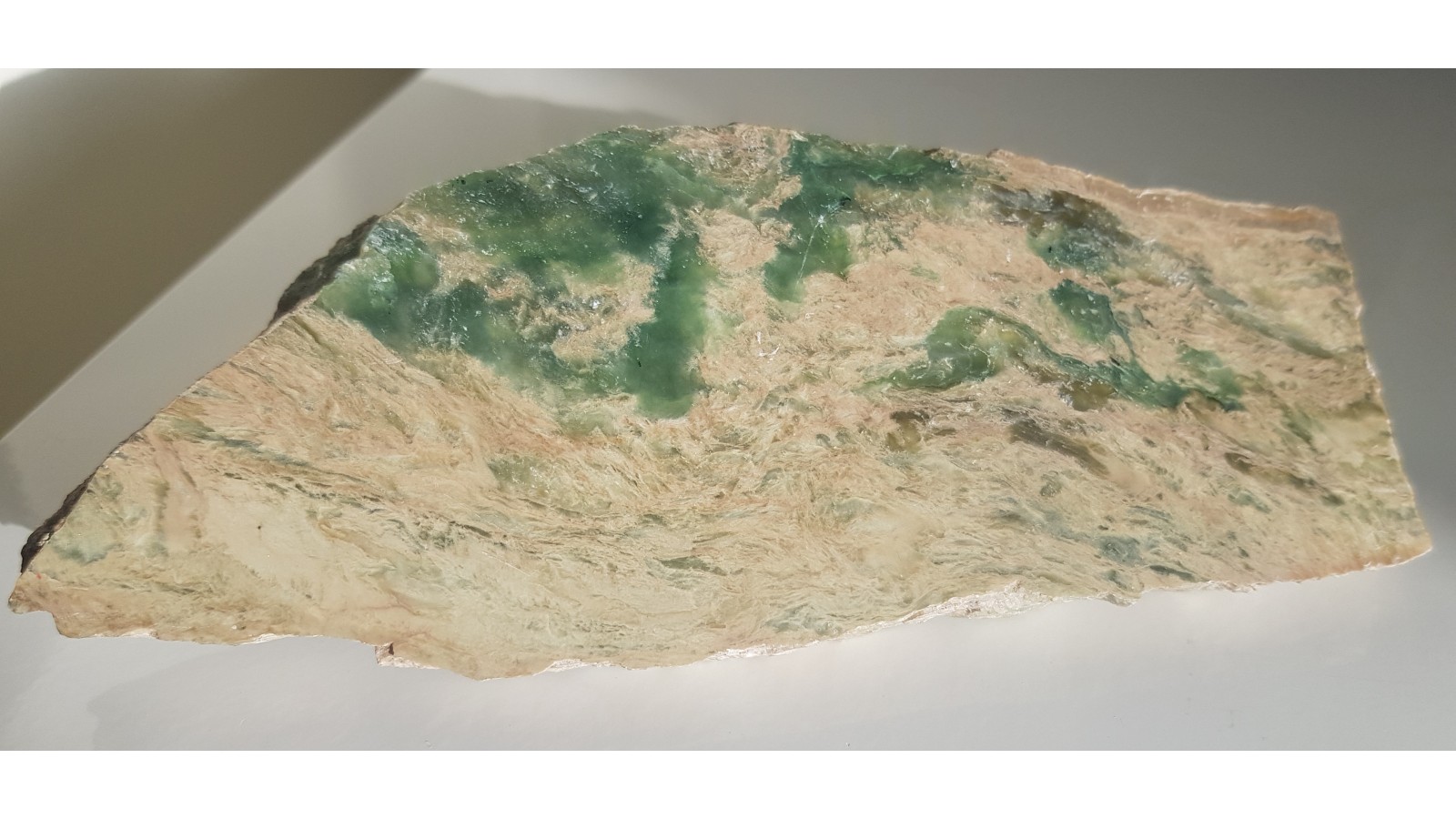 Jasnozielony nefryt tremolitowy z Nasławic na Dolnym Śląsku. Niewielka budina w pobliżu jasnej skały rodingitowej została wyeksploatowana w roku 2010 i obecnie nefrytu w Nasławicach całkowicie brak. Jasna barwa nefrytu z Nasłwic odróżnia go od bardziej powszechnego nefrytu z Jordanowa Śląskiego. Piękna, intensywna barwa smug nefrytu w rodingicie. nefrytu. Okaz polerowany jednostronnie, płytka, strona przeciwna po pile. Polecam.