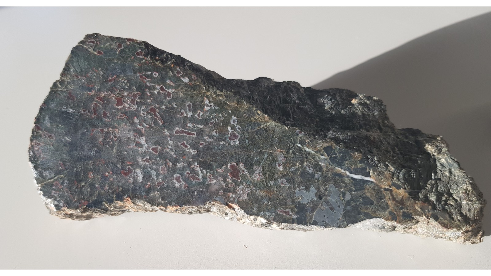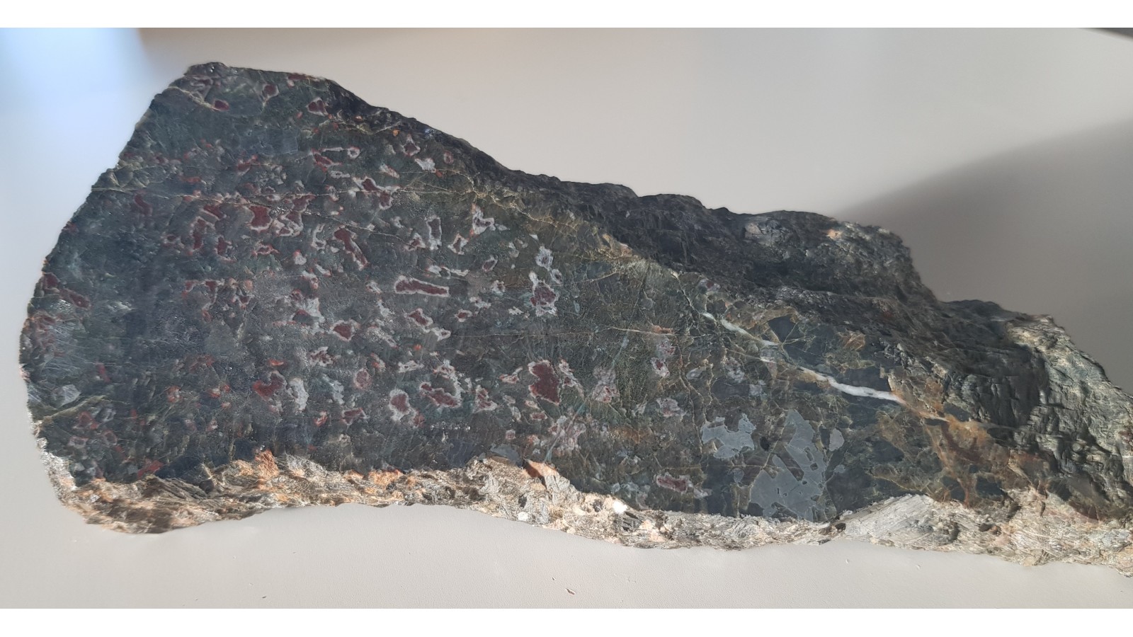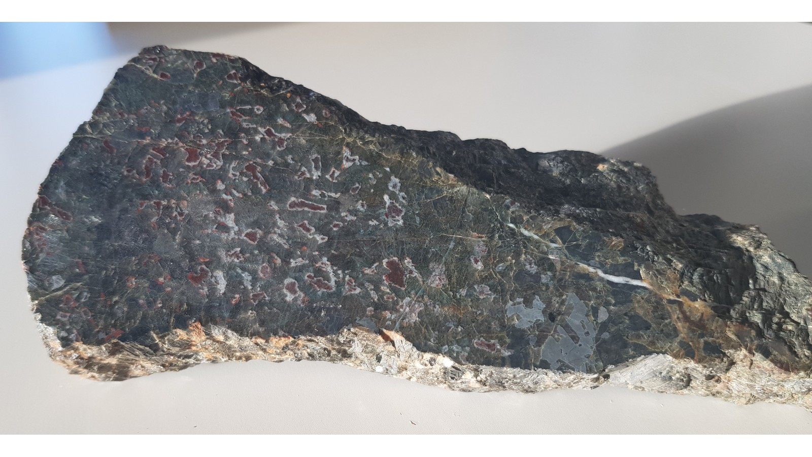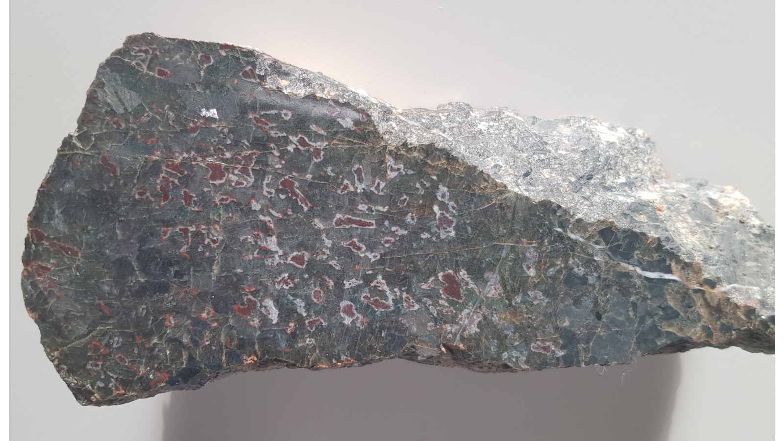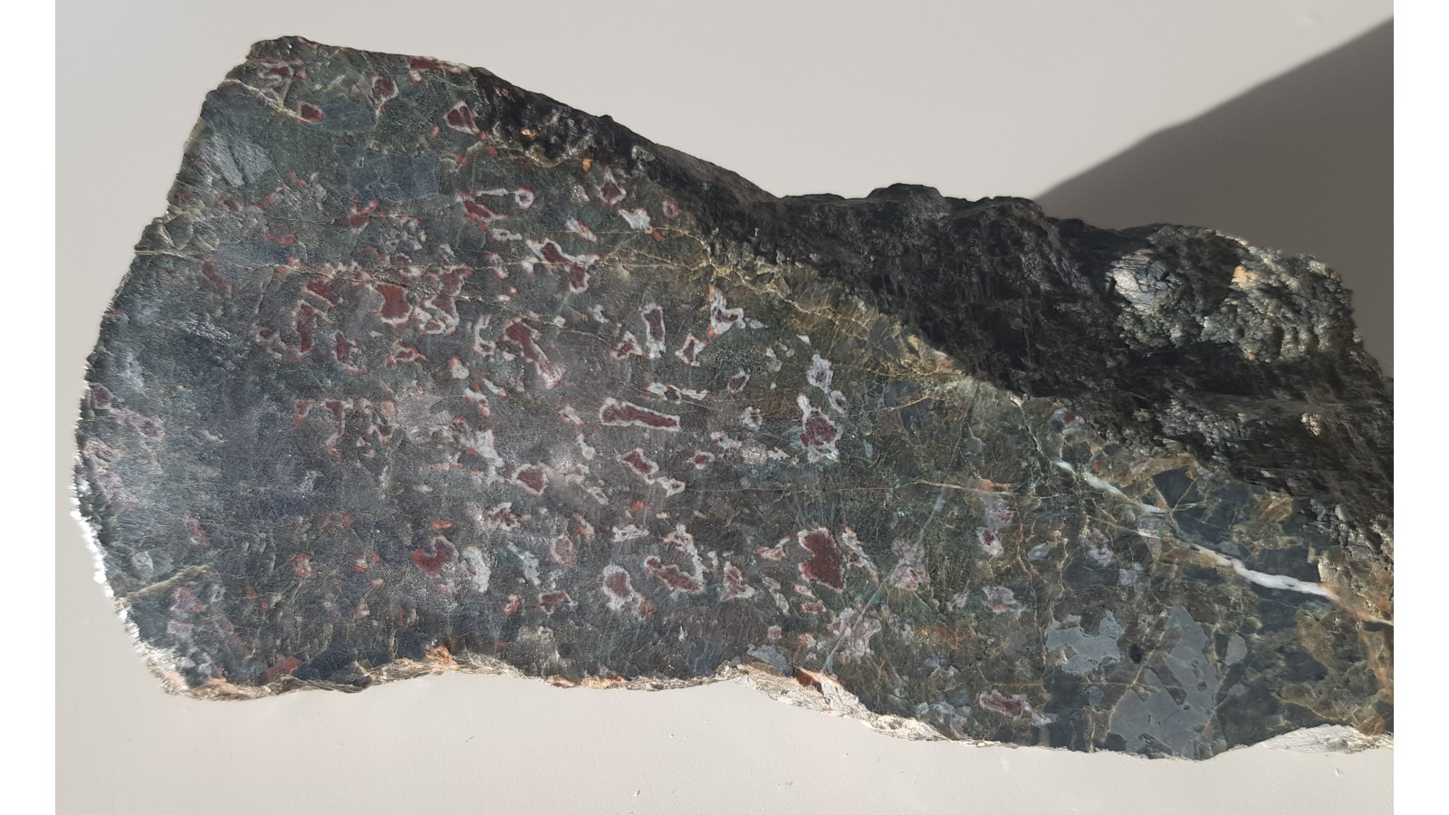 Gabro oliwinowe - troktolit z Nowej Rudy - Słupca z charakterystycznymi czerwonymi strefami będącymi produktami przeobrażenia pierwotnych oliwinów - iddingsyt. Okaz polerowany jednostronnie, strona przeciwna po cięciu. Małe wtrącenia minerałów rudnych i dostrzegalne "świecenie" piroksenów w części zgładu. Idealny poler. Polecam.