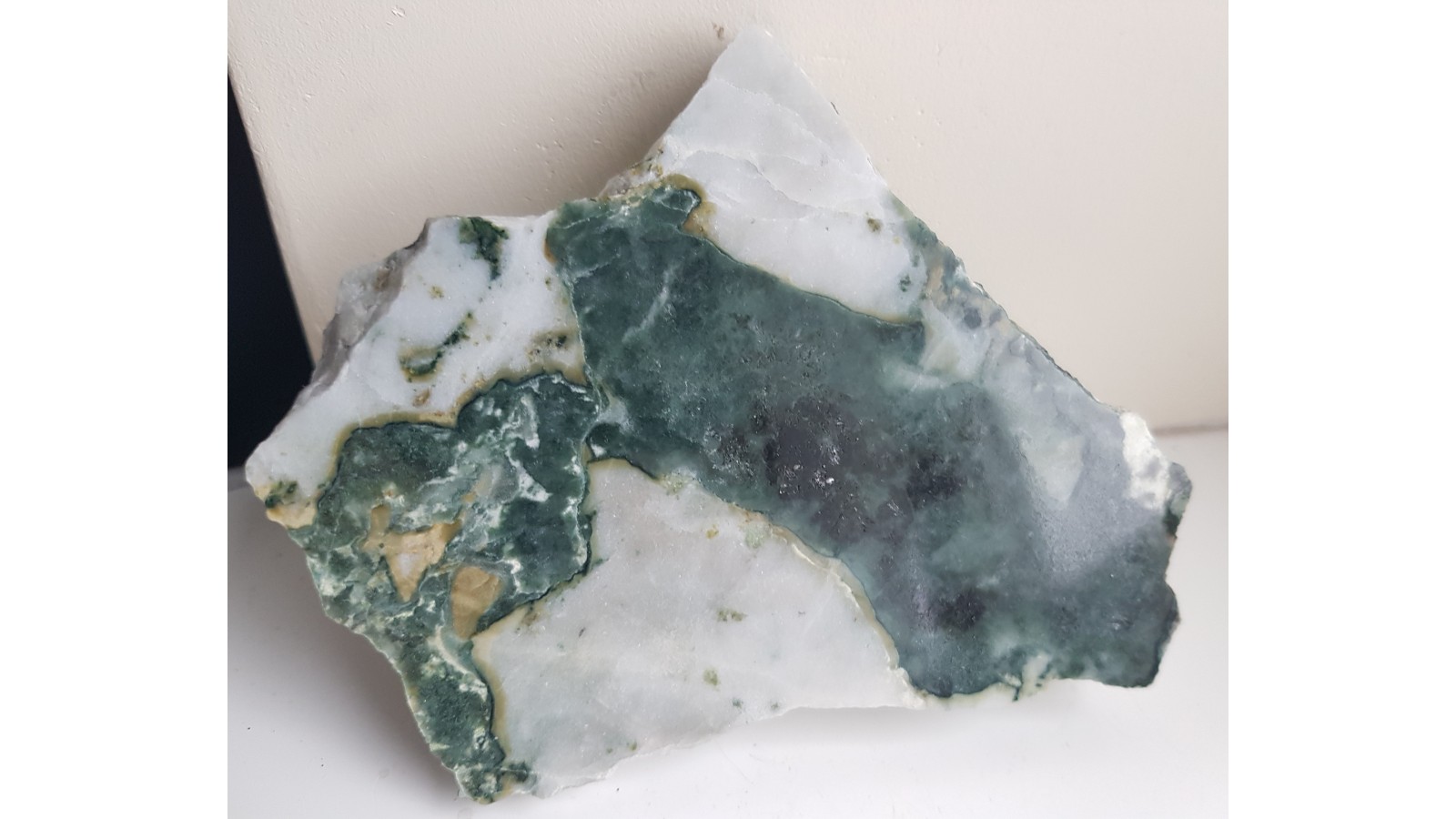 Krystaliczna strefa o pięknej, nasyconej barwie zbudowana z jawnokrystalicznego aktynolitu i flogopitu z Rędzin k. Kamiennej Góry. Strefa powstała podobnie do nefrytów pochodzenia metasomatytcznego. Również wyglądem przypomina nefryt, nefrytoid. Piękna zielona barwa na tle białego dolomitu. Nie jest to strefa zbudowana z minerałów grupy serpentynu, które w Rędzinach są powszechne. Okaz jednostronnie polerowany, strona przeciwna naturalna, ciekawostka. Polecam.