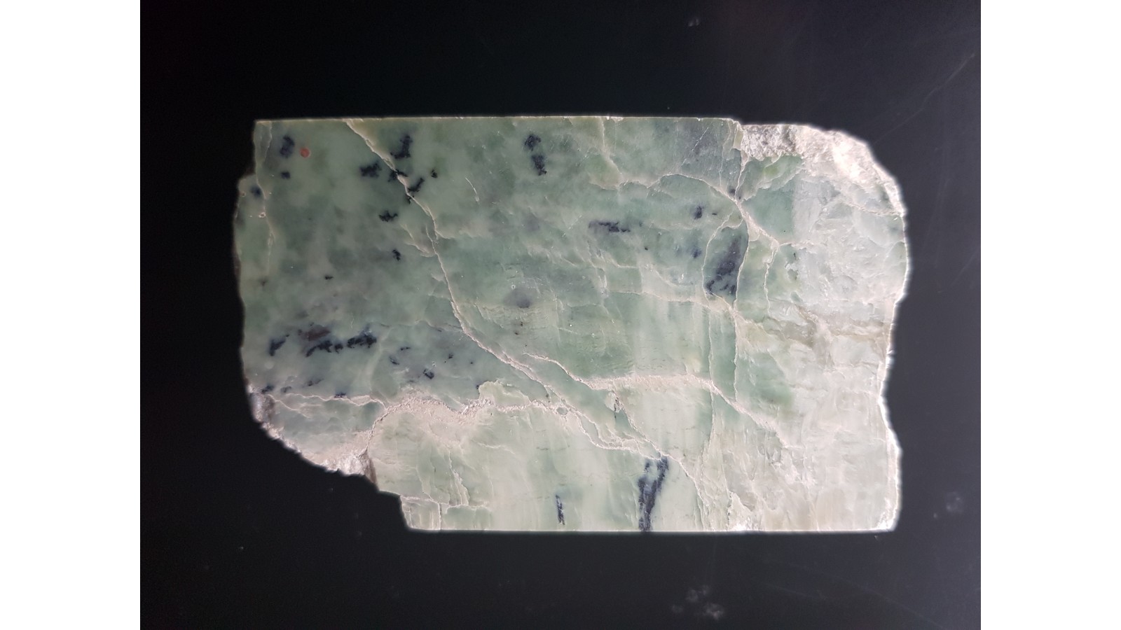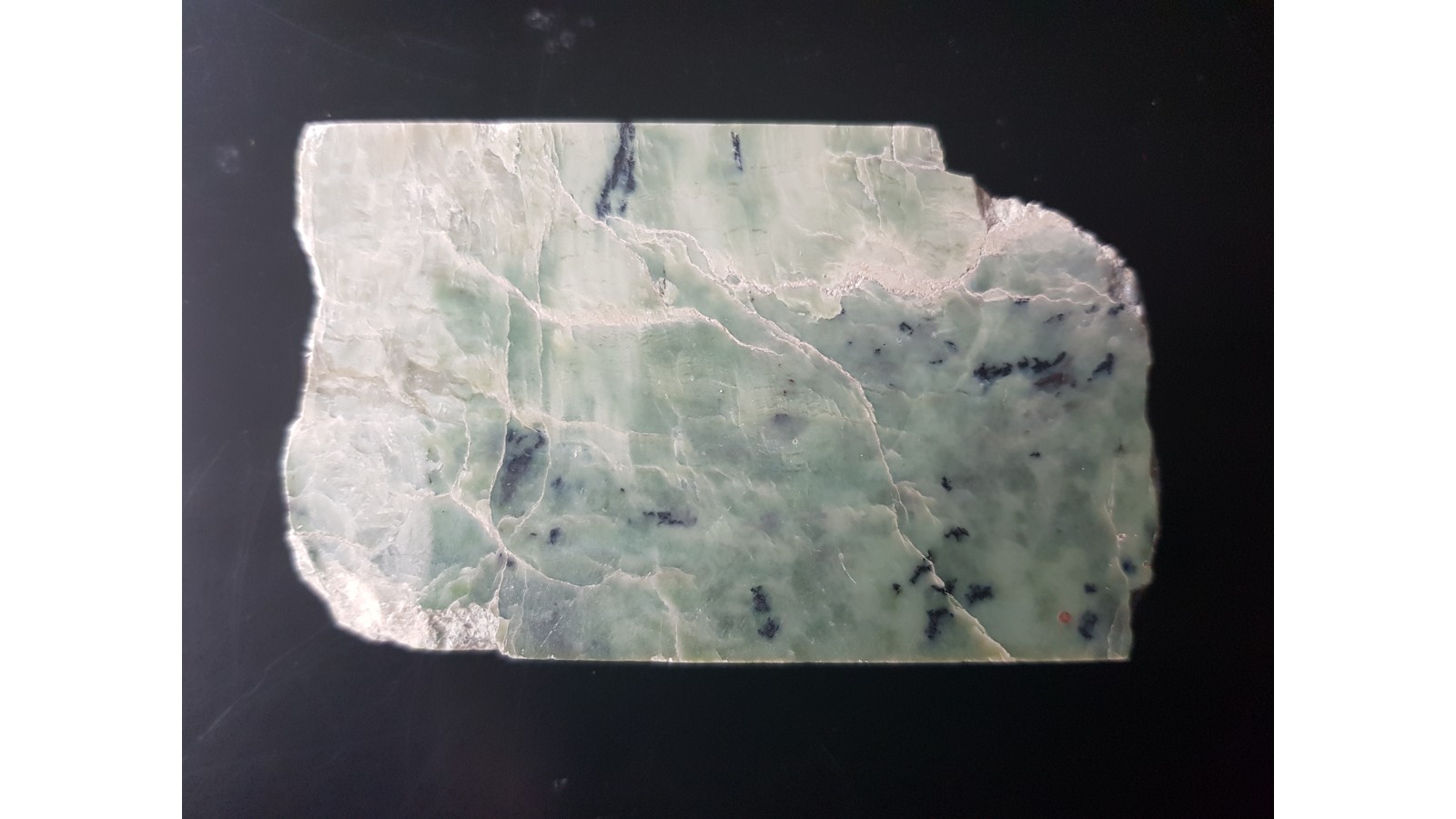Polerowany okaz nefrytu z Nasławic k. Wrocławia. Okaz z wyeksploatowanego już przed laty stanowiska opisanego w Przeglądzie geologicznym (nr 11/2008). Okaz polerowany jednostronnie, docięty do prostopadłościanu. Polecam.