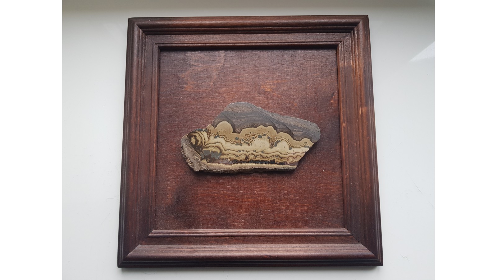 Obraz wykonany z użyciem polerowanej płytki blendy cynkowej z Olkusza z abstrakcyjnym rysunkiem. Kompozycja z natury. Nietuzinkowy i niepowtarzalny prezent. Polecam.
