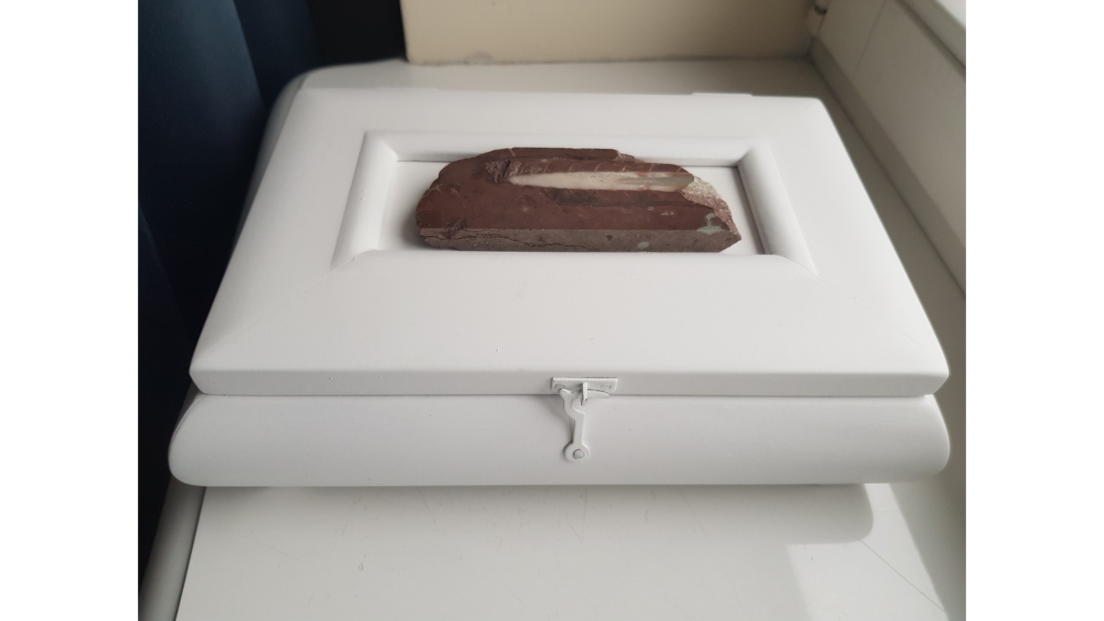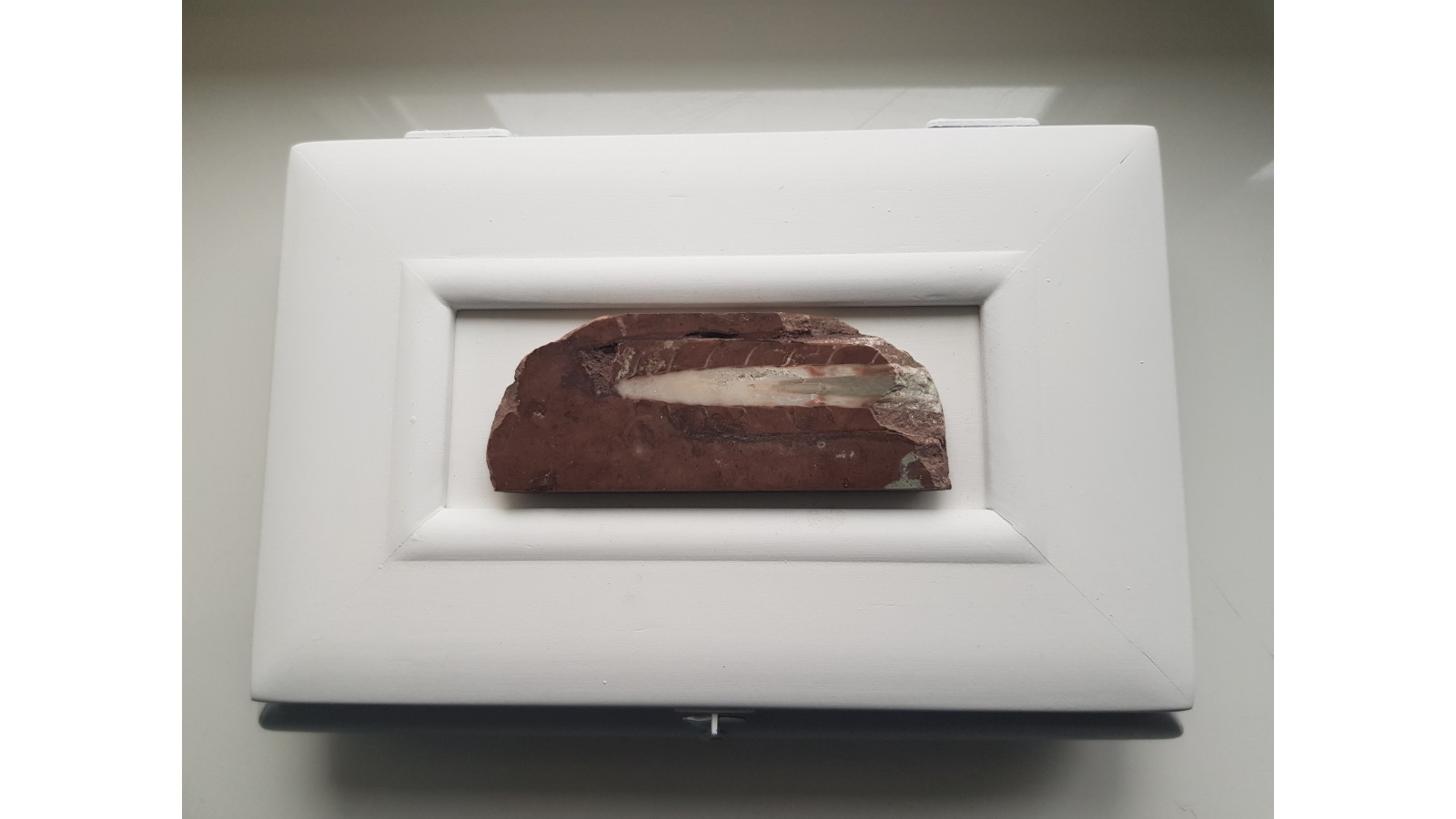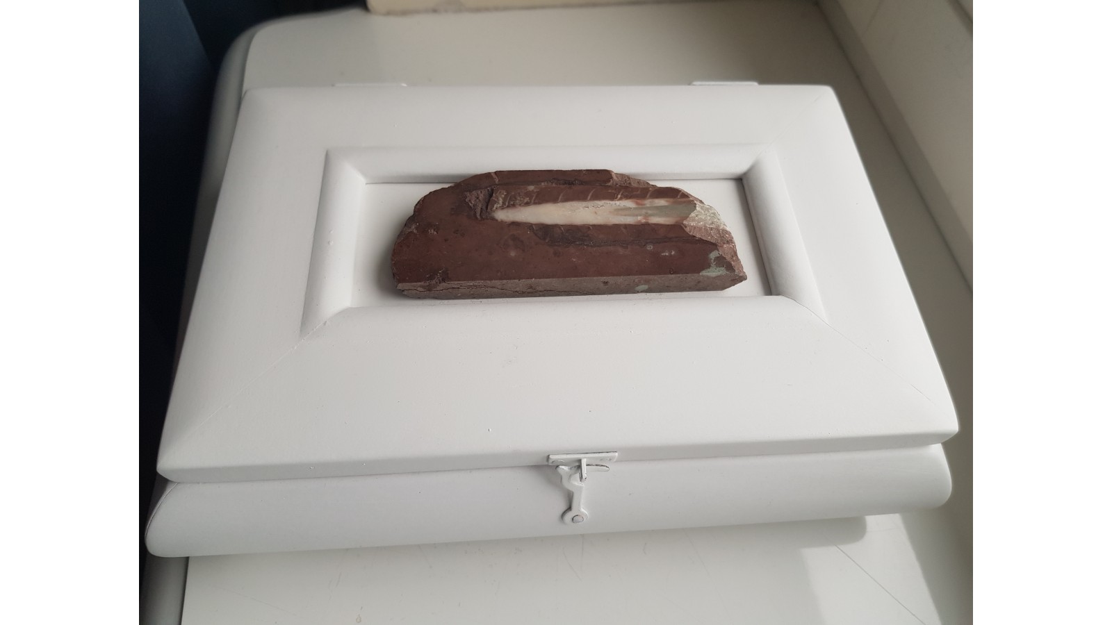 Szkatułka z oryginalną skamieniałością z paleozoiku Skandynawii (Orthoceras). Wstawka ze skamieniałością polerowana. Niepowtarzalny prezent. Polecam.