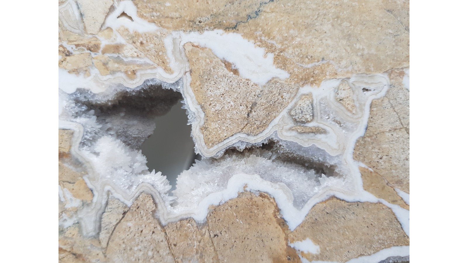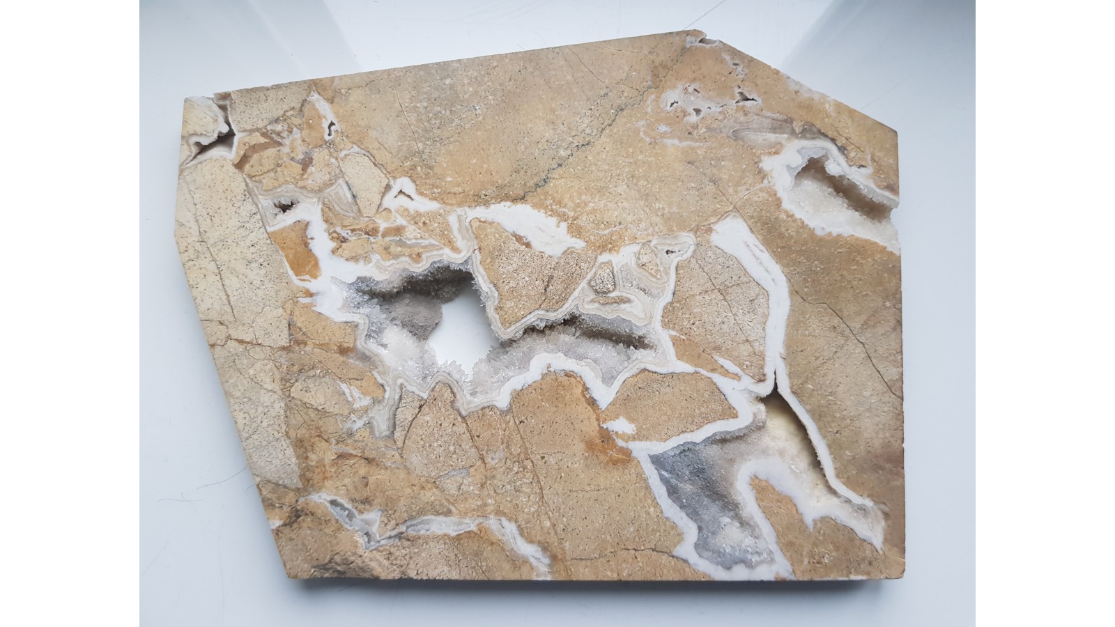 Ozdobny dolomit z kawerną wypełnioną kryształami kalcytu, sformatowany do celów ozdobnych oraz z powierzchnia polerowaną. Dolomit ze złoża Sławniowice w południowej części województwa opolskiego. Polecam.