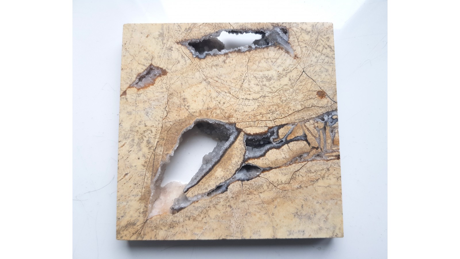 Ozdobny dolomit z kawerną wypełnioną kryształami kalcytu, sformatowany do celów ozdobnych oraz z powierzchnia polerowaną. Dolomit ze złoża Sławniowice w południowej części województwa opolskiego. Polecam.