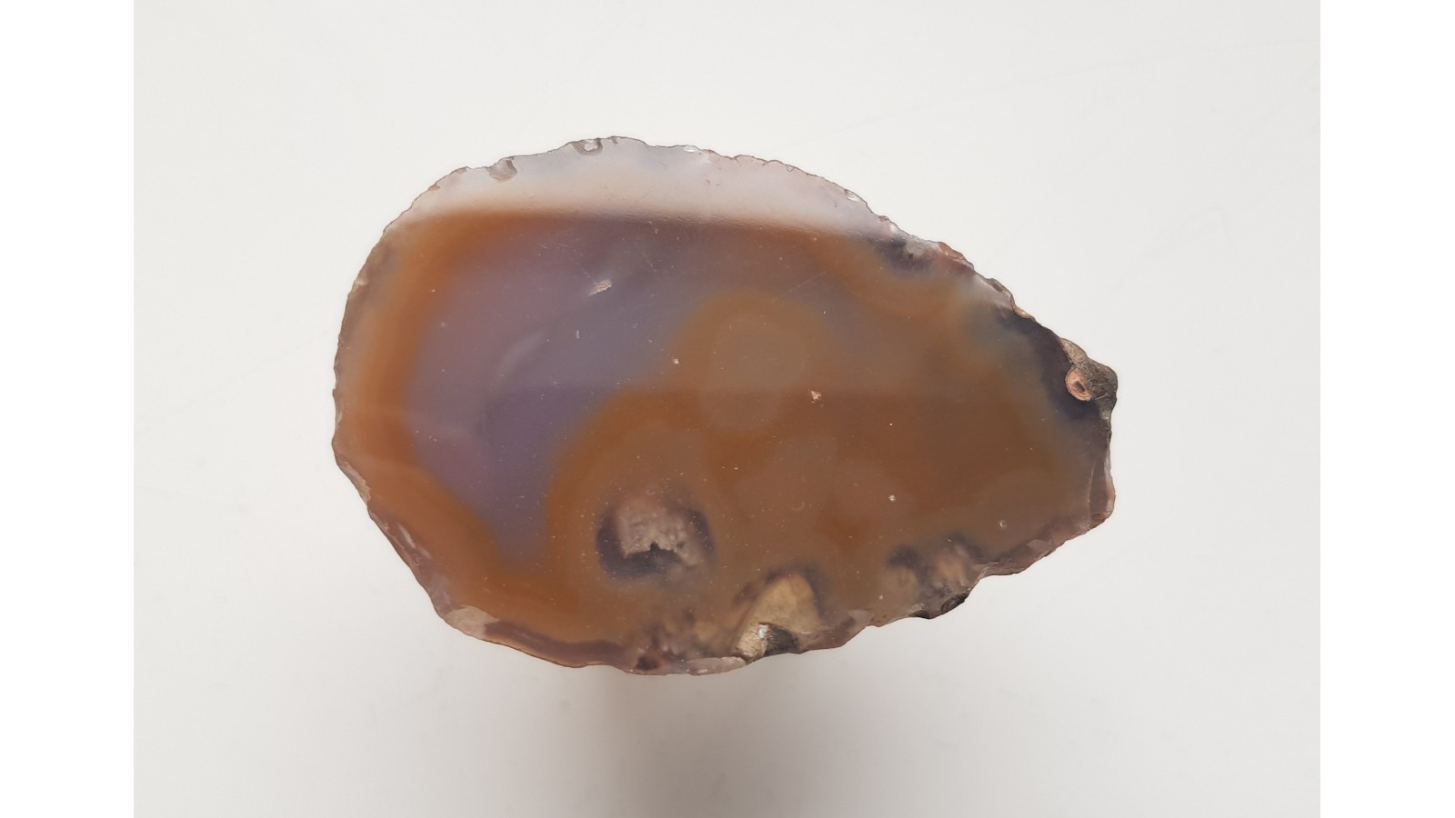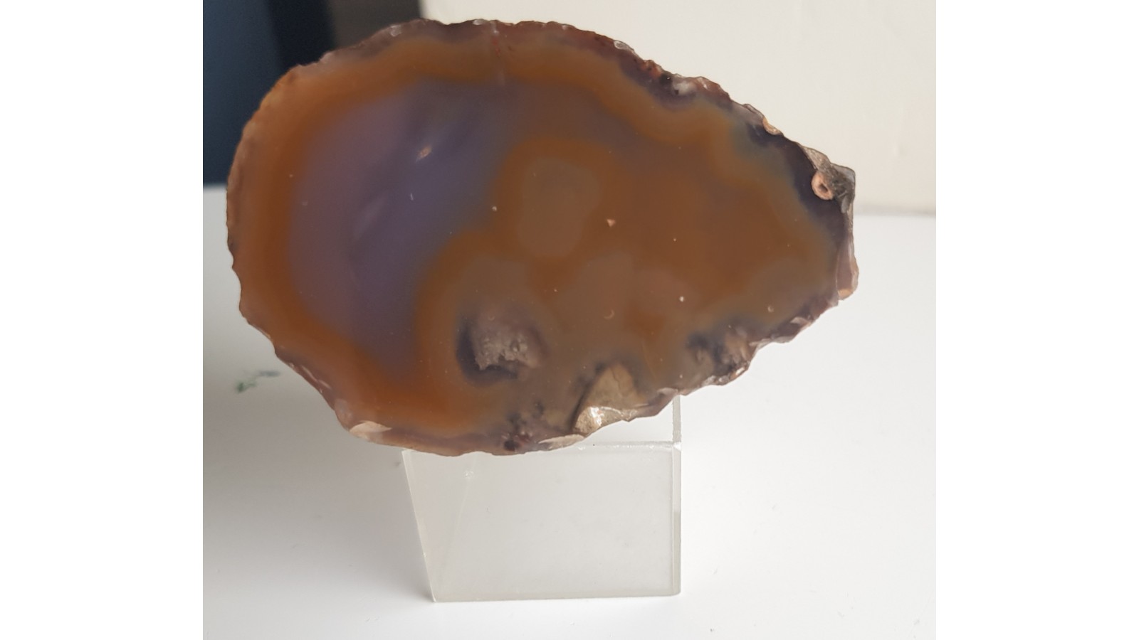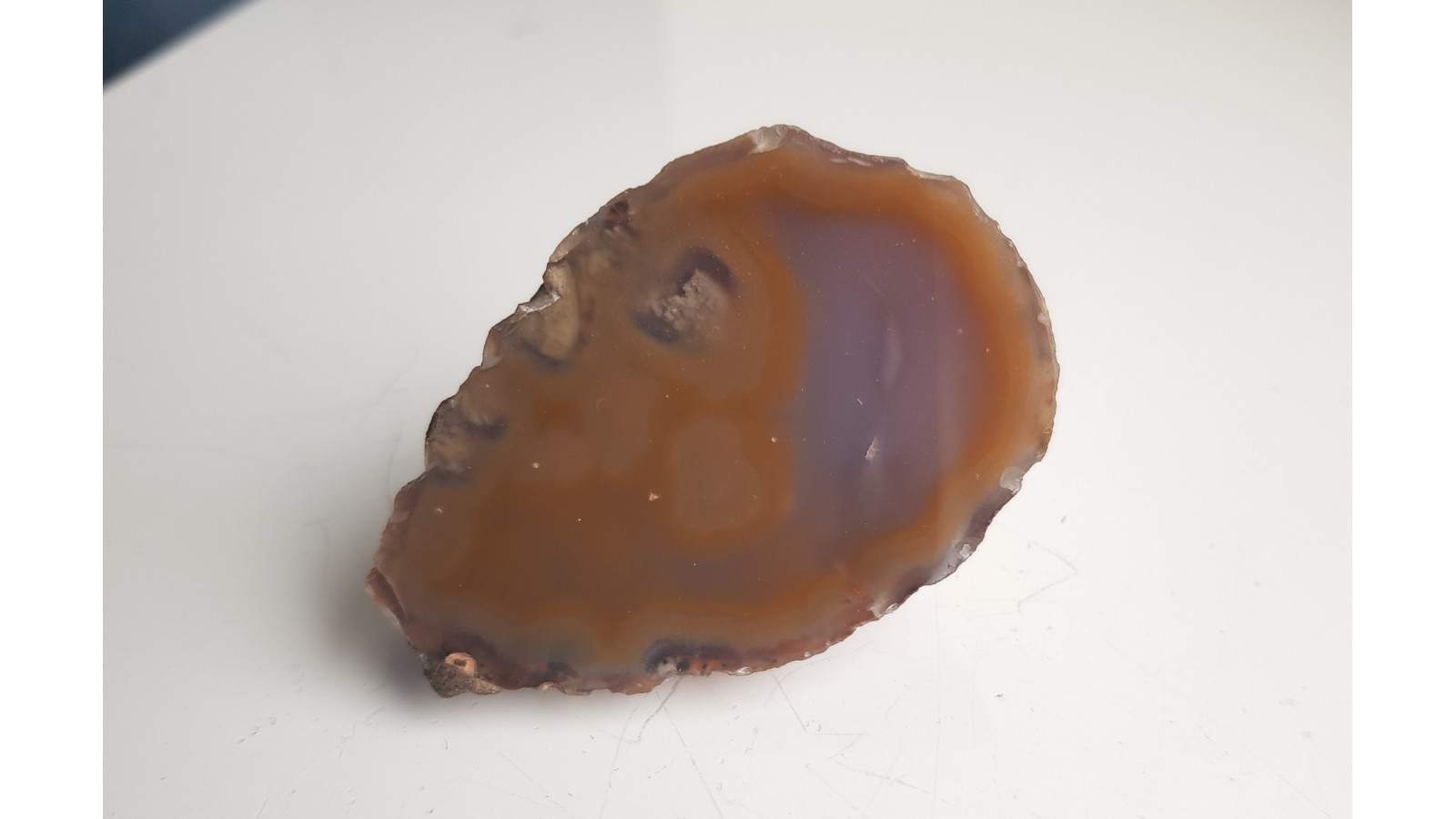 Piękny agat z Armenii. Idealny poler, połówka migdała. Absolutnie niespękany. Bardzo estetyczny, subtelny rysunek, jak gdyby lekko rozmyty, niecodzienne zestawienie barw. Polecam.