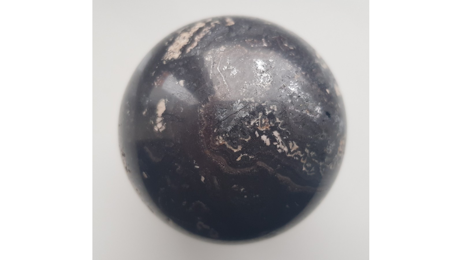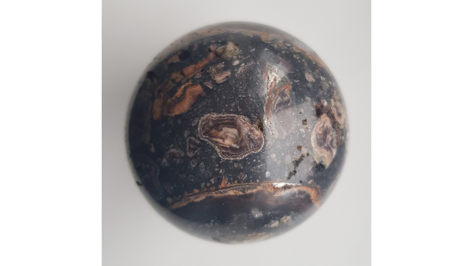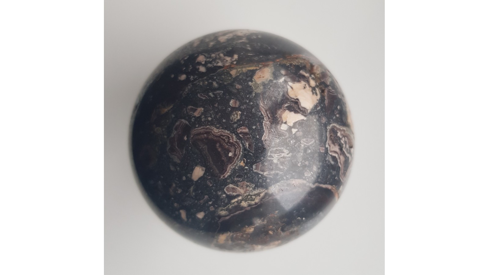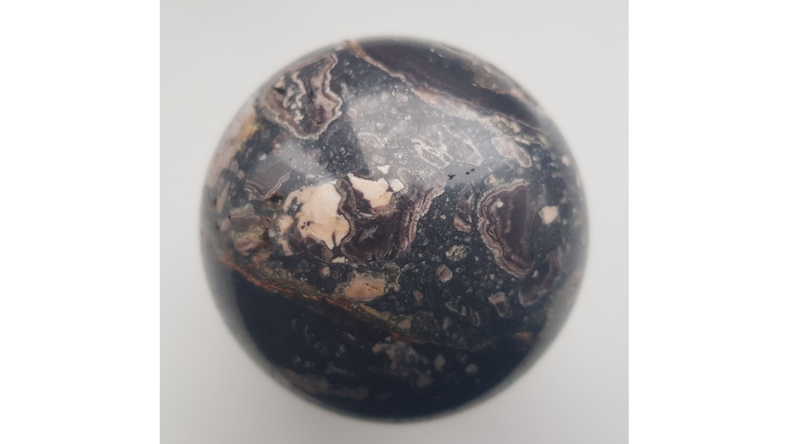 Wyjątkowa, piękna kula, bez spękań z rudy wstęgowej z Kosowa. Ruda zawiera obok sfalerytu rodochrozyt (wszystkie jaśniejsze obszary na kuli, w tym o budowie koncentrycznej) oraz antymonit (wrostki barwy srebrzystej). Wszystkie doskonale widoczne na powierzchni kuli. Niezwykłe desenie wynikające z budowy wewnętrznej rudy wstęgowej. Żyła kruszcowa na granicy serpentynitów oraz andezytów z okolic Prisztiny w Kosowie. Polecam.