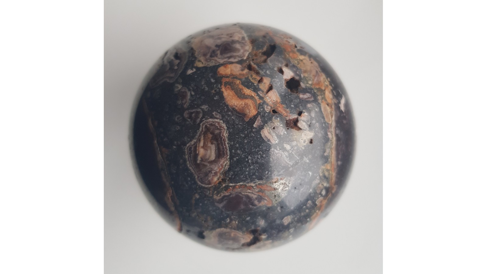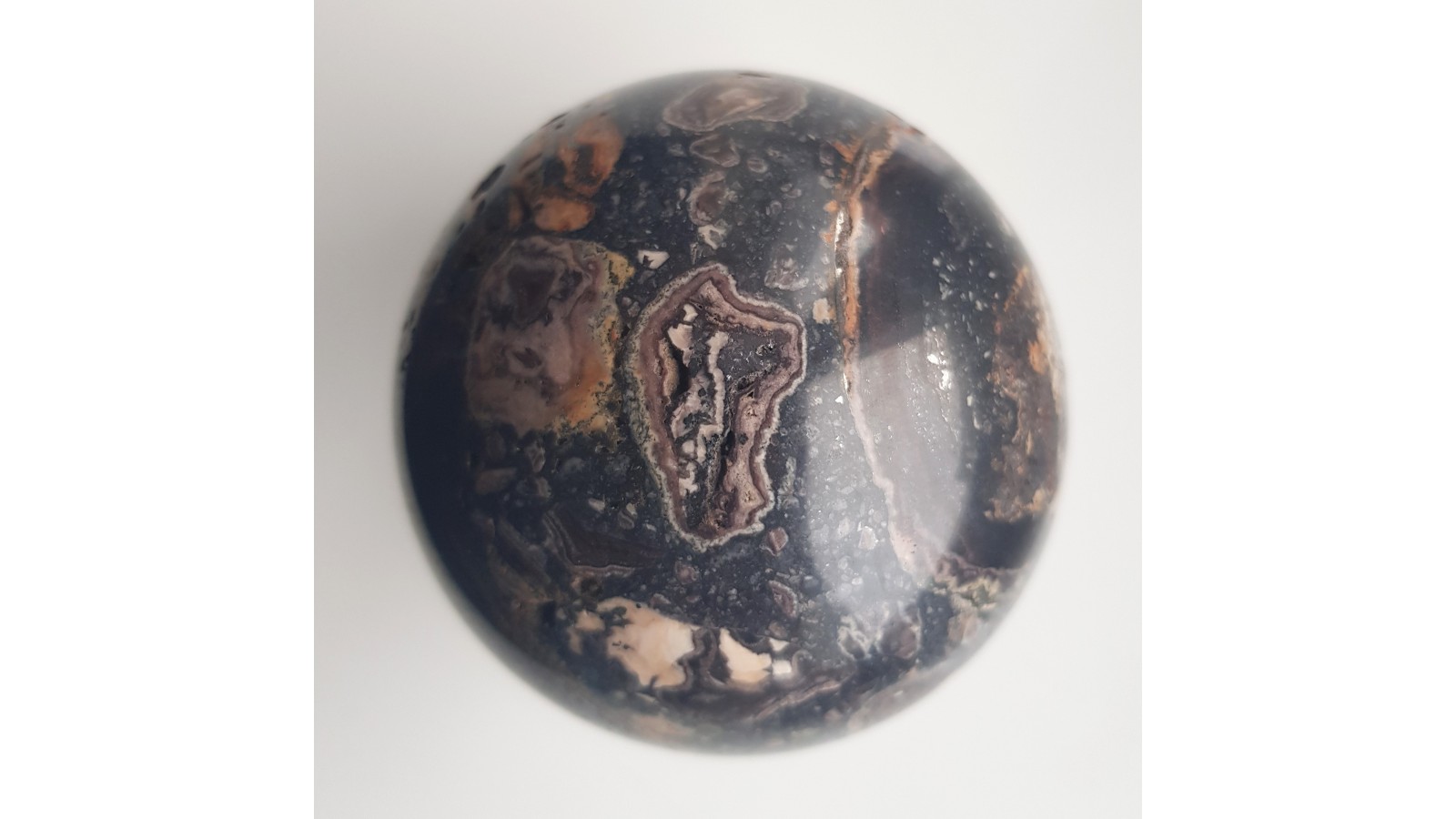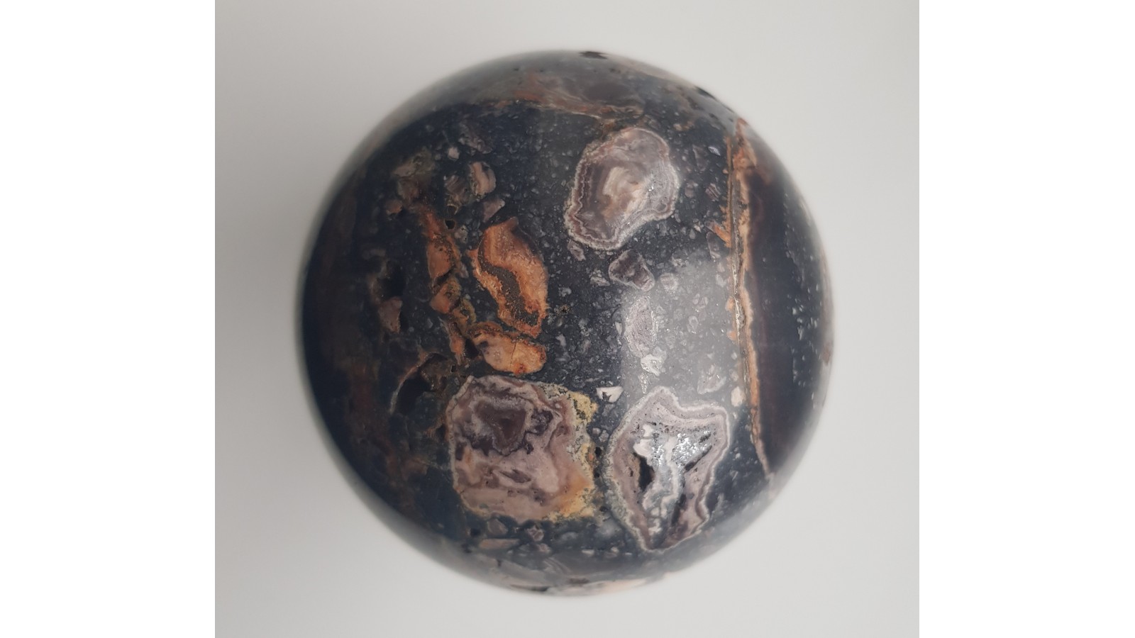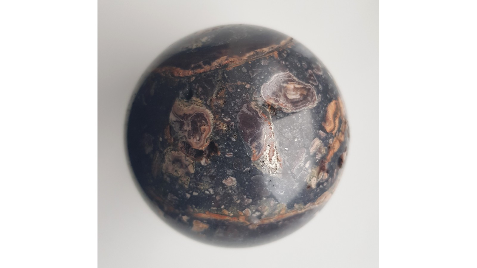 Wyjątkowa, piękna kula, bez spękań z rudy wstęgowej z Kosowa. Ruda zawiera obok sfalerytu rodochrozyt (wszystkie jaśniejsze obszary na kuli, w tym o budowie koncentrycznej) oraz antymonit (wrostki barwy srebrzystej). Wszystkie doskonale widoczne na powierzchni kuli. Niezwykłe desenie wynikające z budowy wewnętrznej rudy wstęgowej. Żyła kruszcowa na granicy serpentynitów oraz andezytów z okolic Prisztiny w Kosowie. Polecam.