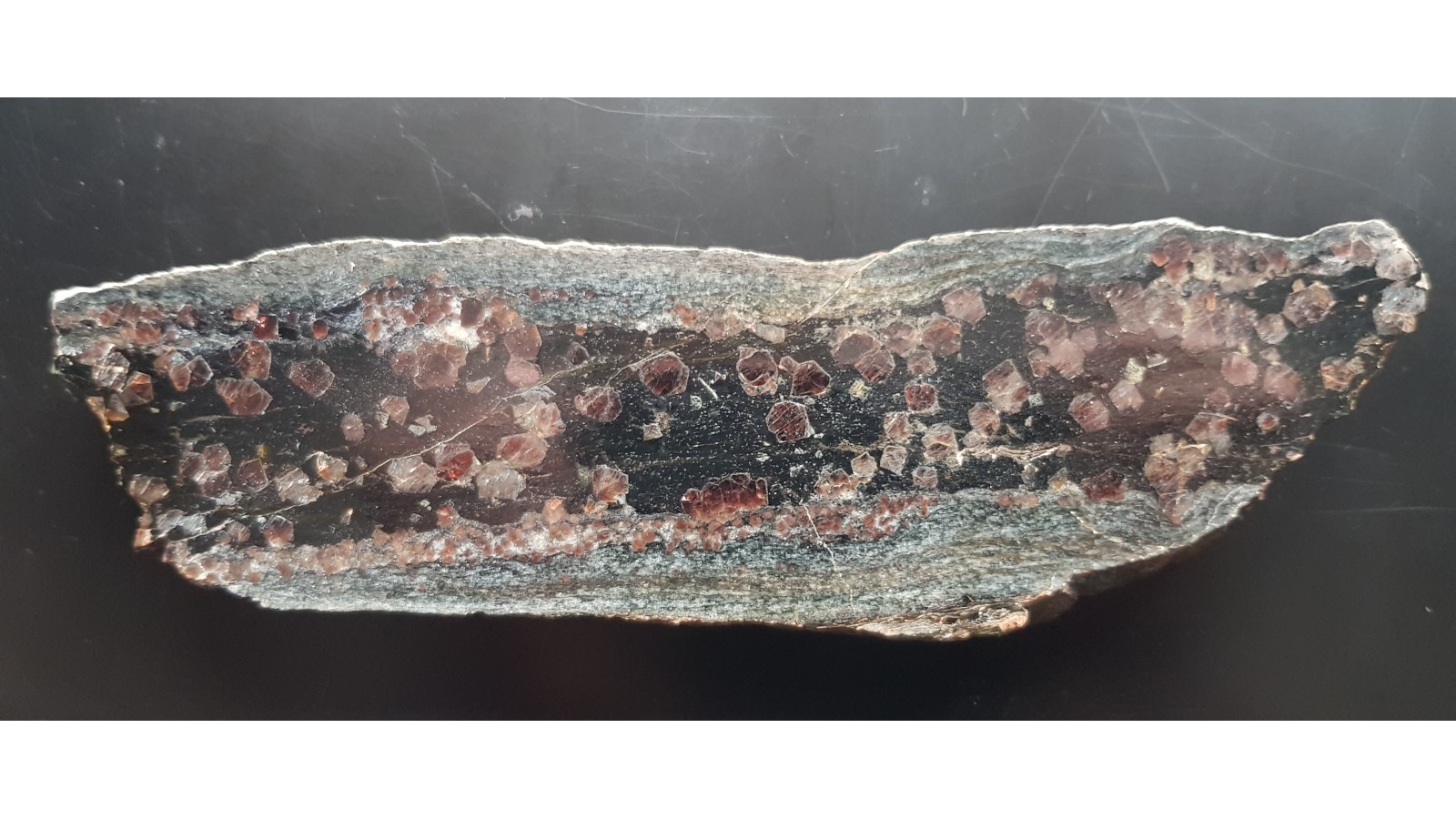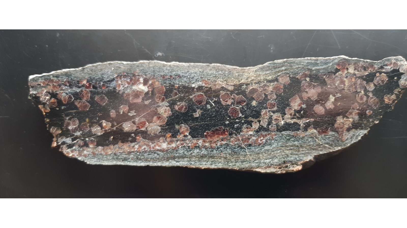 Polerowany okaz skały wypełnionej granatami i gahnitem a podrzędnie także minerałami kruszcowymi z Gierczyna z kopalni rud cyny (Pasmo Kamienieckie). Piękny, masywny okaz. Granaty przeświecające, niezwietrzałe, niespękane, czerwone. Idealny poler, strona przeciwna po cięciu. Polecam.