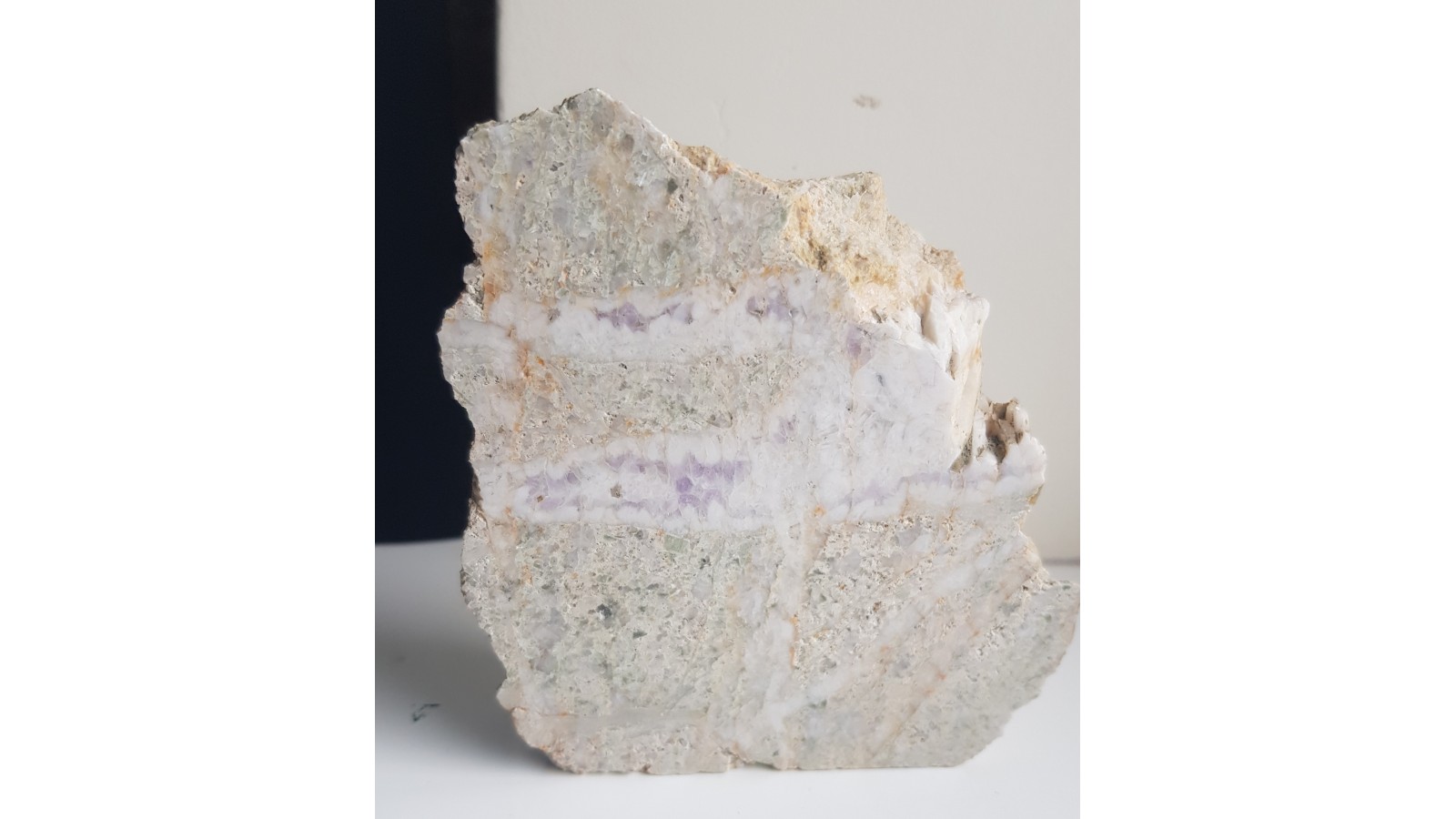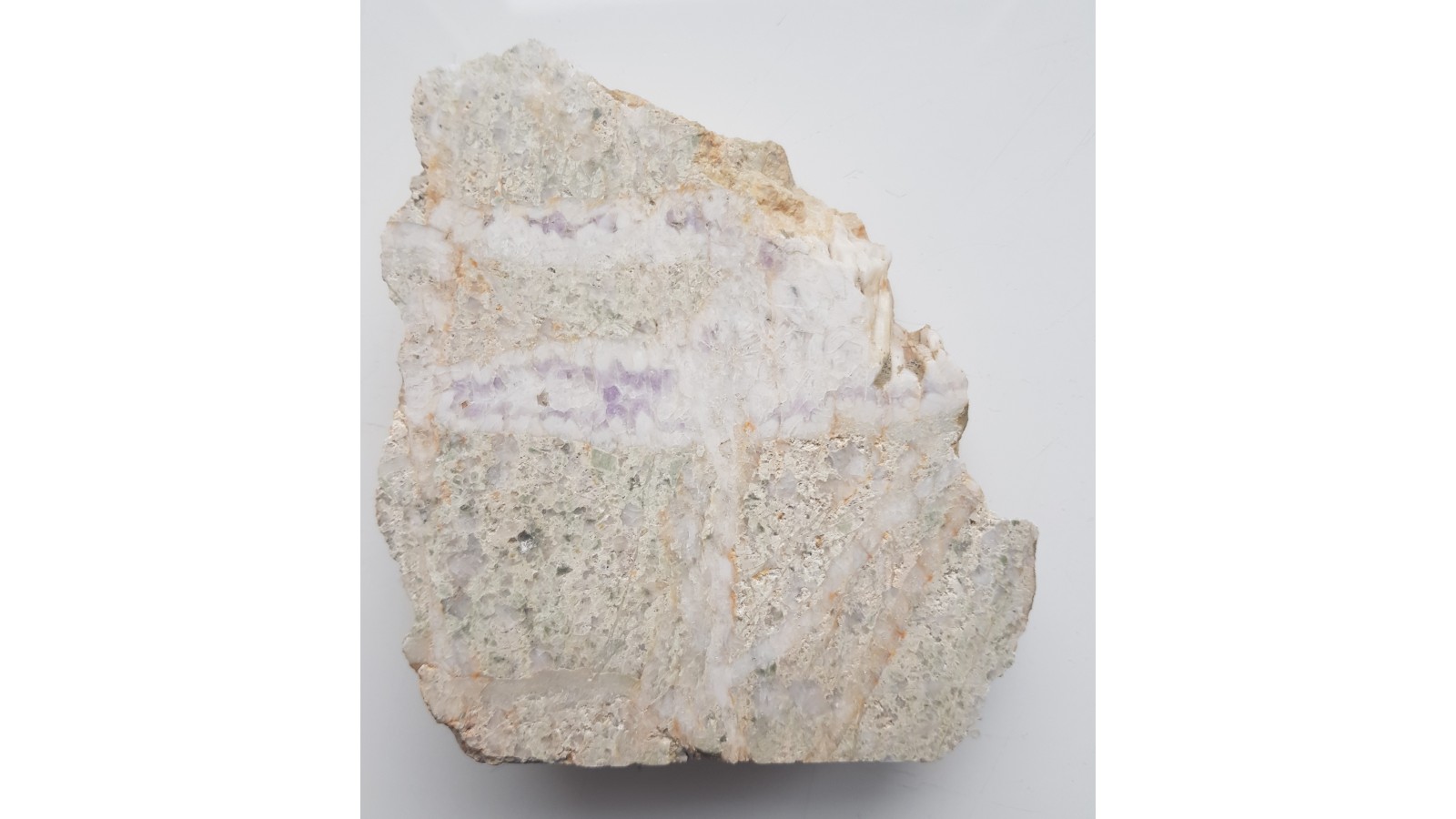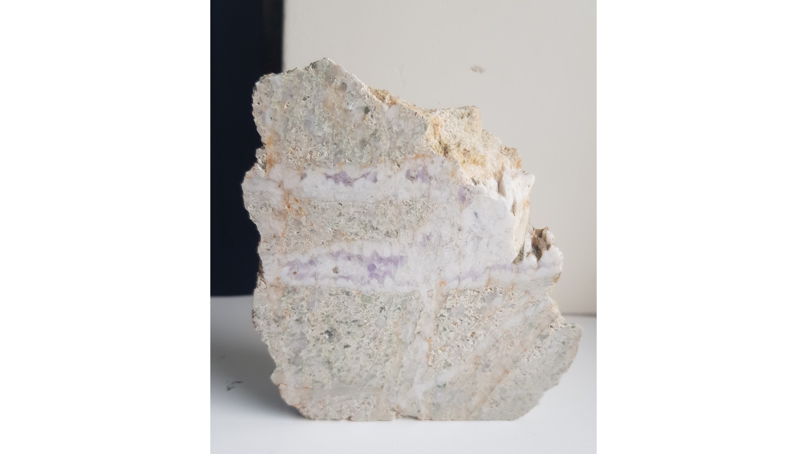 Polerowany okaz żyły kwarcowo-ametystowej z wystąpienia Białe Krowy (okolice Sadów k. Sobótki) w Masywie Ślęży. Dotąd nieznane wystąpienie ametystów w Masywie Ślęży. Ametyst występuje w żyle Białe Krowy bardzo lokalnie, jedynie w jednym małym łomiku, jako jedna z generacji kwarcu. Jego żyły przecinają zmieniony, nadwietrzały granit okolic Sobótki. Ciekawostka mineralogiczno-gemmologiczna. Unikatowe wystąpienie. Solidny okaz, piękny poler. Polecam.
