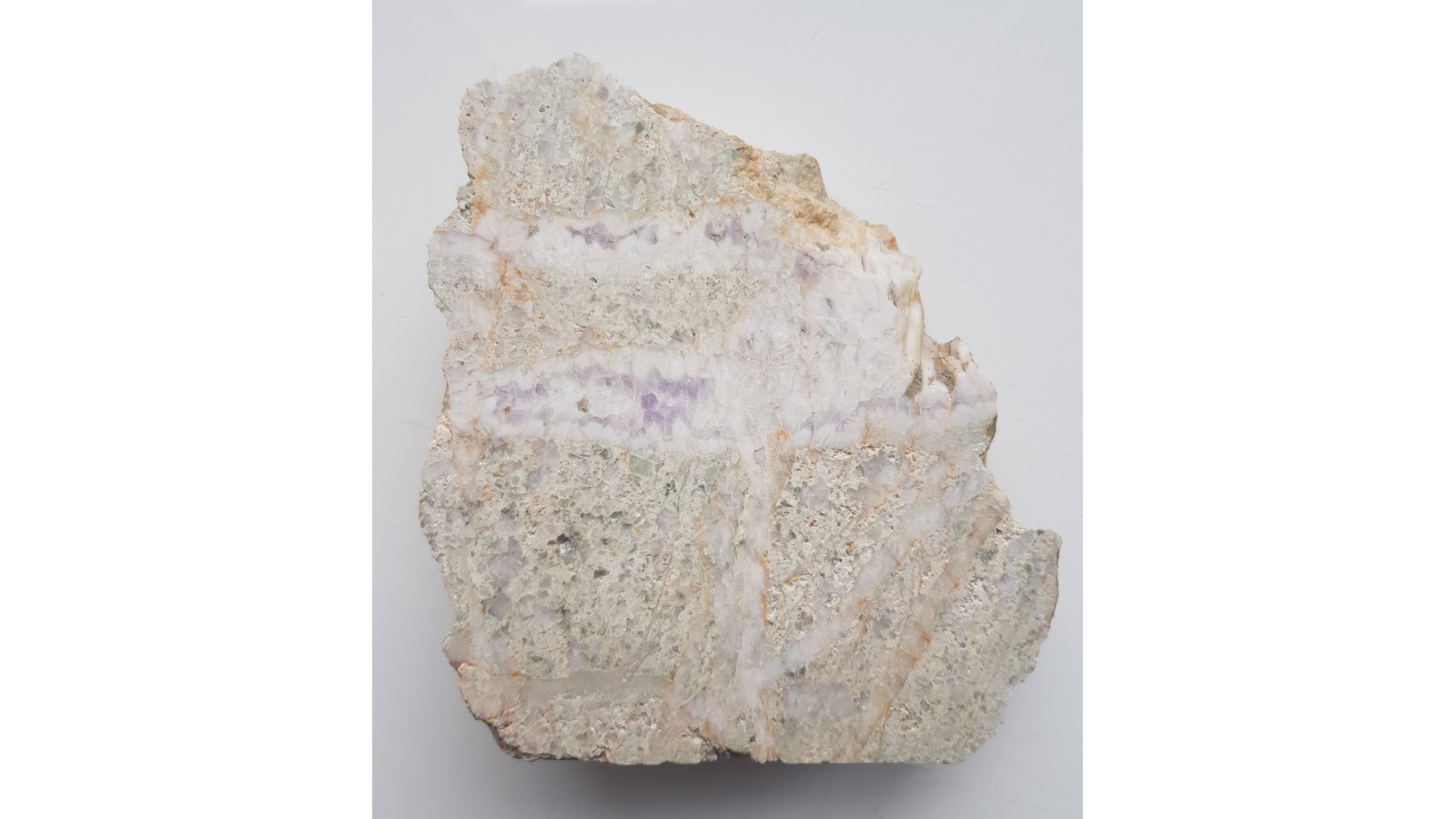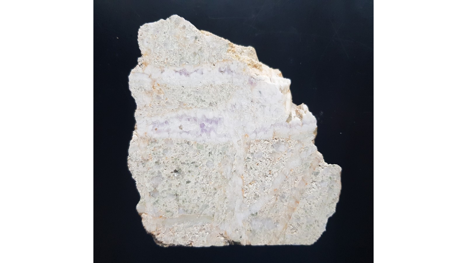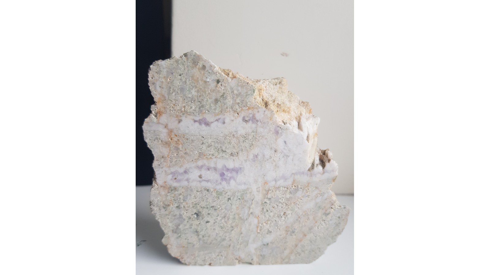 Polerowany okaz żyły kwarcowo-ametystowej z wystąpienia Białe Krowy (okolice Sadów k. Sobótki) w Masywie Ślęży. Dotąd nieznane wystąpienie ametystów w Masywie Ślęży. Ametyst występuje w żyle Białe Krowy bardzo lokalnie, jedynie w jednym małym łomiku, jako jedna z generacji kwarcu. Jego żyły przecinają zmieniony, nadwietrzały granit okolic Sobótki. Ciekawostka mineralogiczno-gemmologiczna. Unikatowe wystąpienie. Solidny okaz, piękny poler. Polecam.