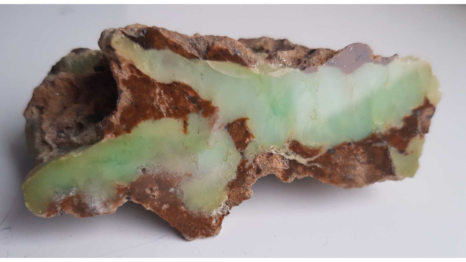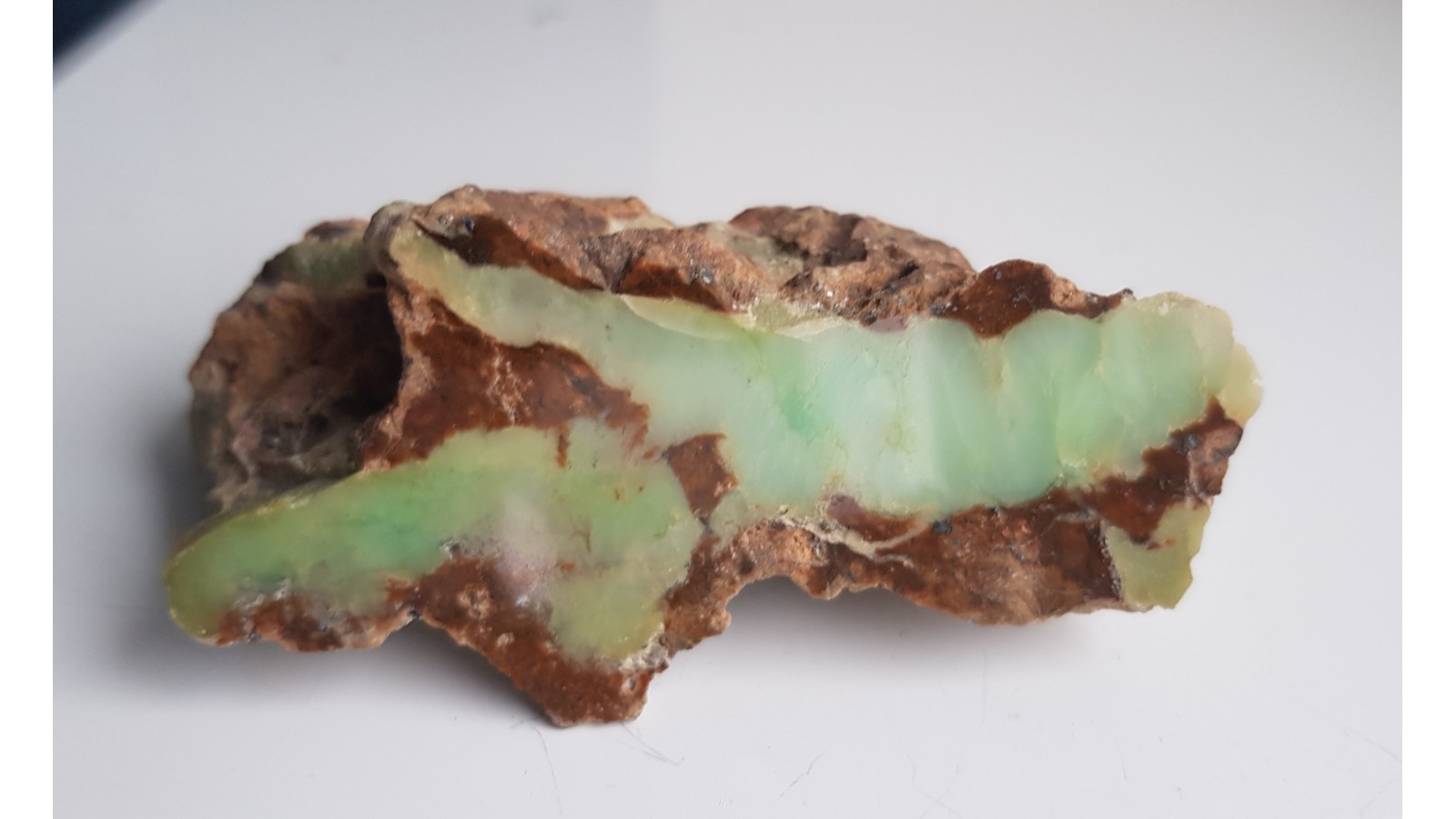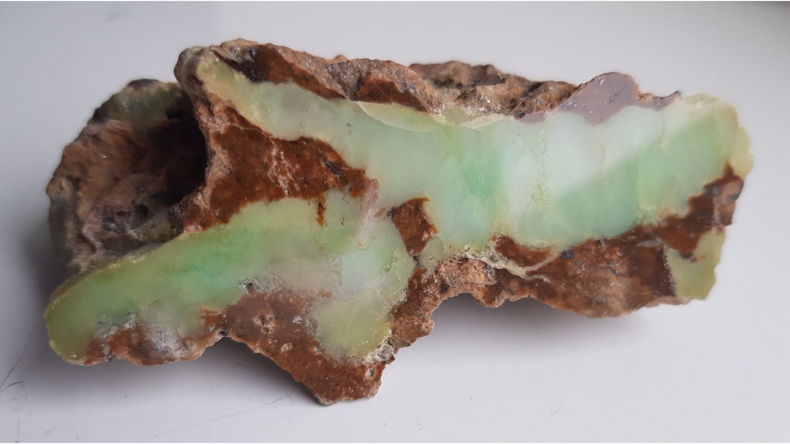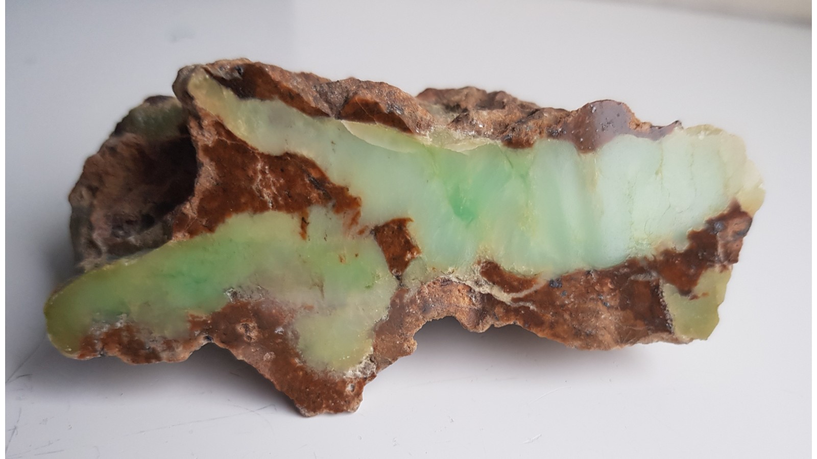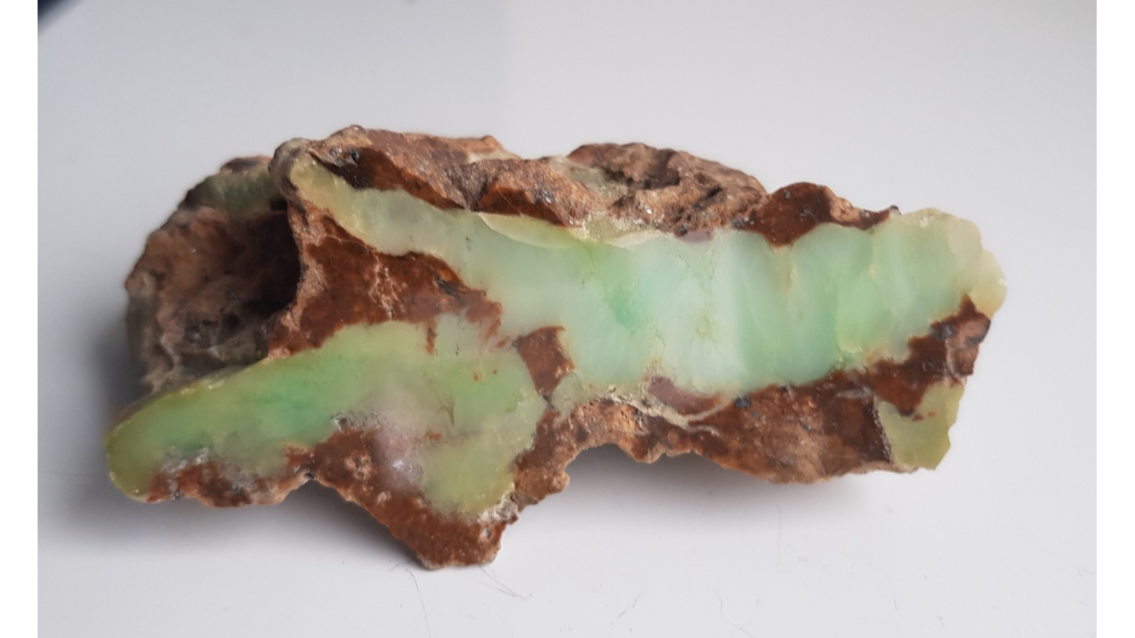 Polerowany okaz chryzoprazu ze Szklar. Pełny przekrój żyły z widocznymi granicami w serpentynicie. Idealny poler. Strona przeciwna naturalna, nie cięta. Polecam.