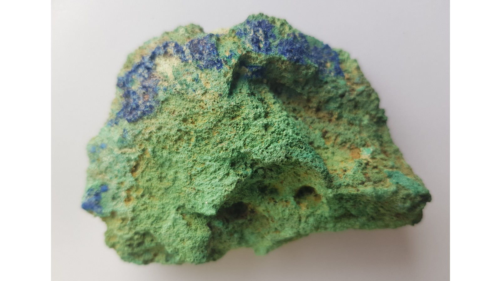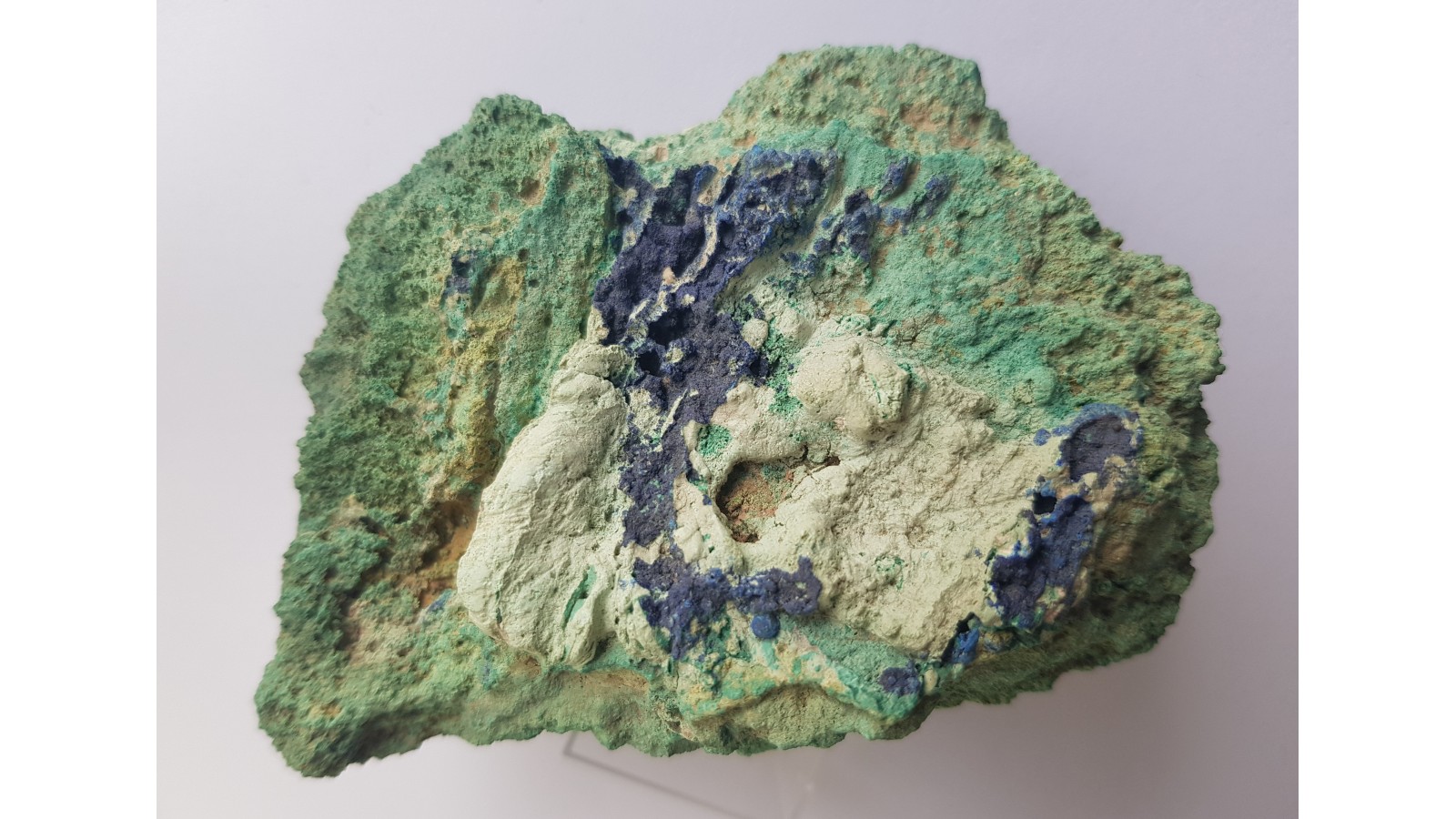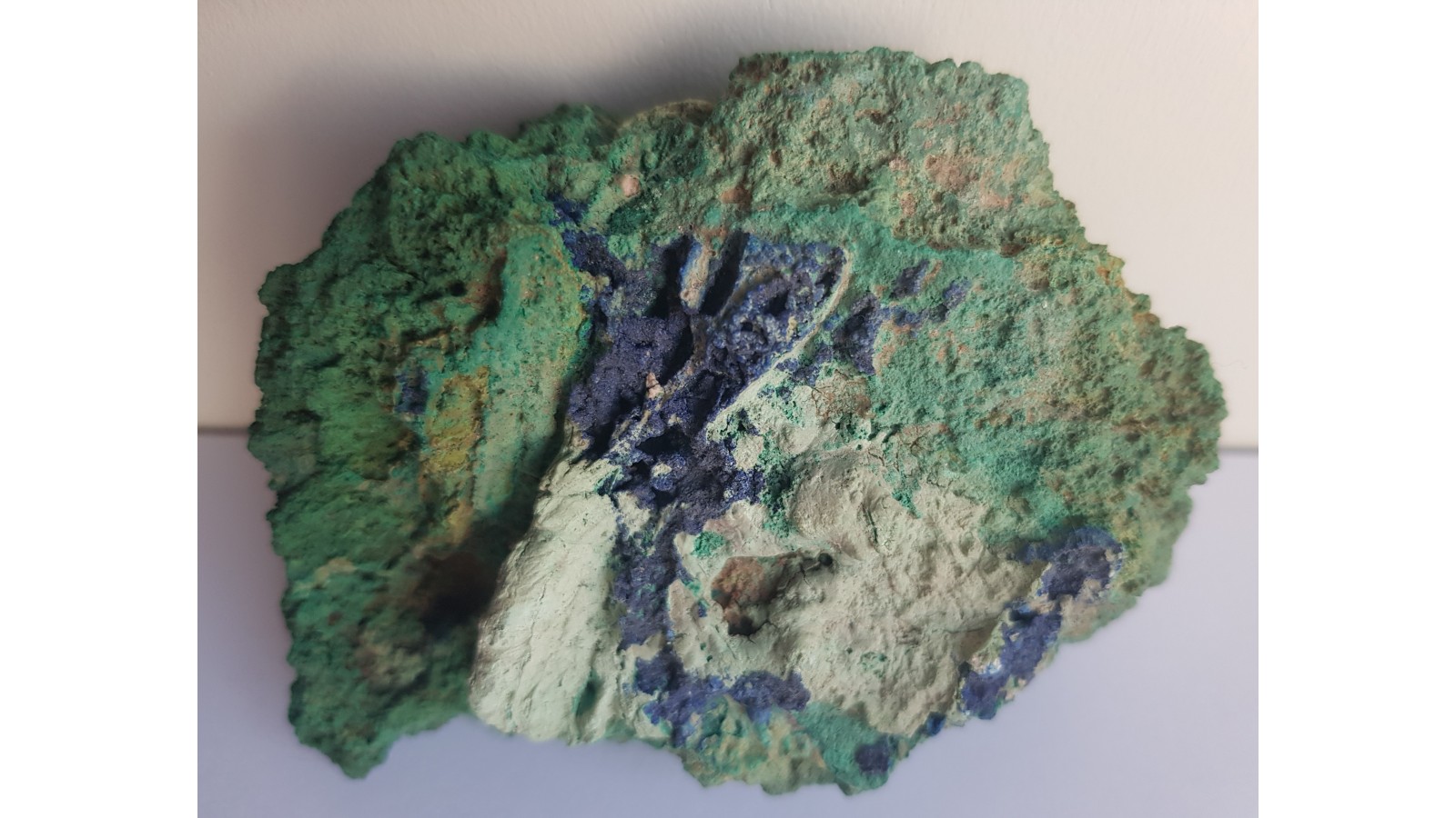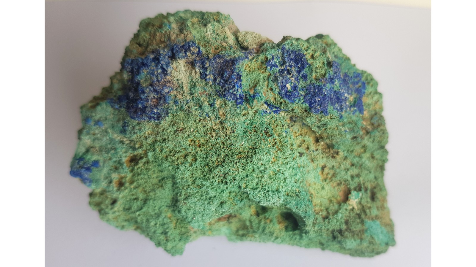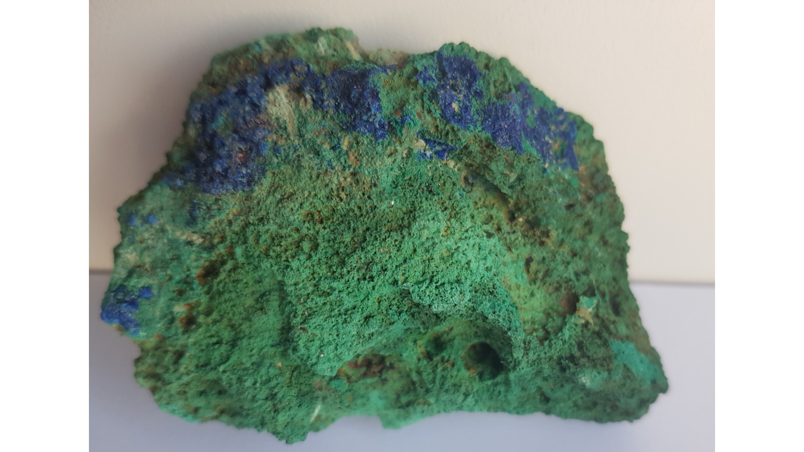 Pokaźny okaz malachitu i azurytu z Miedzianki w Górach Świętokrzyskich. Azuryt po obydwu stronach okazu. Okaz sprzed wielu lat. Polecam.