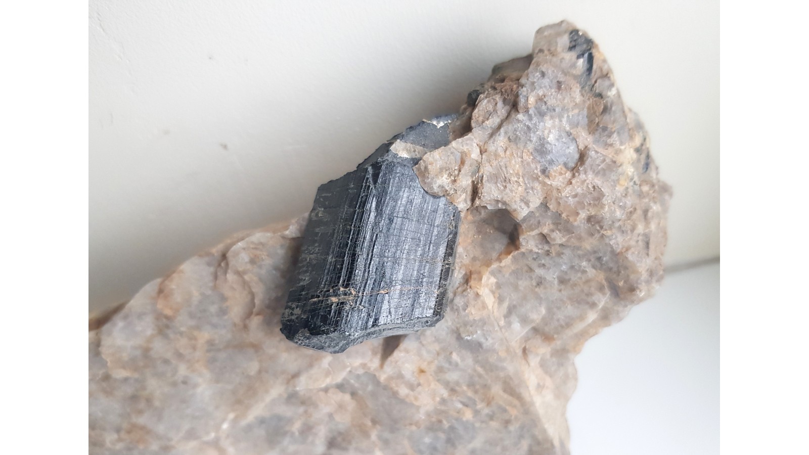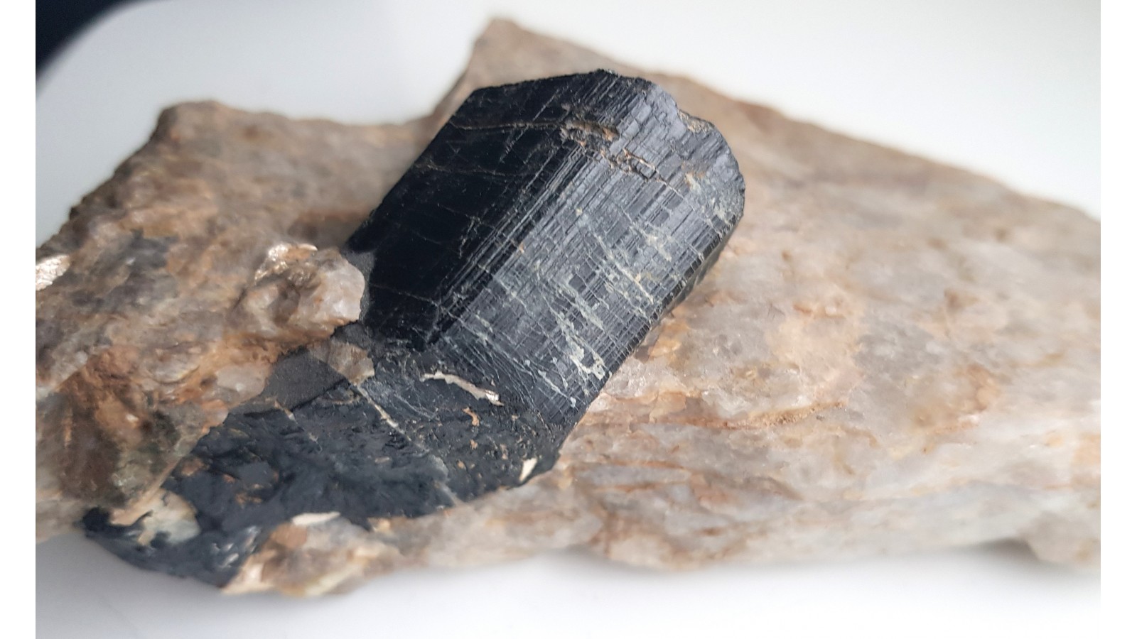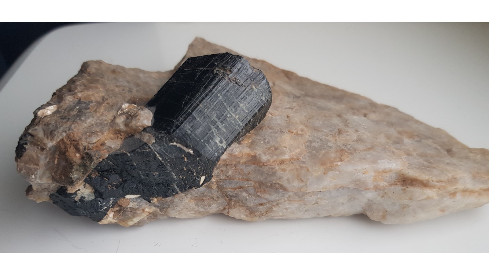 Masywny, niezwietrzały i błyszczący kryształ turmalinu z historycznej lokalizacji na Górze Winnej (Weinberg) w Bielawie, z odkrywki wykonanej celem eksploatacji pegmatytu. Sam kryształ średnicy około 3 cm i długości ponad 4 cm. Także drobne, igiełkowate kryształy berylu w pobliżu turmalinu. Estetyczny okaz z klasycznej lokalizacji. Polecam.