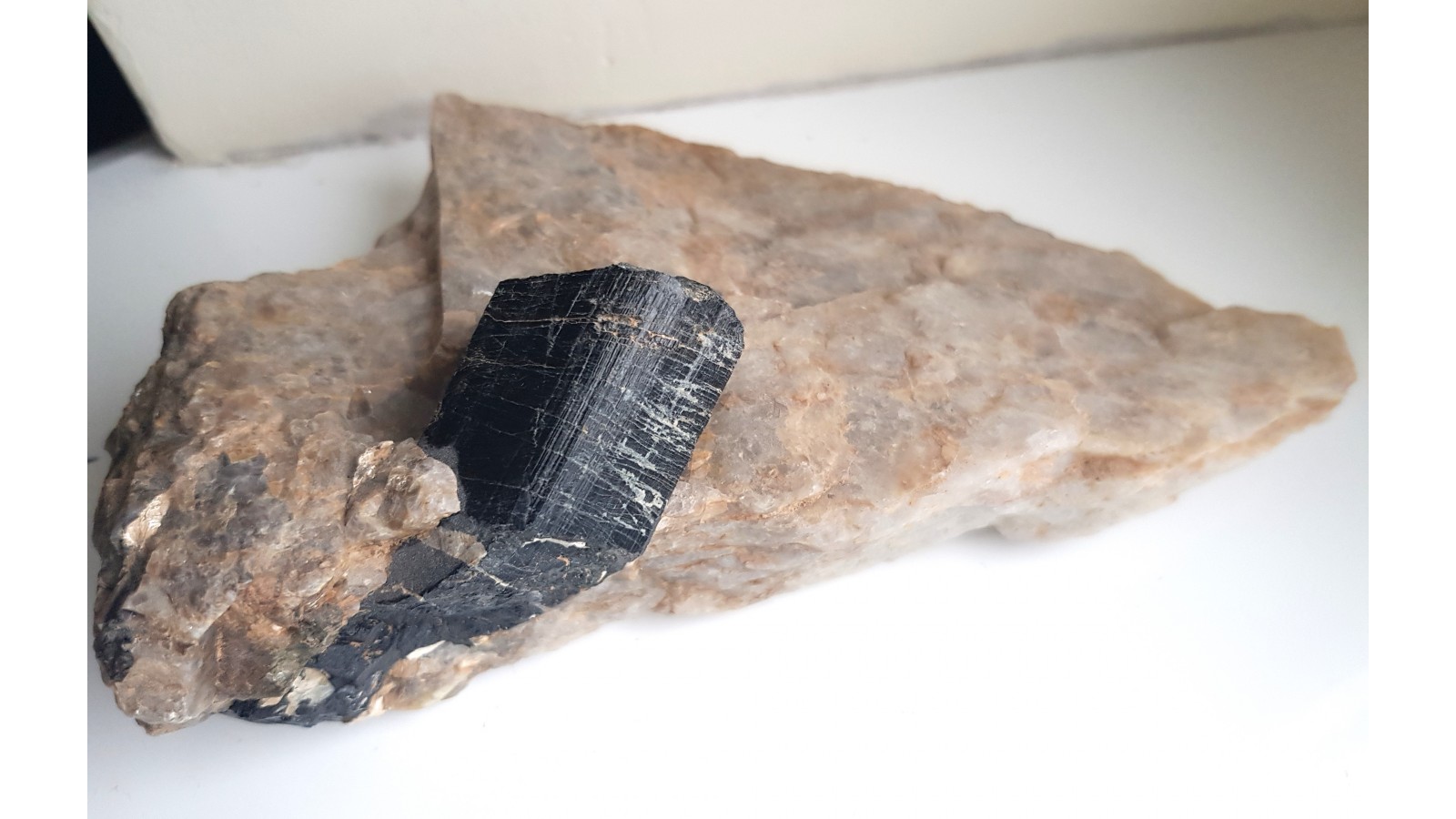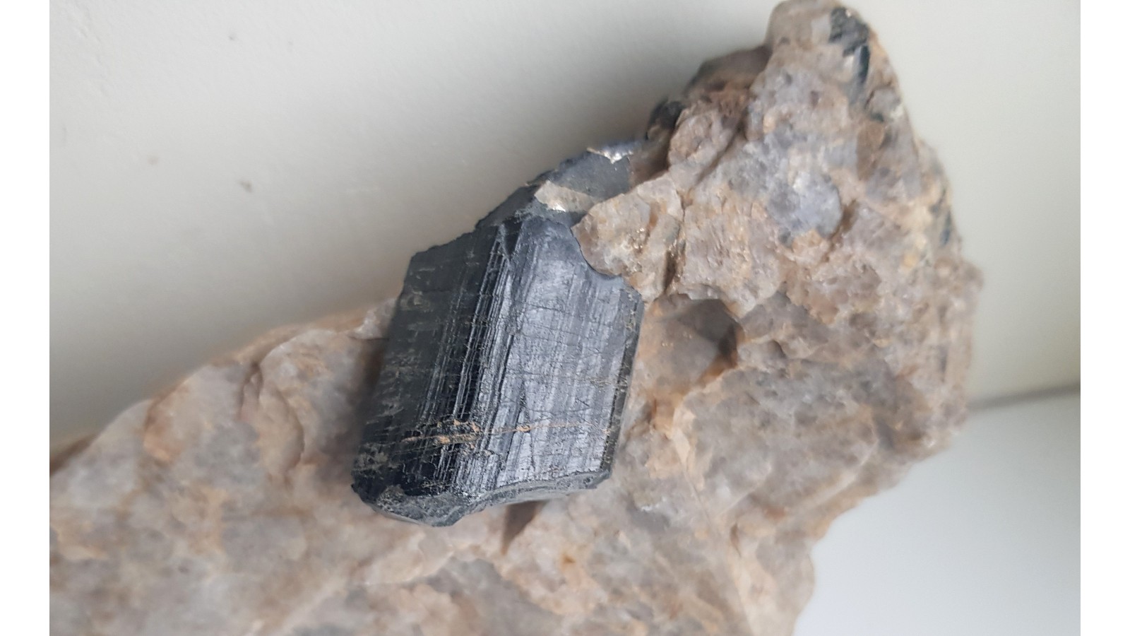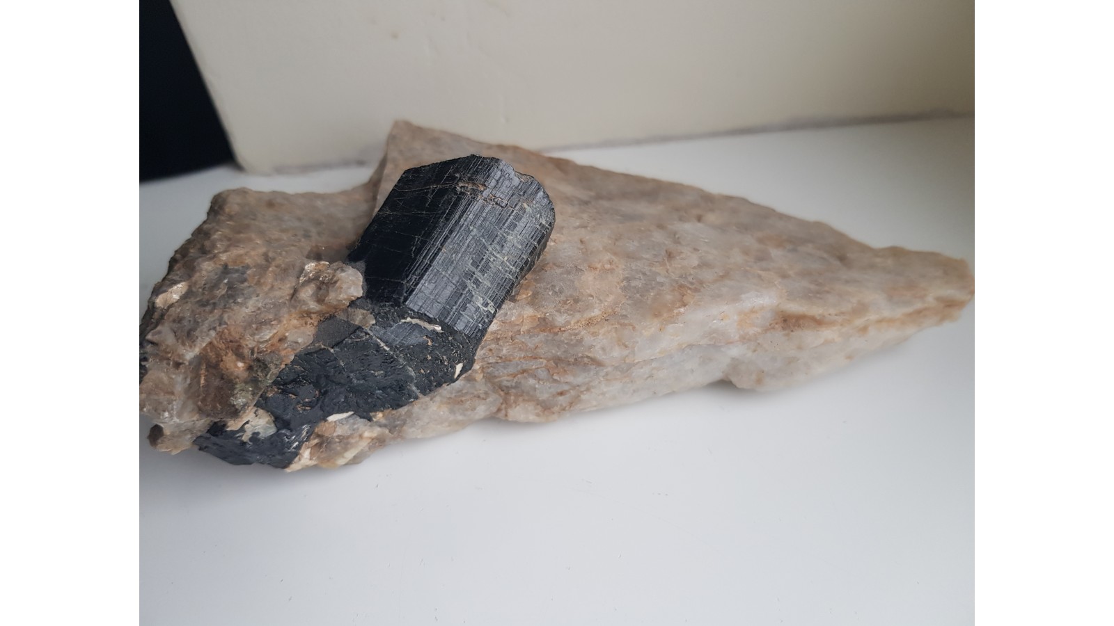 Masywny, niezwietrzały i błyszczący kryształ turmalinu z historycznej lokalizacji na Górze Winnej (Weinberg) w Bielawie, z odkrywki wykonanej celem eksploatacji pegmatytu. Sam kryształ średnicy około 3 cm i długości ponad 4 cm. Także drobne, igiełkowate kryształy berylu w pobliżu turmalinu. Estetyczny okaz z klasycznej lokalizacji. Polecam.