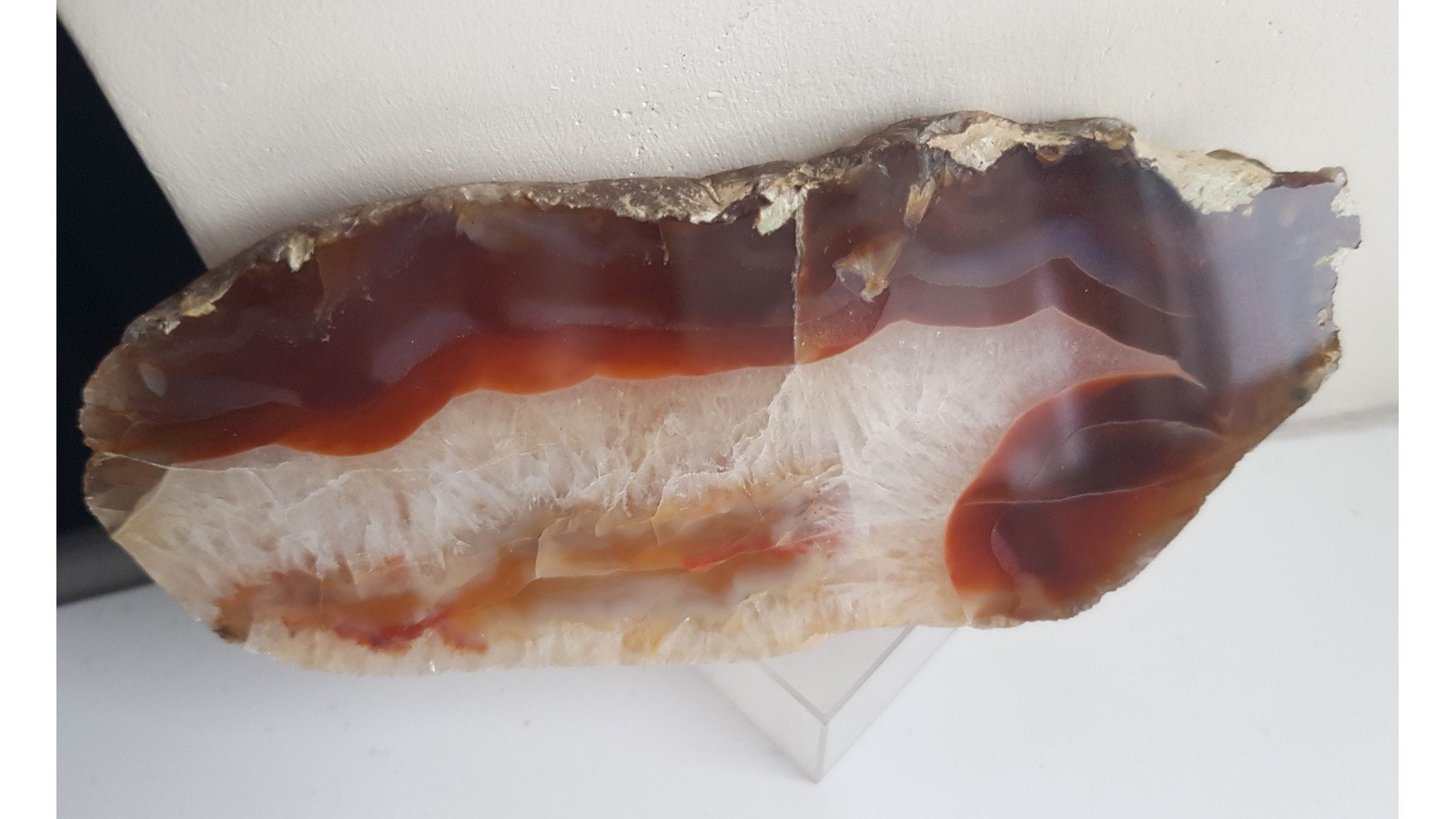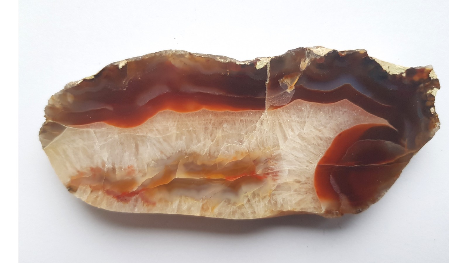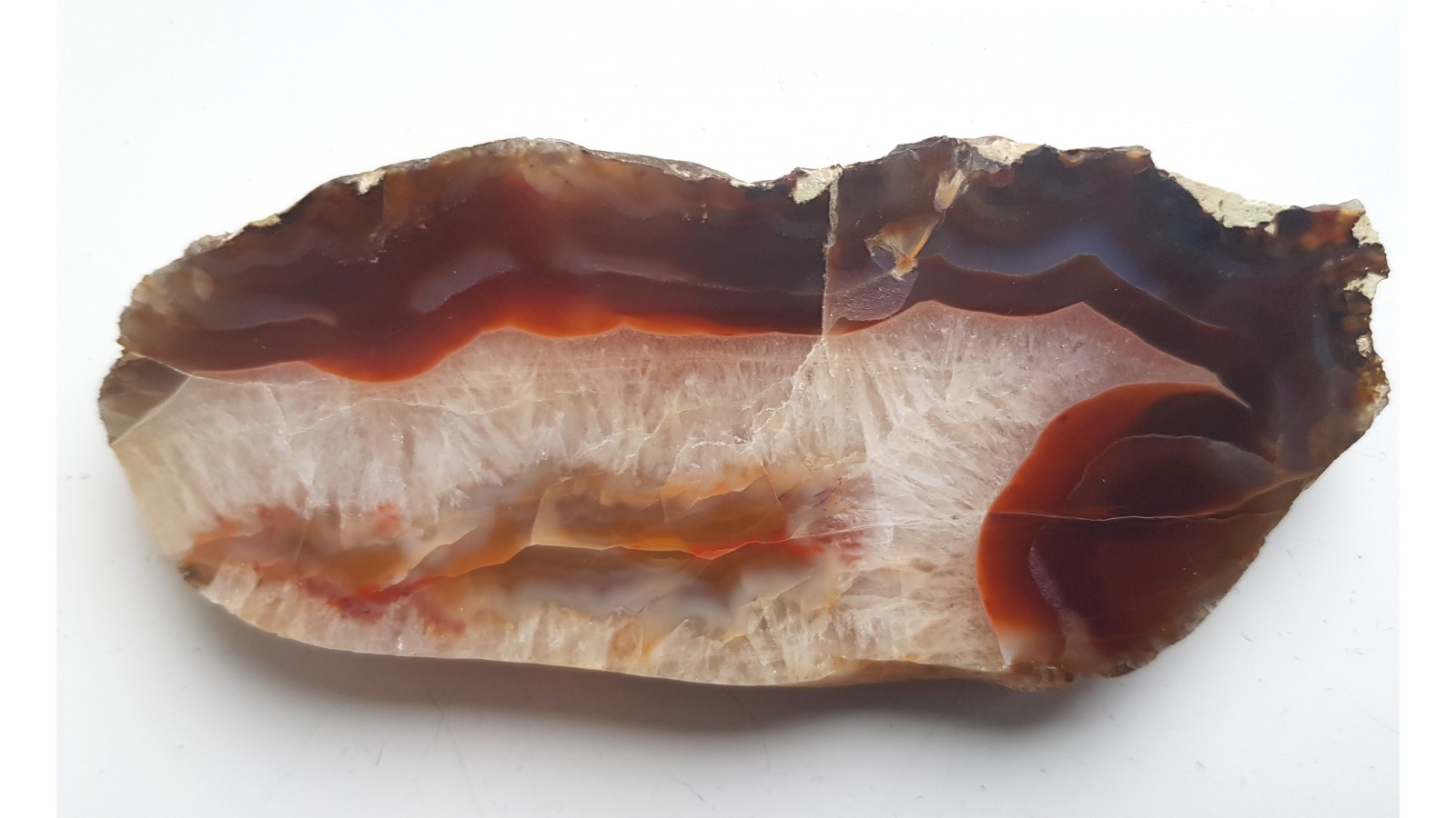 Piękny okaz karneolu-agatu z aluwiów Bobru okolic Lwówka Śląskiego. Strefa krustalna z kryształu górskiego. Strefa agatowa czerwono-miodowa, przeświecająca. Strona tylna po cięciu. Wspaniała barwa, doskonały poler. Polecam.