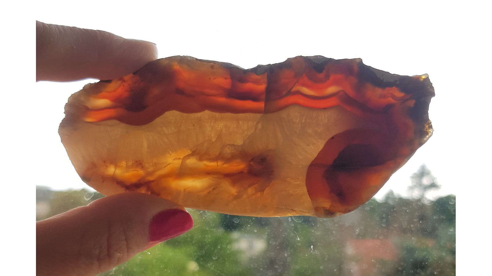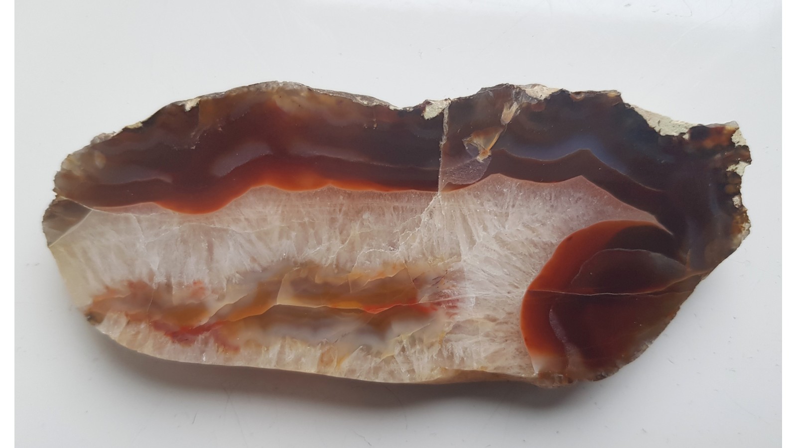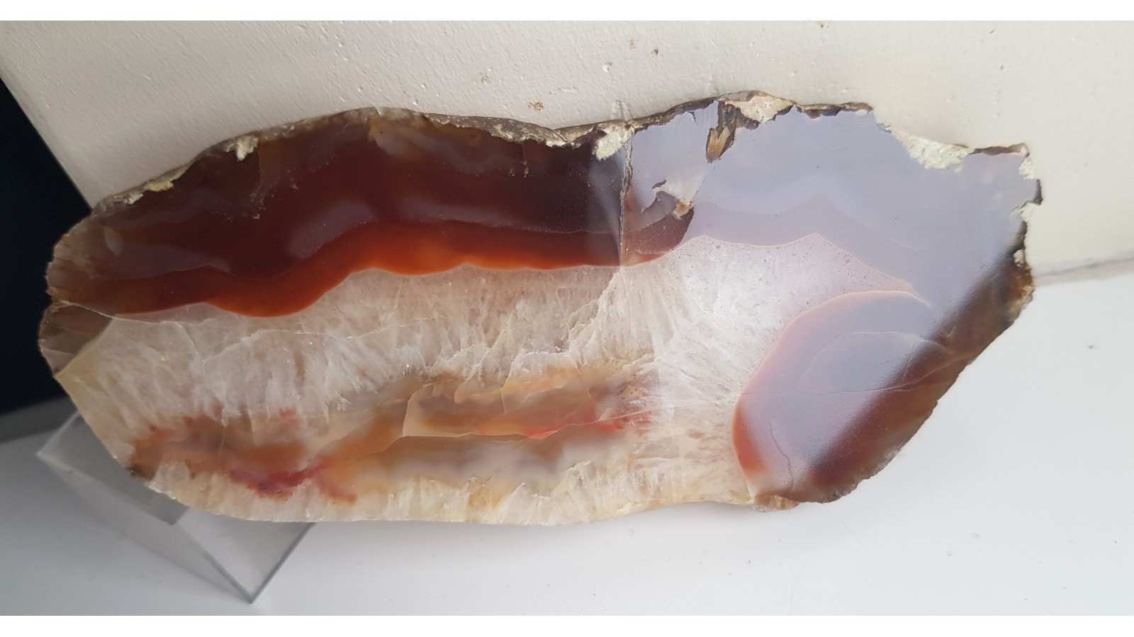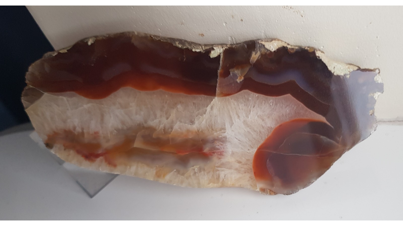 Piękny okaz karneolu-agatu z aluwiów Bobru okolic Lwówka Śląskiego. Strefa krustalna z kryształu górskiego. Strefa agatowa czerwono-miodowa, przeświecająca. Strona tylna po cięciu. Wspaniała barwa, doskonały poler. Polecam.