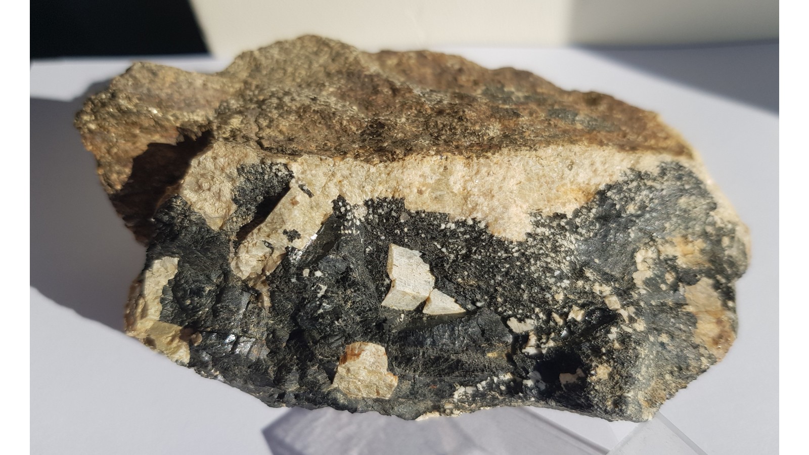 Wyjątkowy okaz krystalicznego apatytu wrośniętego w turmalin z pegmatytów okolic Kietlic k. Bielawy. Główny kryształ ok. co najmniej 1 cm średnicy, pozostałe także podobnej wielkości. Główny kryształ absolutnie cały, ze ściankami, nieuszkodzony, pozostałe z naturalnymi brakami, tak, jak wydobyto. Unikat. Apatyty z żółtoróżowawą fluorescencją w UV 255 nm. Polecam.