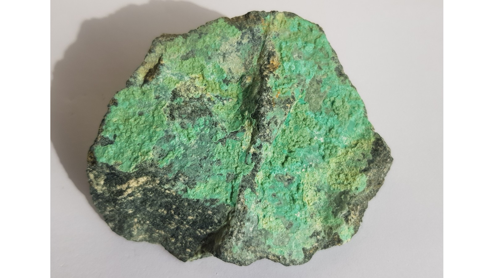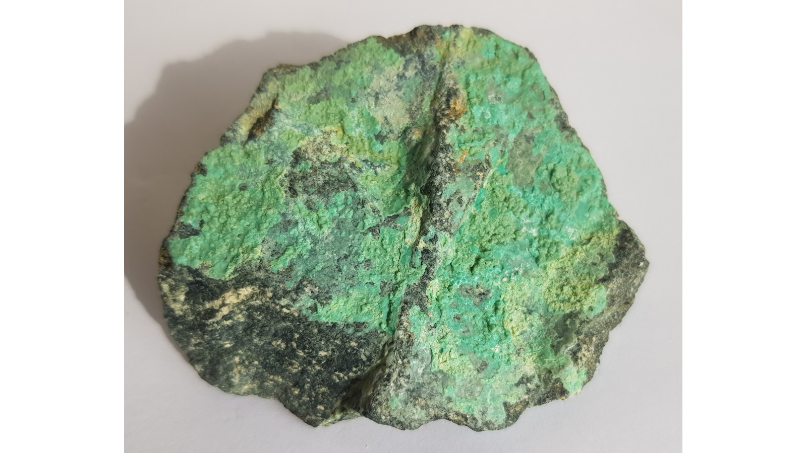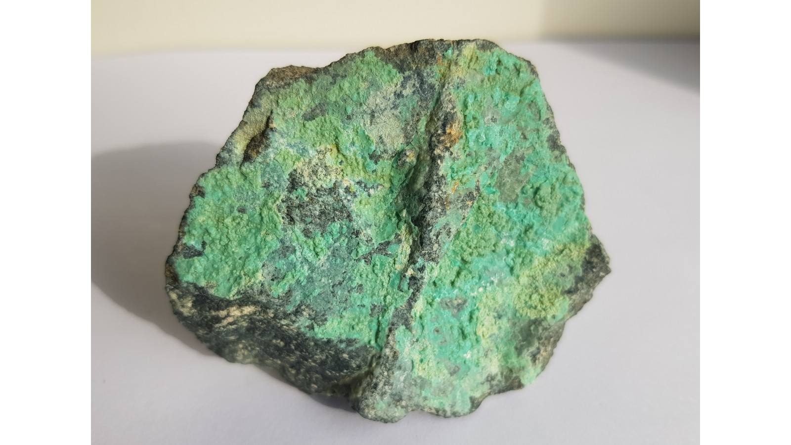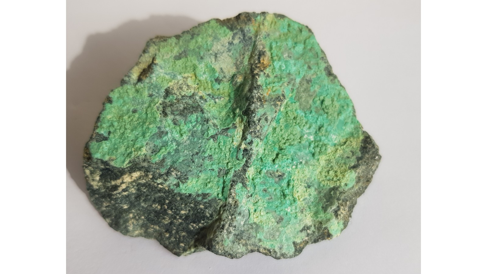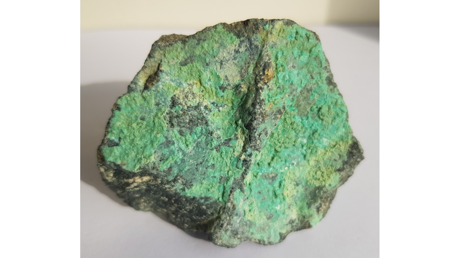 Okaz niklowego kerolitu (pimelitu) o intensywnej, zielonej barwie jako groniaste powłoki na skale macierzystej z Grochowej k. Ząbkowic śląskich. Nie kruchy, obrasta okaz z każdej strony. Polecam.