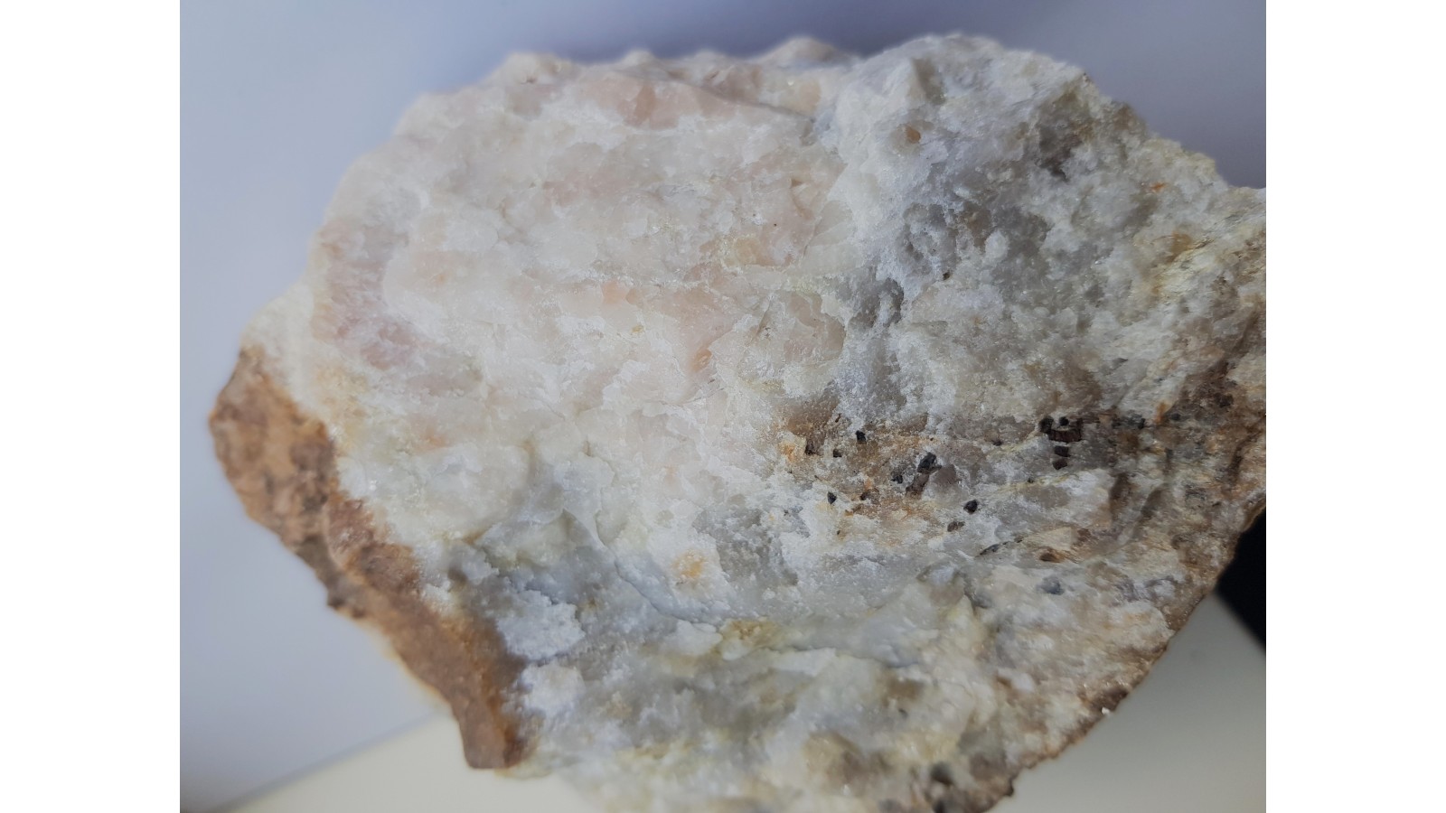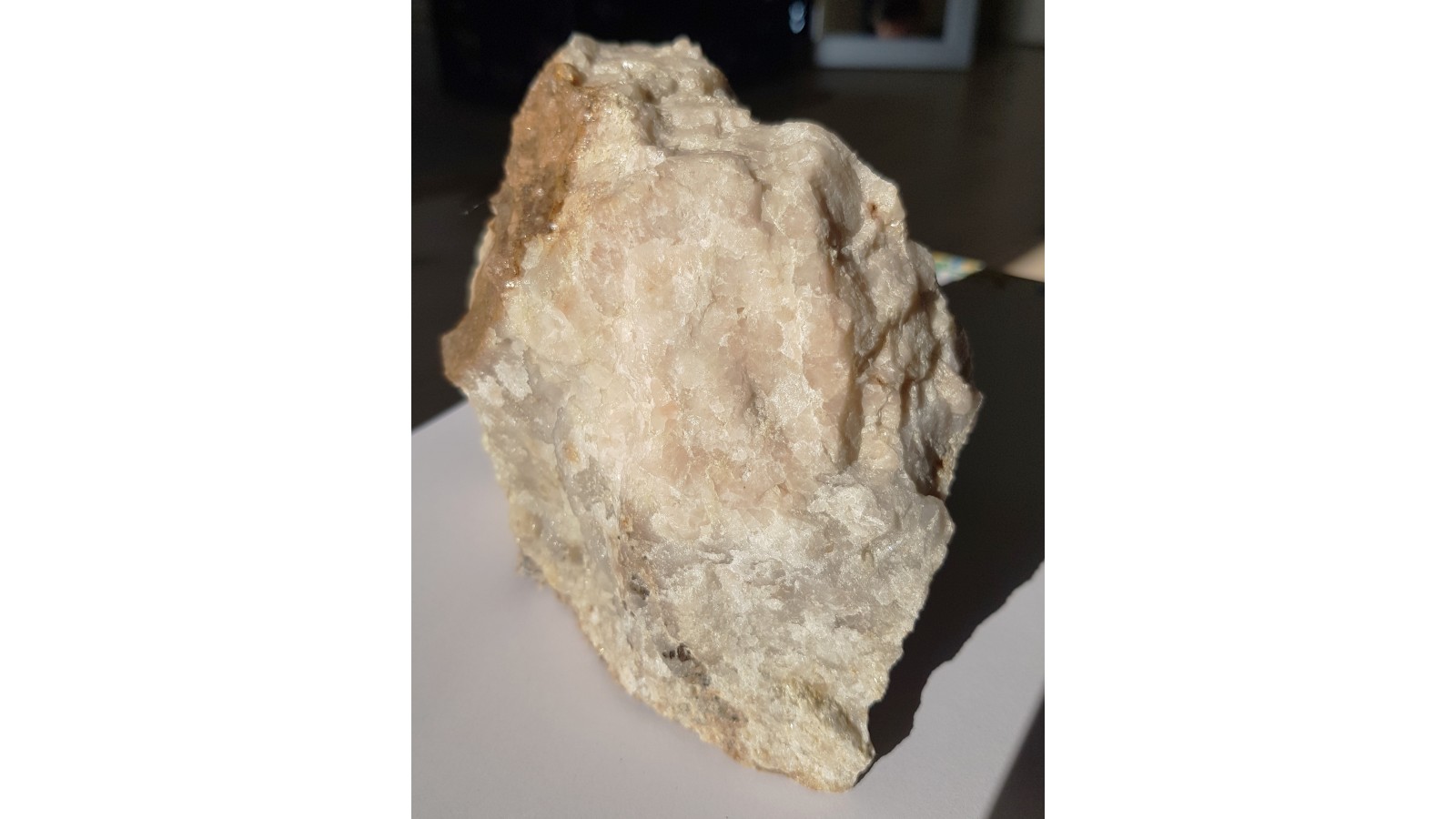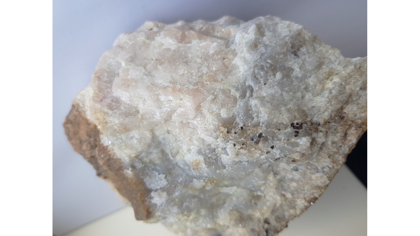 Duży, spektakularny okaz skały topazowo-kwarcowej z dużymi skupieniami grubokrystalicznego różowego topazu w kwarcu. Także liczne ciemne ziarna wolframitu wrośnięte w skałę i doskonale widoczne na jej jasnym tle. Okaz ze Wzgórza Wyrwak k. Mirska. Interesująca barwa skały, która zazwyczaj jest w tej lokalizacji całkowicie biała bądź bezbarwna. Polecam.