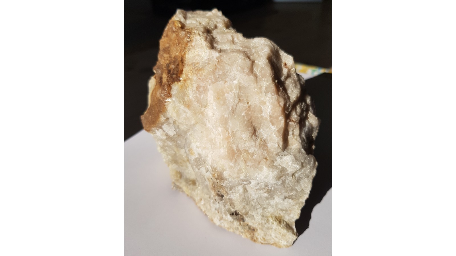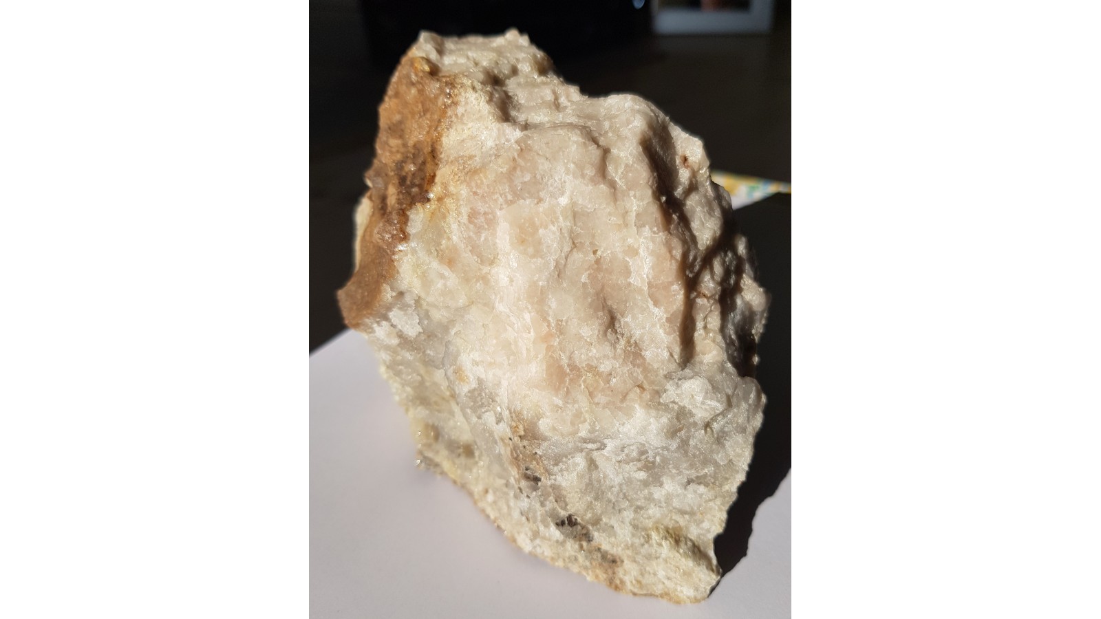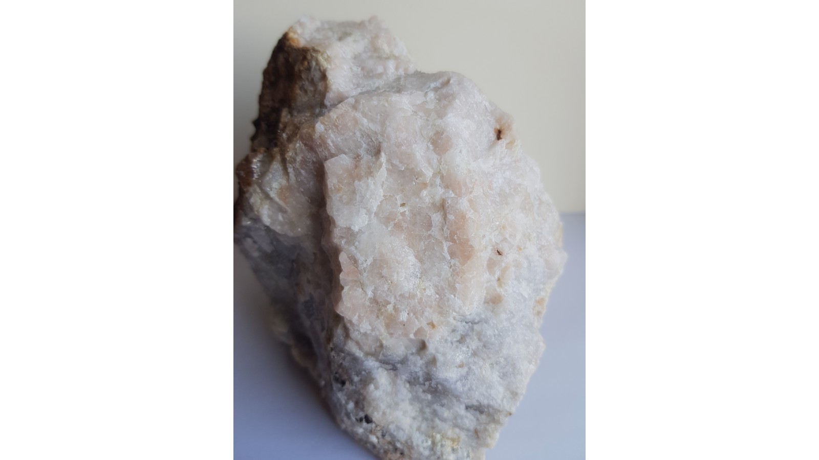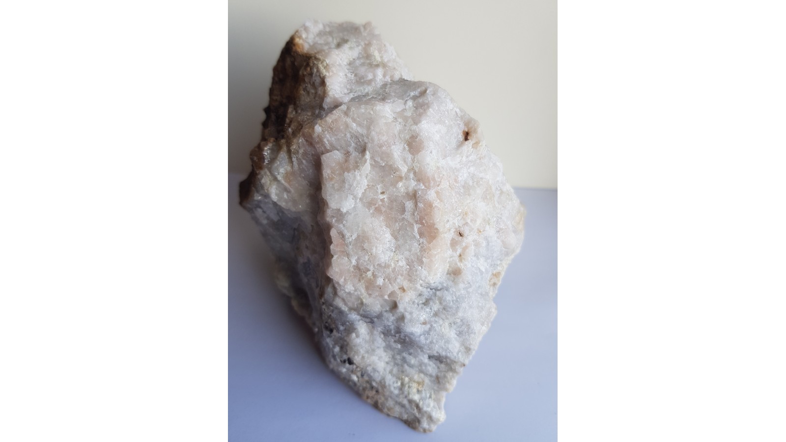 Duży, spektakularny okaz skały topazowo-kwarcowej z dużymi skupieniami grubokrystalicznego różowego topazu w kwarcu. Także liczne ciemne ziarna wolframitu wrośnięte w skałę i doskonale widoczne na jej jasnym tle. Okaz ze Wzgórza Wyrwak k. Mirska. Interesująca barwa skały, która zazwyczaj jest w tej lokalizacji całkowicie biała bądź bezbarwna. Polecam.