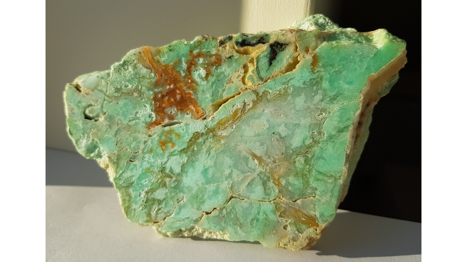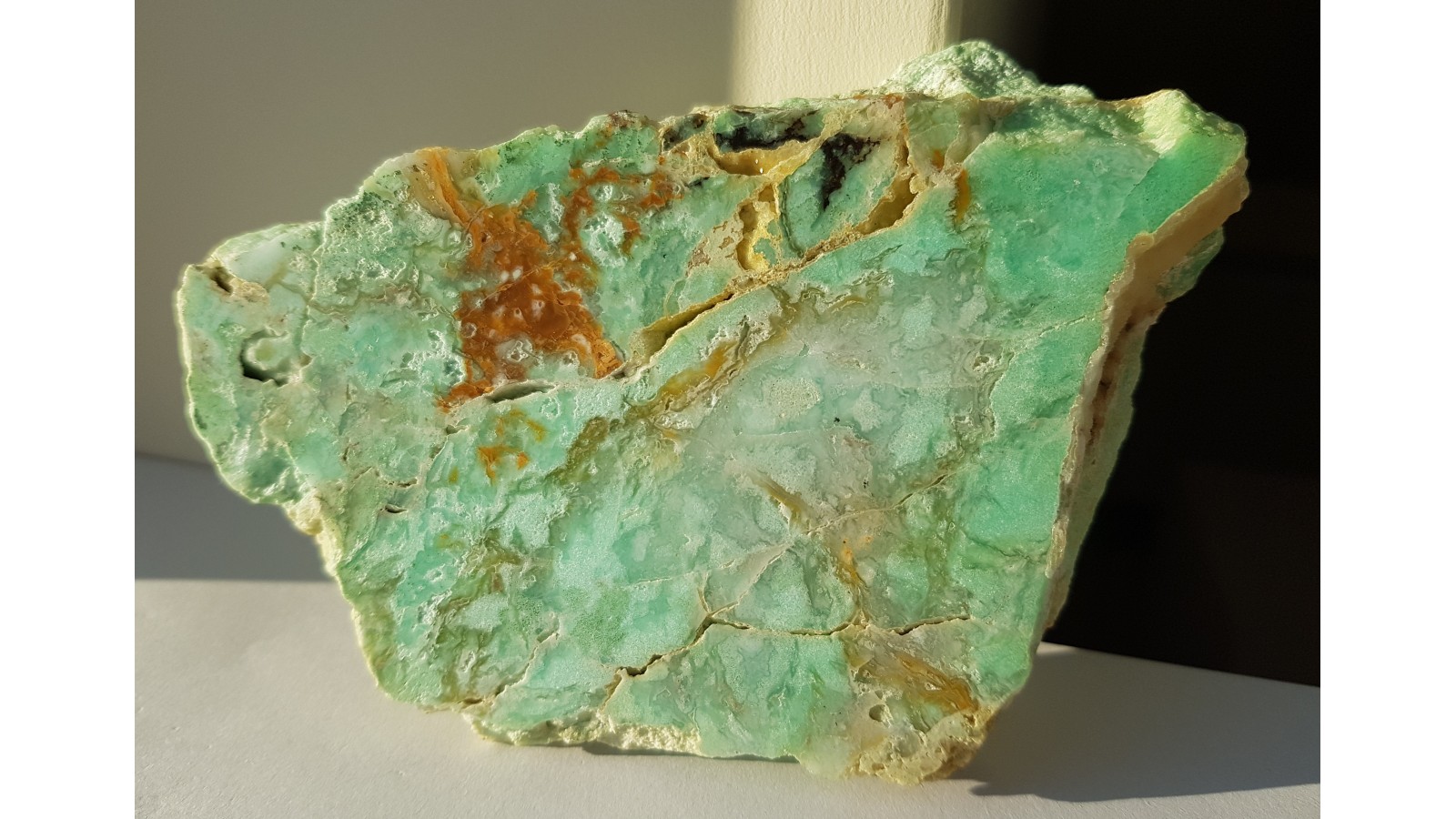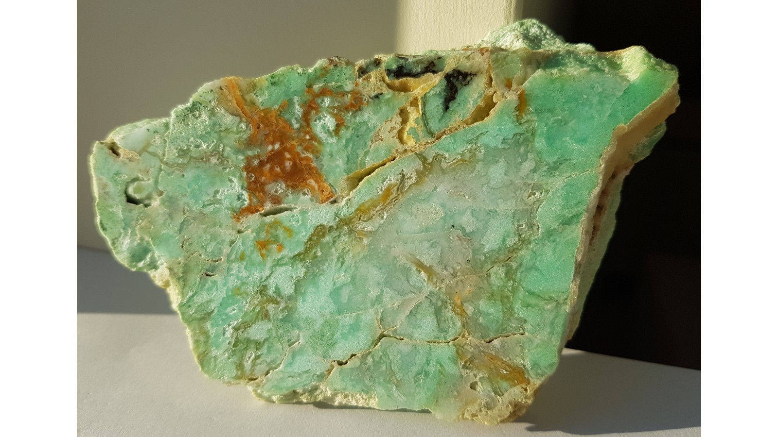 Chryzopraz z Wirów k. Sobótki w Masywie Ślęży. Okaz polerowany jednostronnie, strona przeciwna naturalna, nie cięta. Polecam.