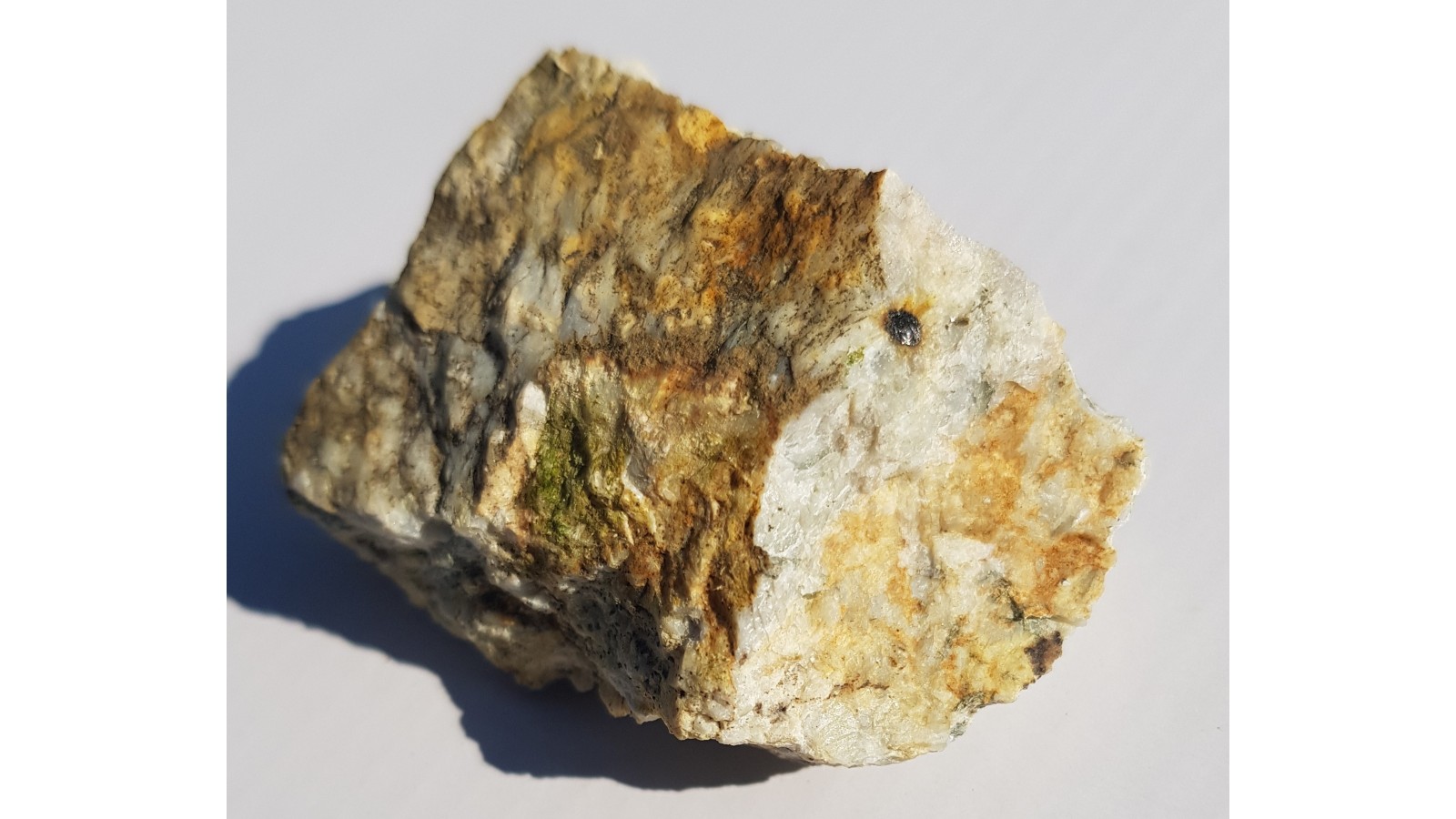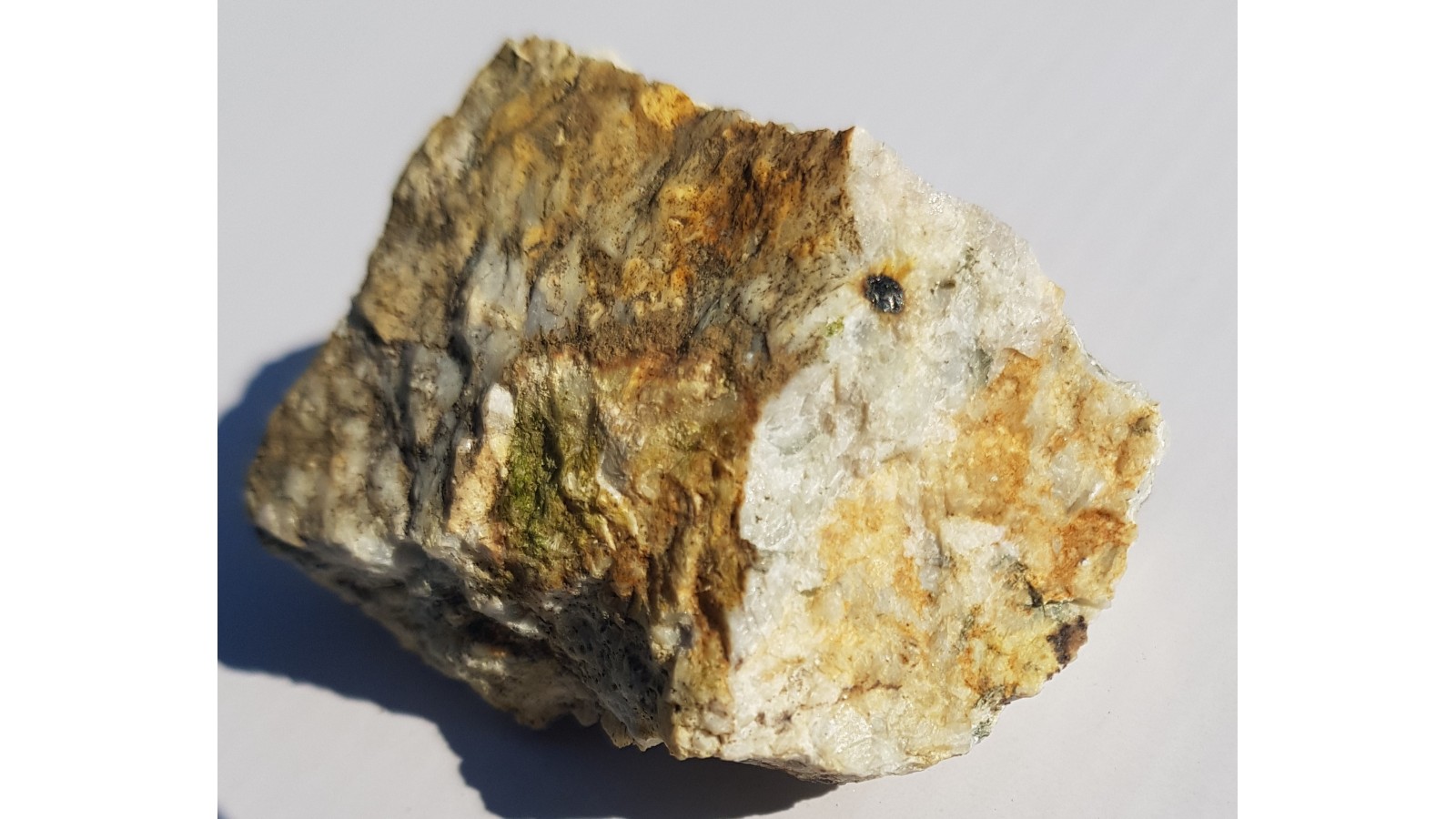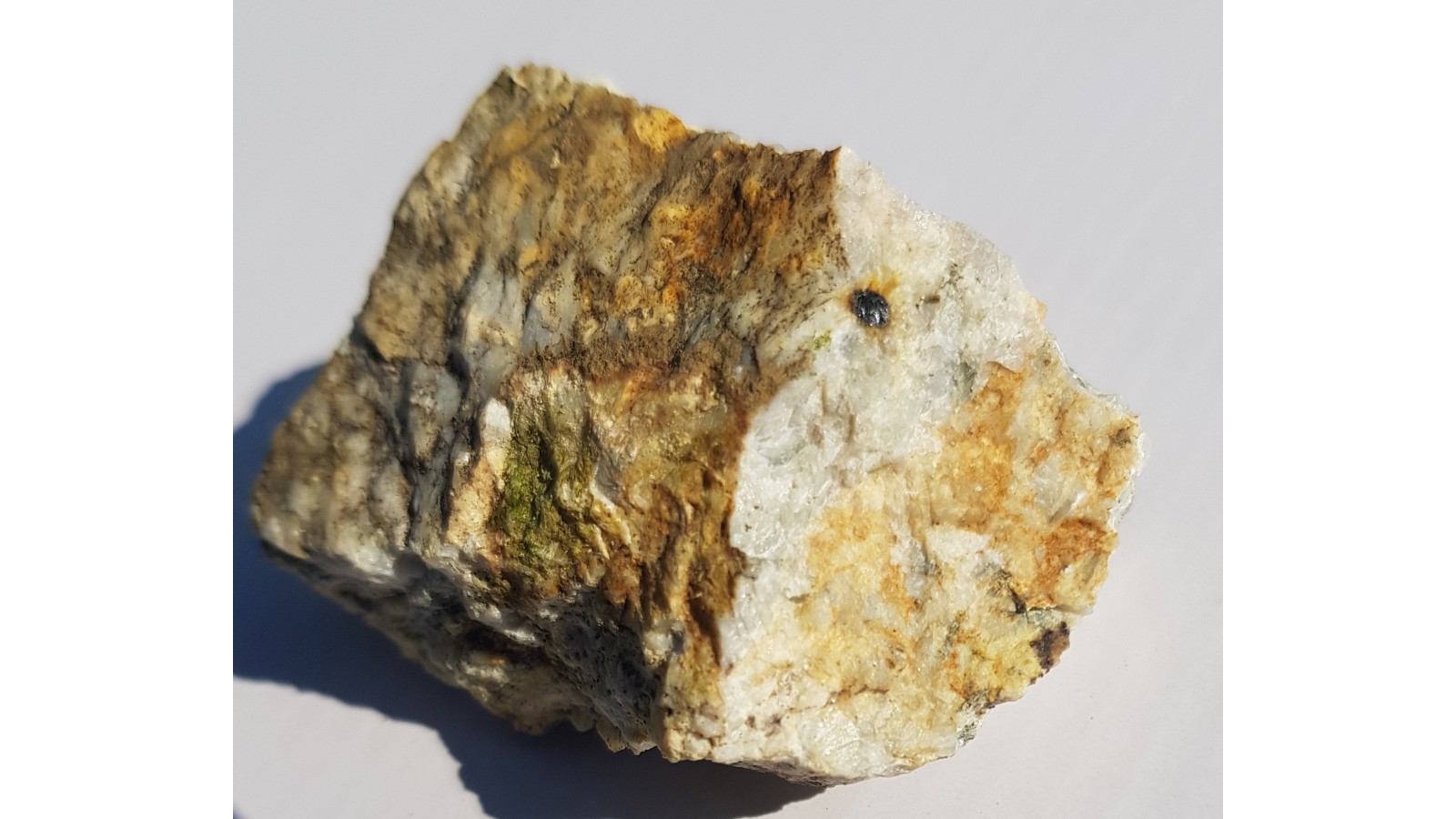 Allanit (minerał z grupy epidotów z zawartością Ce i innych REE) o smolistej, czarnej barwie wrośnięty w pegmatyt z Koźmic, wzgórze Strach. Doskonale widoczny, sam allanit ok. 3 mm średnicy, świeży, rzadkość. Polecam.