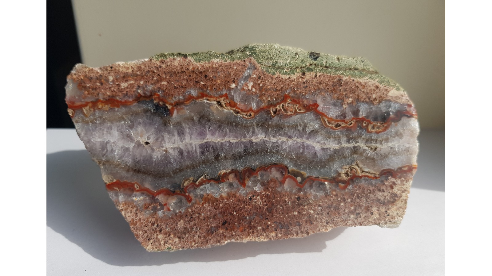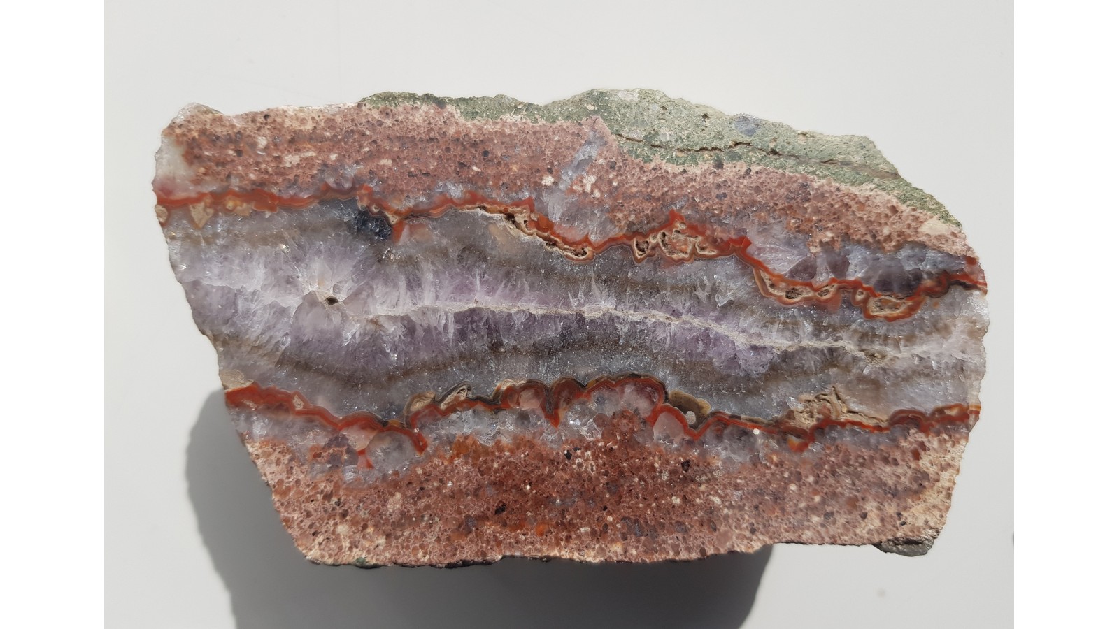 Masywny i bardzo estetyczny okaz żyły ametystowej w ryolicie z Gozdna w G. Kaczawskich. Okaz polerowany jednostronnie. Strona przeciwna naturalna, z małą kawerną z kryształami ametystów. Polecam.