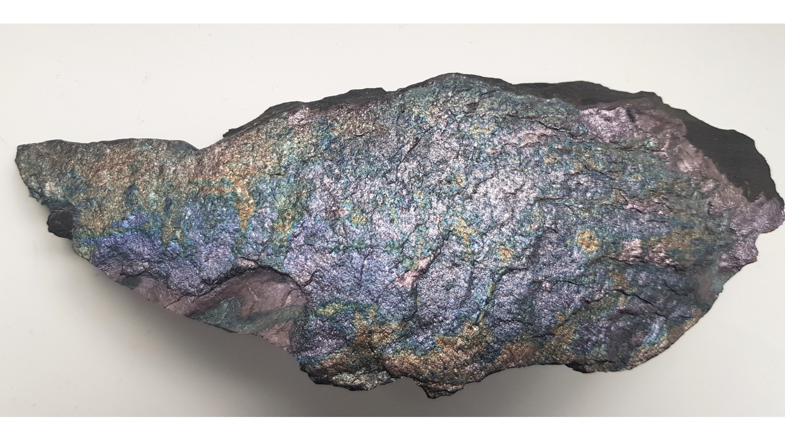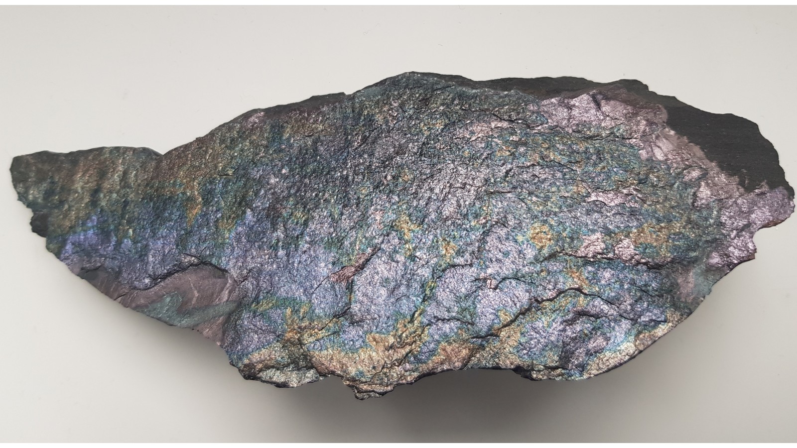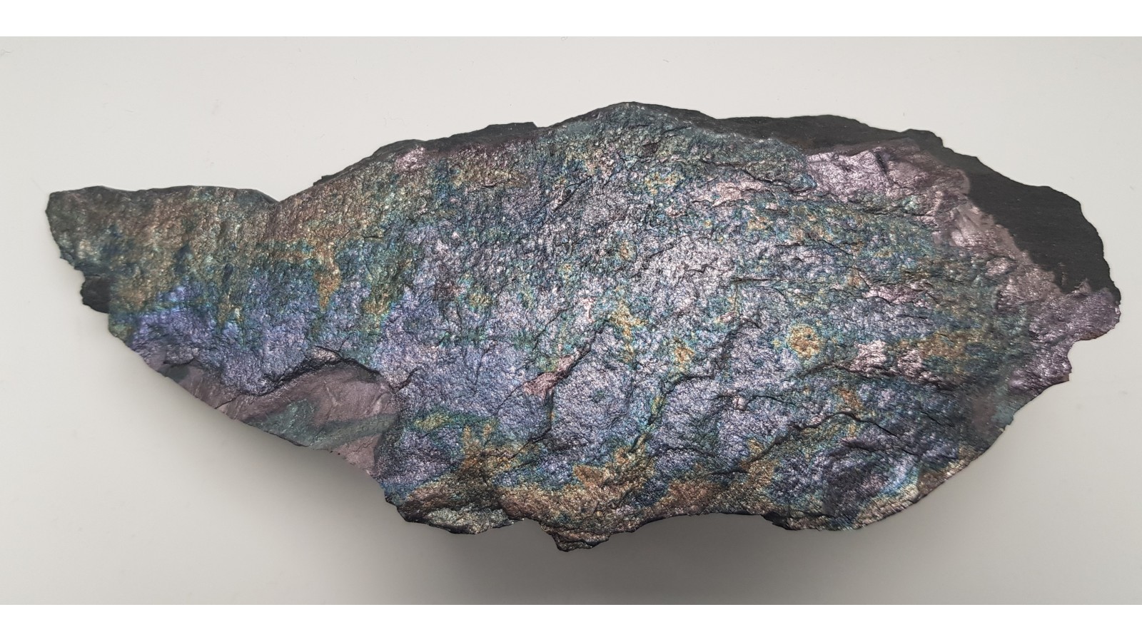 Bardzo estetyczny i zgrabny okaz bornitu na masywnym łupku miedzionośnym z KGHM. Cała powierzchnia pokryta pstrym bornitem. Polecam.