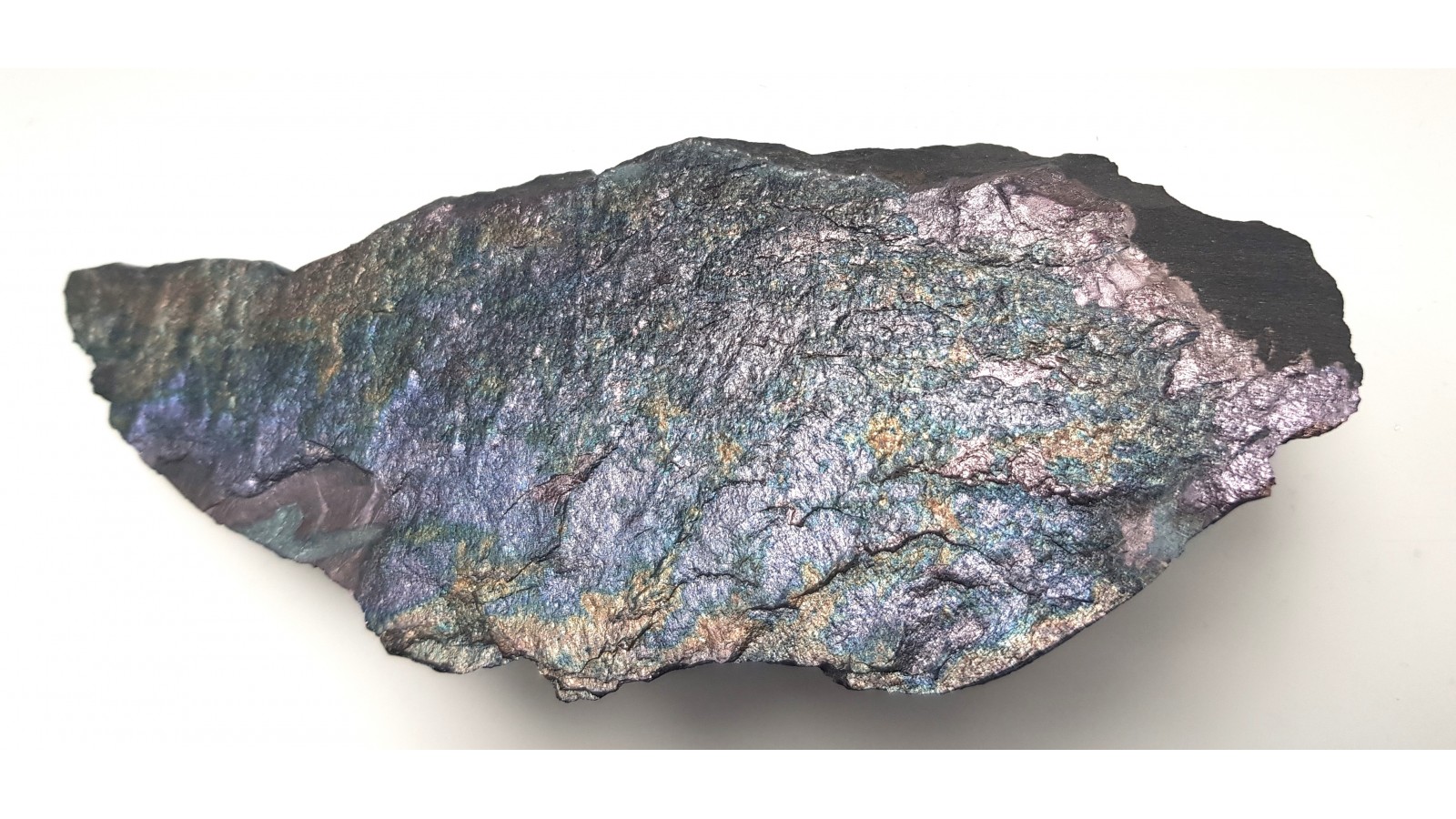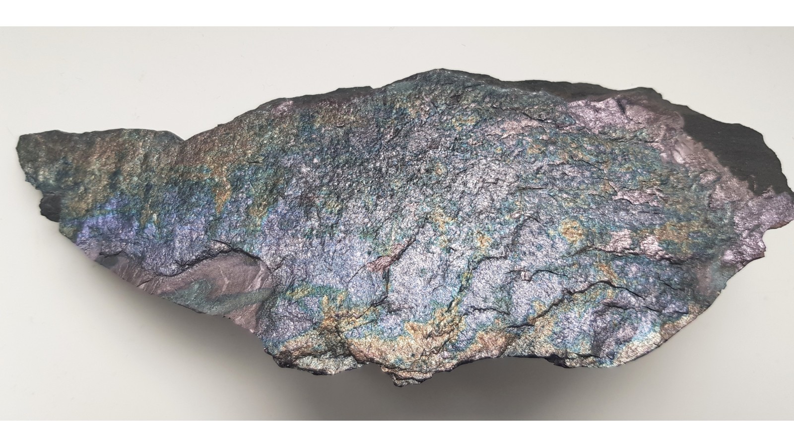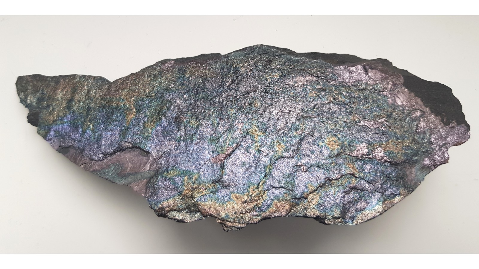 Bardzo estetyczny i zgrabny okaz bornitu na masywnym łupku miedzionośnym z KGHM. Cała powierzchnia pokryta pstrym bornitem. Polecam.