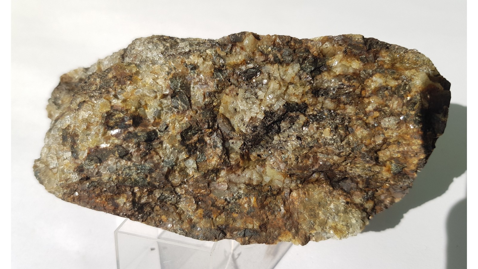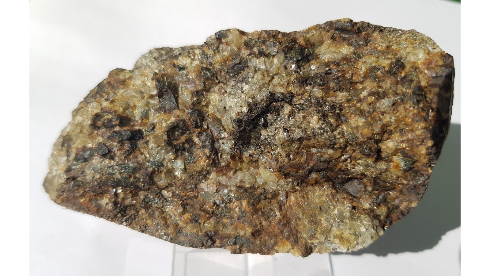 Okaz kordierytu, kryształy przeobrażone w znacznym stopniu w pinit. Widoczna ciemnozielona bądź brązowa barwa. Dużo kordierytu w skale, także foremne kryształy. Okaz z Gór Sowich, z aluwiów. Polecam.