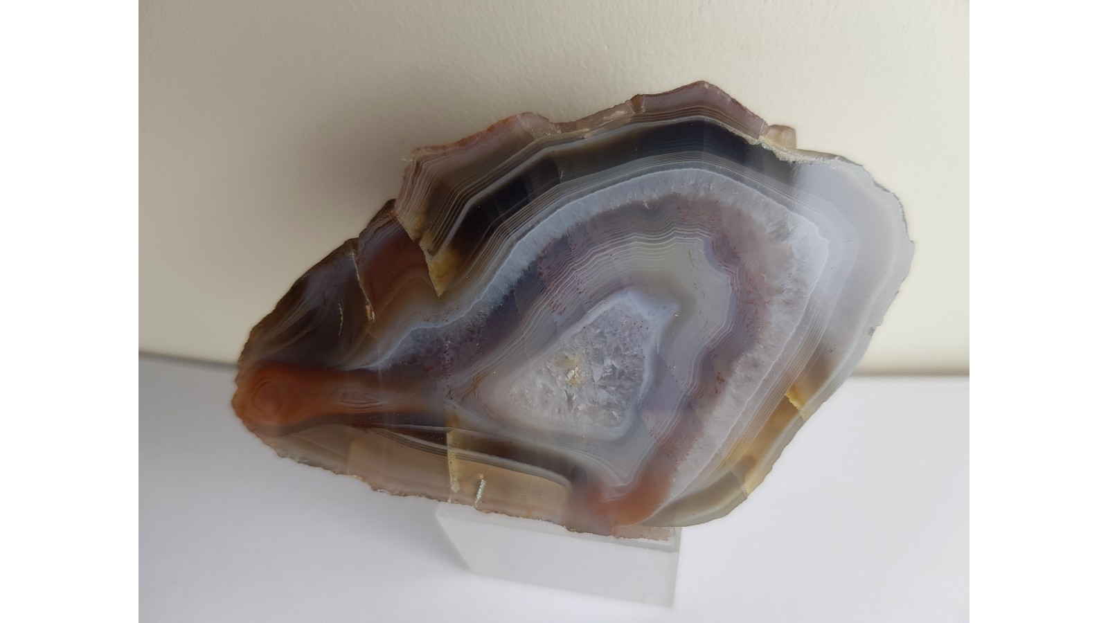 Agat z aluwiów rzeki Ścinawki. Piękny okaz z bardzo subtelnymi pierścieniami Lieseganga. Prawie niespękany. Strona przeciwna naturalna. Rzadka lokalizacja - żwirownia Bierkowice. Polecam.