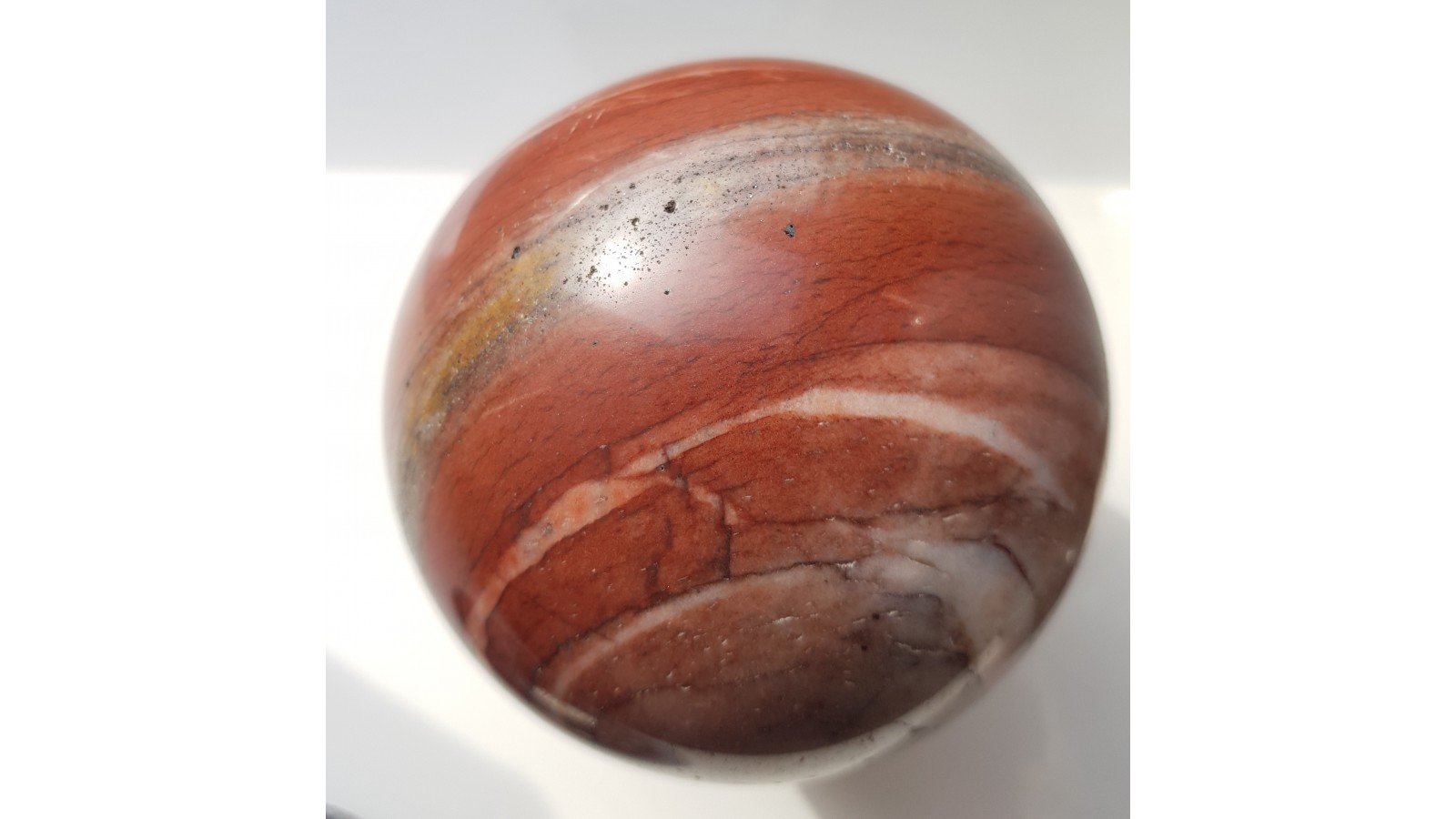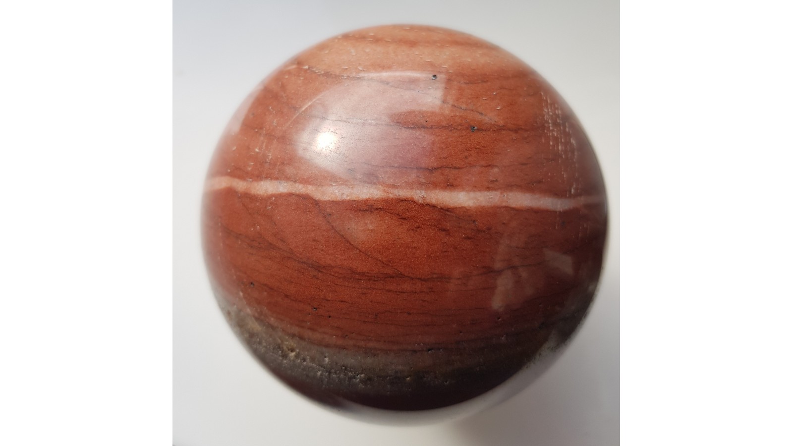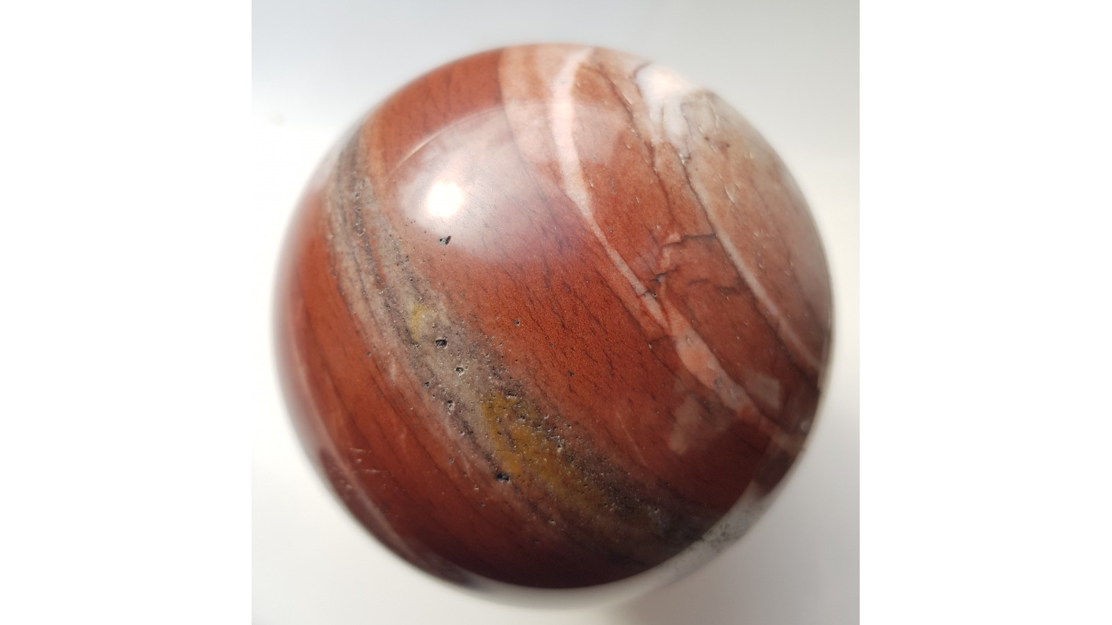 Piękna kula z dewońskiego ozdobnego kwarcytu z Głuchołaz. Bez spękań, delikatna iryzacja w dobrym oświetleniu. Piękna barwa i deseń. Polecam.