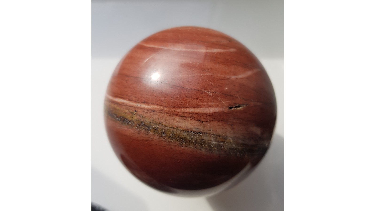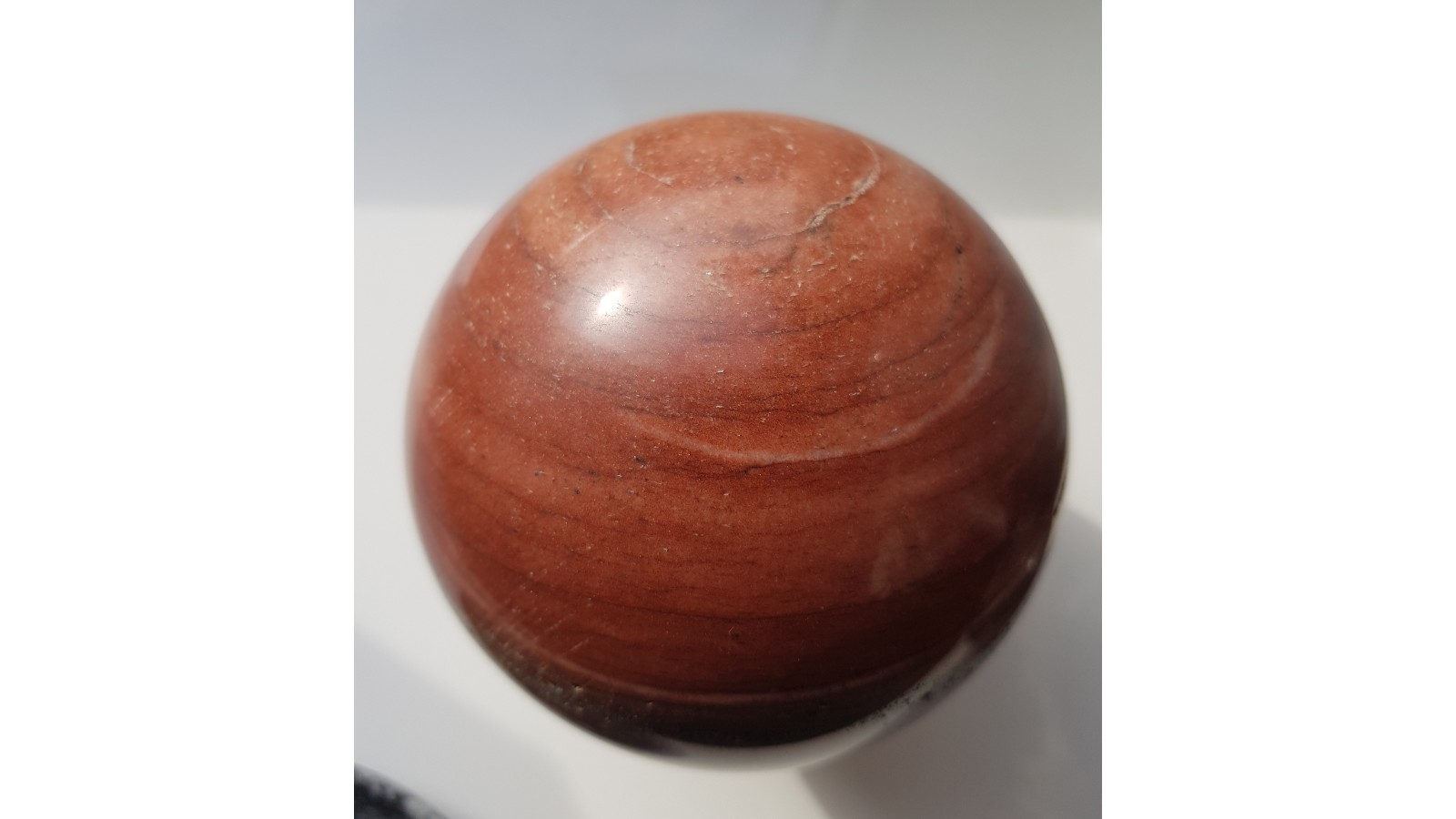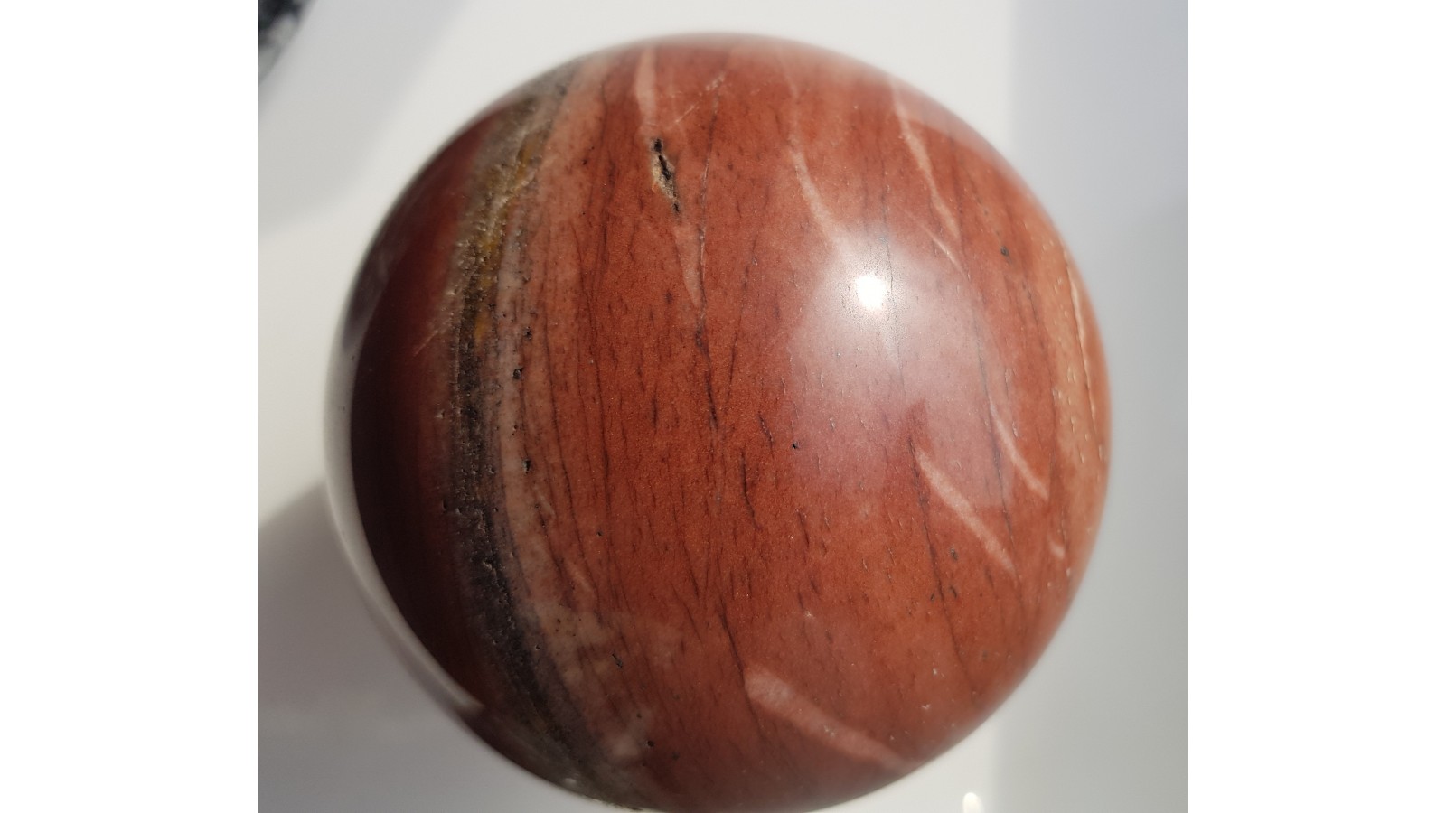 Piękna kula z dewońskiego ozdobnego kwarcytu z Głuchołaz. Bez spękań, delikatna iryzacja w dobrym oświetleniu. Piękna barwa i deseń. Polecam.