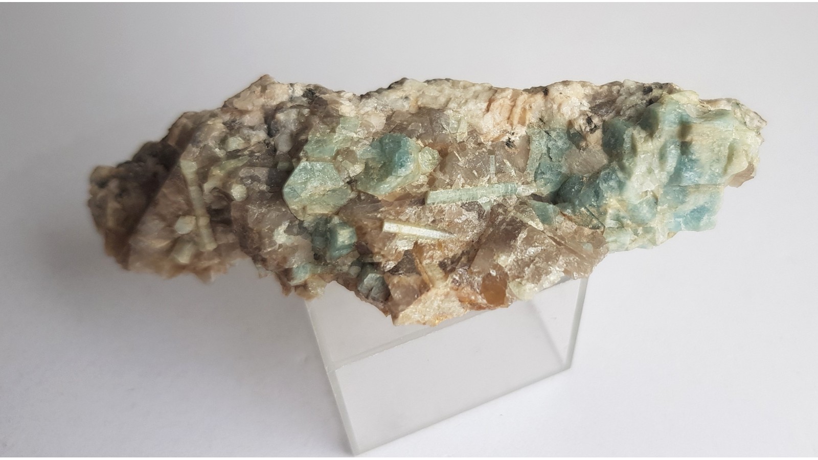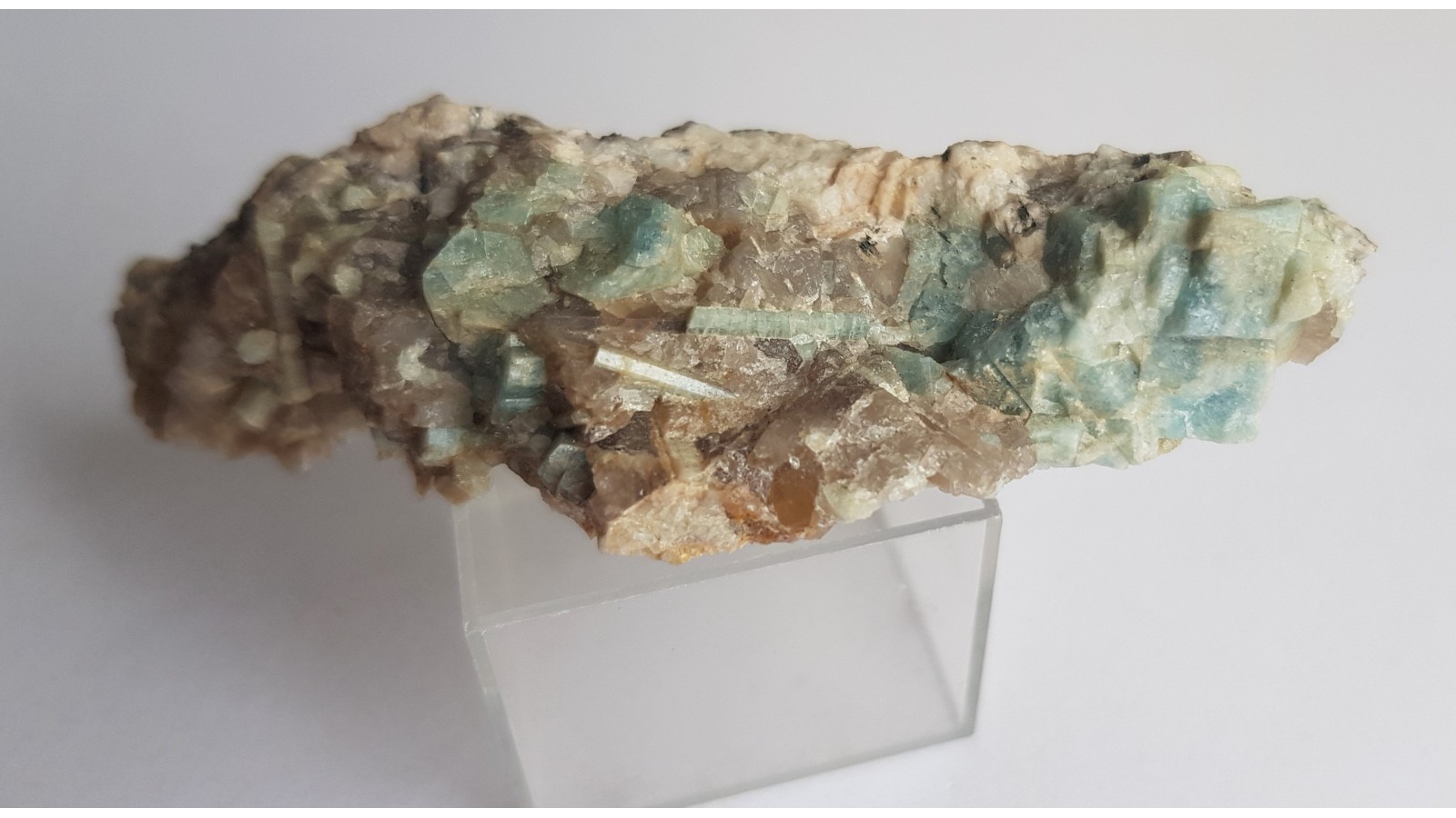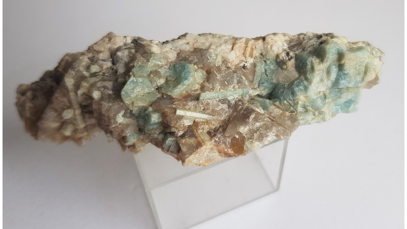 Kryształy akwamarynu w pegmatycie z okolic Szklarskiej Poręby. Raczej niewielki okaz, ale estetyczny, do kolekcji ok. Rzadkość mineralogiczna, okazy rzadko oferowane na rynku. Lokalizacja wyeksploatowana. Polecam.