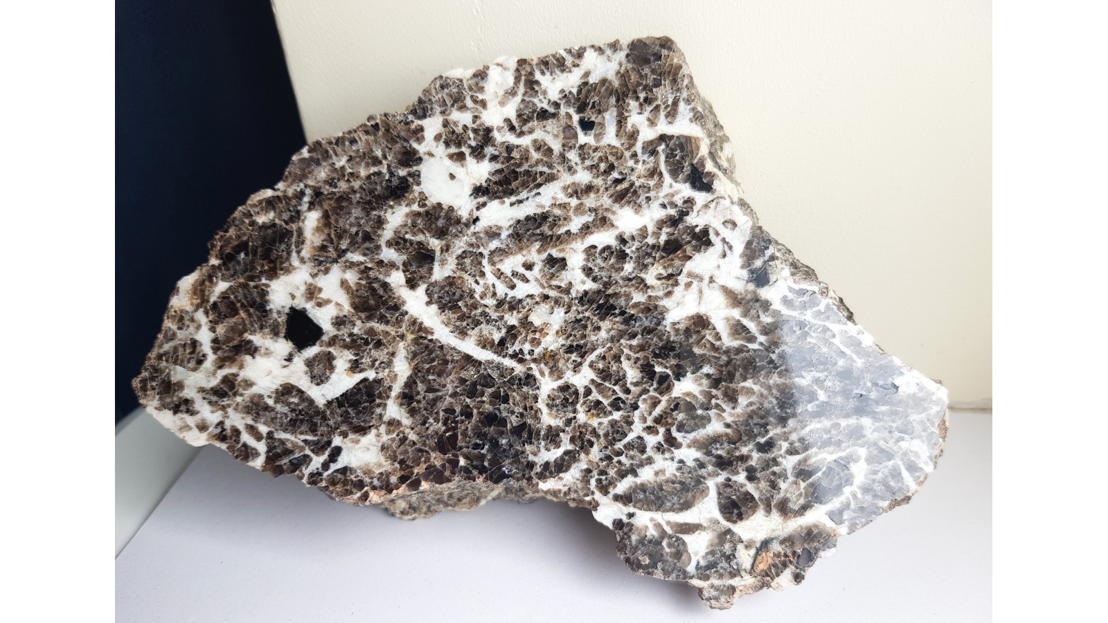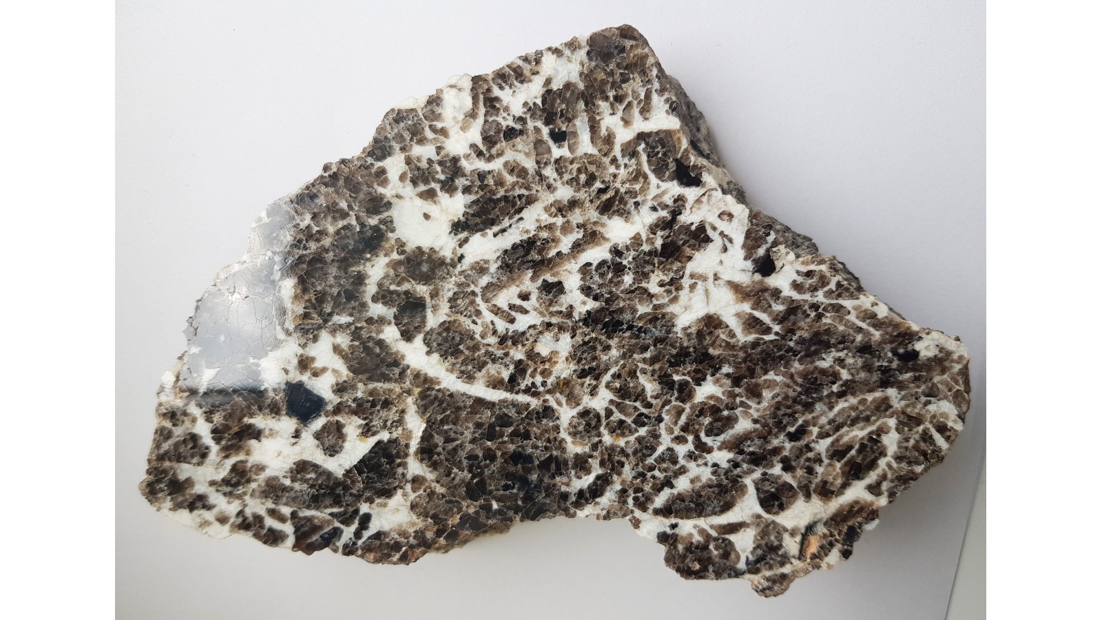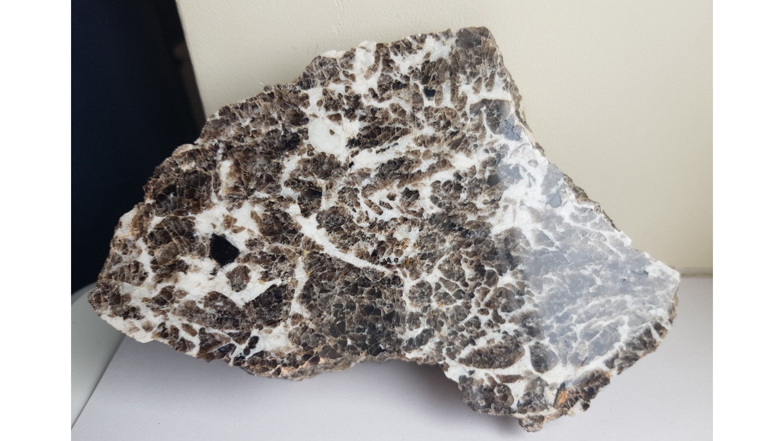 Piękny okaz polerowanego pegmatytu z Piławy Grn. ze strefy zbudowanej z przerostu białego skalenia potasowego i ciemnego kwarcu dymnego. Bardzo estetyczny okaz. Idealny poler, polecam.