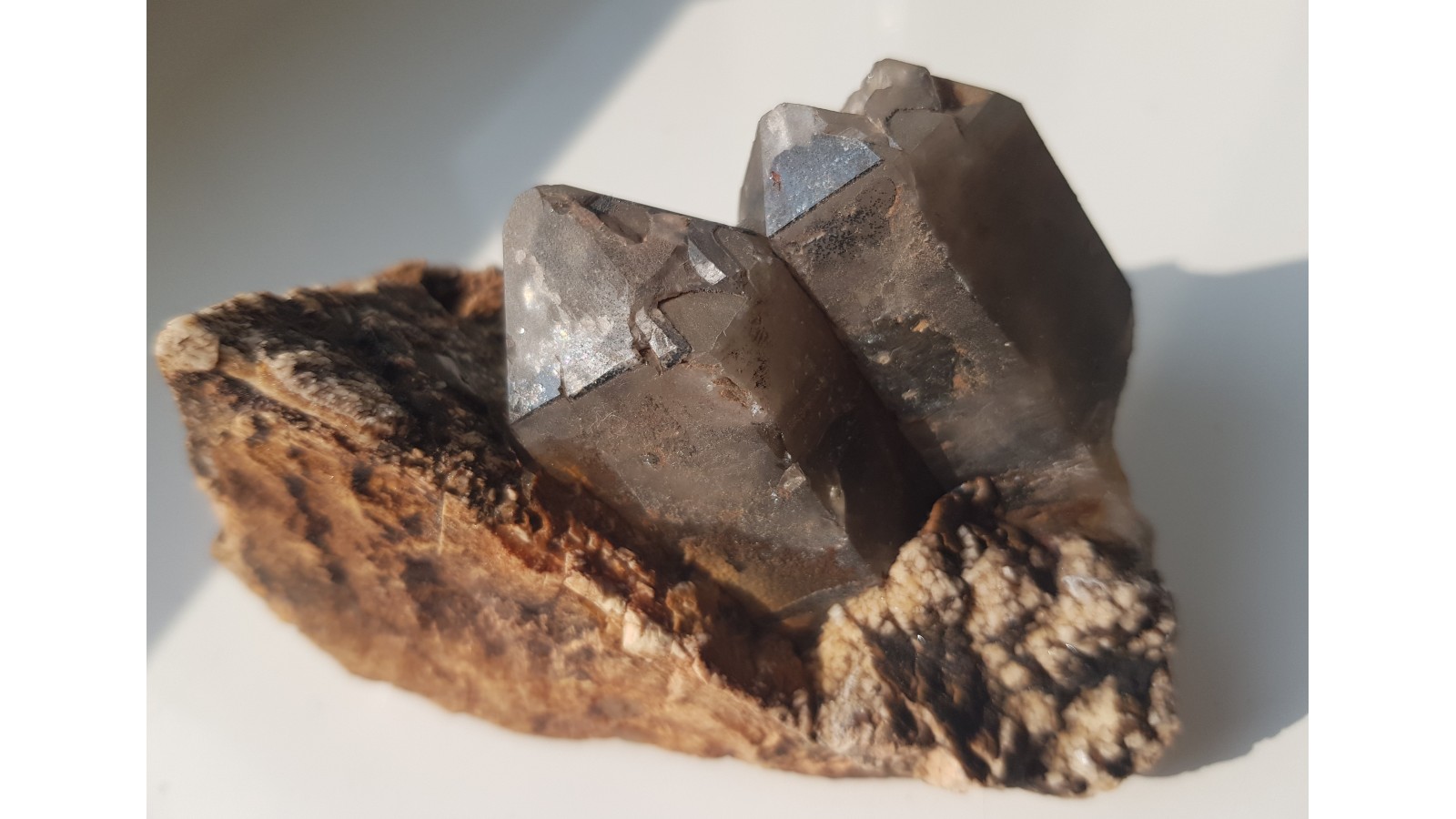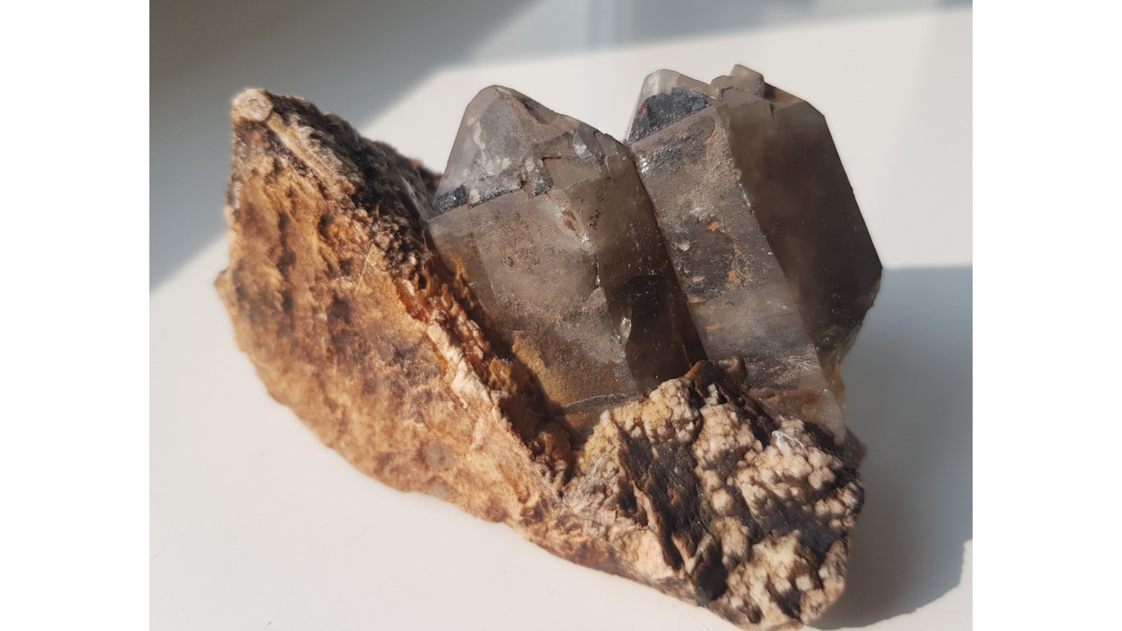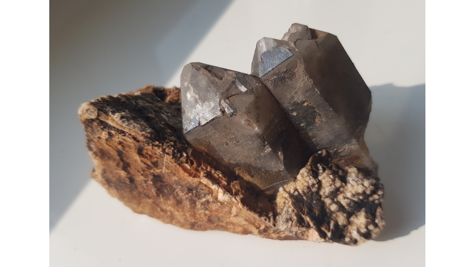 Nieuszkodzone, dwa kryształy dymne na skaleniu z pegmatytu z Cieplic k. Jeleniej Góry. Polecam.